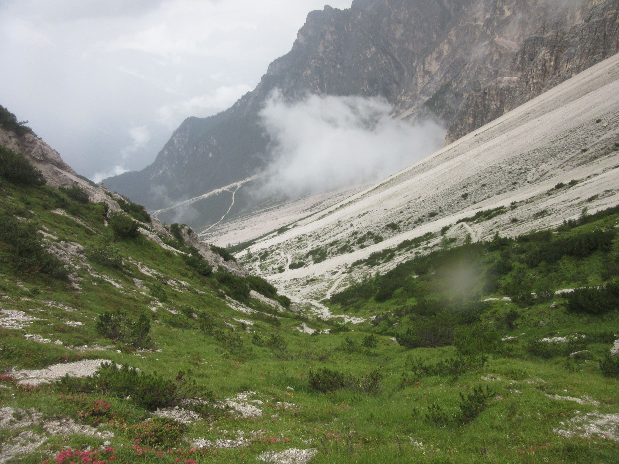 Dopo una buona colazione al Rifugio San Marco e quattro chiacchere, in questo magnifico e incredibile luogo, fatto di amicizia, affetto e simpatia ci avviamo nell’ultima tappa, sentiero n.226, che sale attraverso quello stretto canale che sale sulla forcella grande 2255 m, per offrirci uno spettacolo meraviglioso, davanti sulla sinistra il gruppo del Sorapis, sulla destra, il grandissimo monolite Torre Sabbioni, sì prosegue scendendo tra i mughi e rocce, tratti erbosi riempiono gli occhi, di quel verde speranza, accompagnato dall’azzurro del cielo, proseguiamo mentre il sentiero scende ripido , nella valle di San Vito dove i giochi d’acqua si fanno vedere in quel torrente tra cascate e solchi tracciati nel tempo, ed infine entrare nella riserva demaniale di Somadida uno spettacolo un sottobosco rigoglioso e ben tenuto da Madre Natura, fino a raggiungere Ponte degli Alberi e prendere la strada Forestale attraversa il bosco di Socento, giunti al bivio con l’altra rotabile si mantiene la destra per un ultima salita della Valle Pian della Sera e poi scendere al Rifugio La Primula.