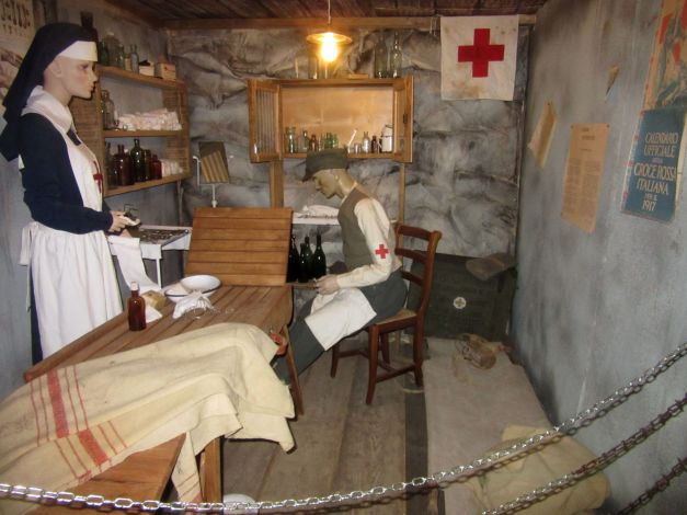 Il percorso didattico permanente può non partire laddove è cominciato tutto: l’attentato di Sarajevo, ricordato con una piccola vetrina in cui è esposta una pistola Browning FN 191O identica a quella utilizzata per l’assassinio dell’arciduca d’Austria. Il 28 giugno 1914. Manifesti e mappe possono aiutare ad inquadrare la situazione italiana ed europea ma in questa sezione introduttiva si vuole evidenziare anche l’alto tasso di arruolamento dell’Italia,uno dei più alti al mondo, la partecipazione femminile e gli obbiettivi strategici italiani ad inizio conflitto. Il tributo del Territorio alla guerra è ricordato da una parete che riporta gli attestati con le motivazioni per le decorazioni al valor militare dei figli di Montecchio Maggiore. Parte fondamentale del percorso è indubbiamente la ricostruzione della trincea sul Dente Italiano del Monte Pasubio. Realizzata con l’aiuto dei Ricostruttori Novalesi, la trincea si estende su oltre 120 metri quadri e intende rappresentare alcune delle caratteristiche tipiche di una vera trincea; dalla larghezza del percorso, circa 75 cm, fino agli ambienti allestiti, complessiva mente nove: la polveriera,la terra di nessuno, la piazzola da mitragliatrice, la baracca truppa,l’area rancio, la latrina, l’ufficio comando, l’infermeria,l’altare da campo. L’intera ricostruzione è cosparsa di cimeli originali e presenta dieci manichini in uniforme. Per rendere il percorso ancora più suggestivo sono stati predisposti effetti ottici,atti a ricreare un’atmosfera notturna e lunare, e acustici, con l’ululare del vento e i fragori della battaglia. Usciti dalla trincea il percorso prosegue con l’esposizione delle uniformi alleate durante la Grande Guerra. E’ un confronto interessante per il visitatore, che anche visivamente può rendersi conto delle differenze di equipaggiamenti tra l’inizio del conflitto ed il suo prosieguo; è infatti evidente ad esempio,come l’uniforme francese del 1914, priva di elmetto e senza nessuna accortezza per il mimetismo, differisca da quella statunitense del 1918. Due vetrine illustrano gli equipaggiamenti alleati ed italiani attraverso decine dì cimeli,armamenti e documenti,mentre alle pareti sono affissi espositori con strumenti da lavoro dei soldati, mappe e manifesti d’epoca oltre che alcune celebri copertine della Domenica del Corriere di· segnate dall’arzignanese Achille Beltrame. A seguire, la sezione dedicata agli Imperi Centralì , con maggiore rilevanza per gli equipaggia· menti austro ungarici. La parte conclusiva del percorso dedicato alla Grande Guerra abbraccia due temi: il primo quello delle perdite, con cimeli e documenti di grande Interesse emotivo. Il secondo verte della figura del tenente prima,e primo seniore poi Ferruccio Bonapace , unica Medaglia d’oro al Valor Militare di Montecchio Maggiore. La sua vicenda permette di avere un ponte ideale nel percorso museale, collegando la Grande Guerra, al Ventennio fascista Seconda Guerra Mondiale. Figura di indubbio interesse storico fu uno dei 2500 legionari fiumani nonché amico del celebre poeta, Gabriele D’Annunzio.