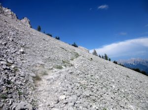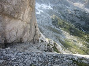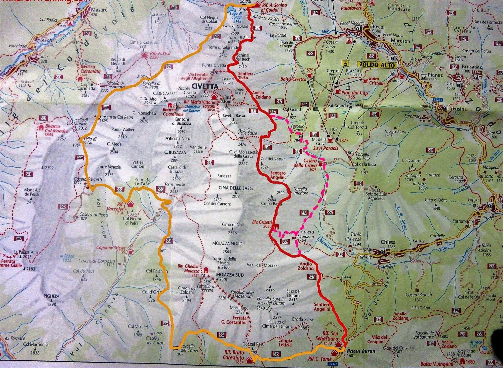 Questa variante che propongo presenta un abbassamento di quota interessante , ma elimina la parte più difficoltosa posizionata tra il Bivacco Grisetti e l’imbocco del Sentiero Tivan , abbassandosi fino a 1627 della Casèra della Grava per poi rientrare di nuovo nel 557 del Tivan all’altezza della funicolare che trasporta i materiali e viveri sul Rifugio Maria Vittoria Torriani posizionato a quota 3050 m poco lontano dalla Cima del Civetta 3220 m.