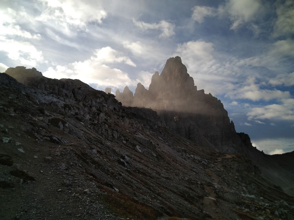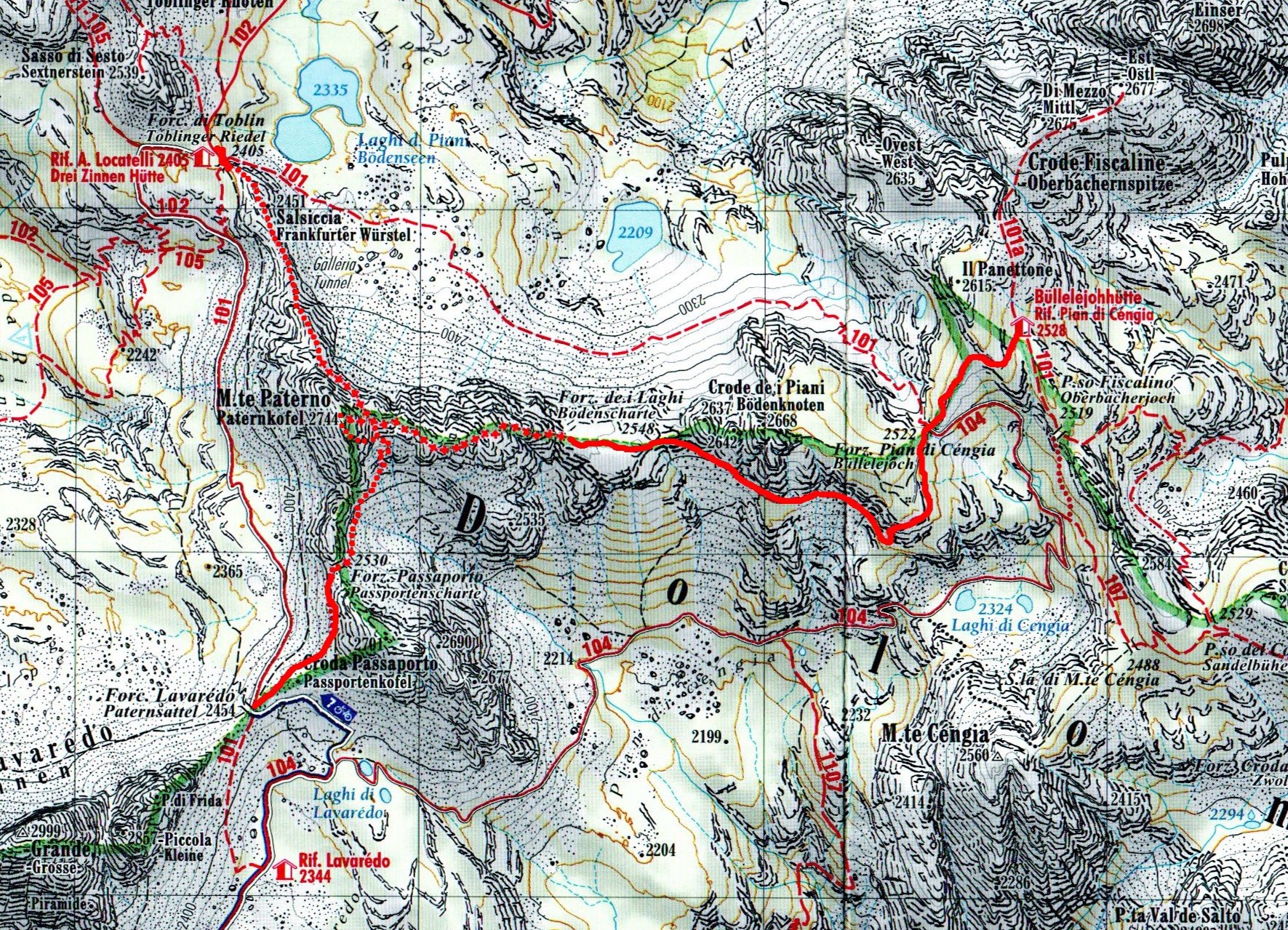 Percorso molto bello , panoramico e in certi versi impegnativo essendo lo stesso attrezzato , ho preferito dormire al Rifugio Pian di Cengia 2528 m , raggiungendo poi prima la forcella Pian di Cengia e poi attraverso il sentiero 101 il Rifugio Locatelli 2405 m, dove si imboccherà la via per salire al Paterno , un primo tratto semplice senza corde , dove si percorre una galleria del periodo bellico 1915-18, per poi attraverso una via attrezzata salire sulla vetta , esiste anche la possibilità di salire anche dalla Forcella Lavaredo 2454 m , ma non è altrettanto importante e panoramico se non che nel primo tratto prima di entrare nel lato interno del vallone che sale nella forcella del camoscio. Raggiunta la Forcella del Camoscio, si risale un ultimo tratto di corde che porta nel pianoro detritico del Paterno 2744 m , finalmente la croce nella sua grandezza, si prosegue scendendo fino allla Forcella dei camosci per poi attraverso il sentiero delle forcelle porta direttamente alla forcella pian di Cengia, attraverso altri spezzoni di via attrezzata con passaggi interessanti e panoramici verso l’alpe dei Piani, questo itinerario molto importante sotto il profilo storico dove le caverne e fortificazioni furono molte vista la sua importanza strategica.