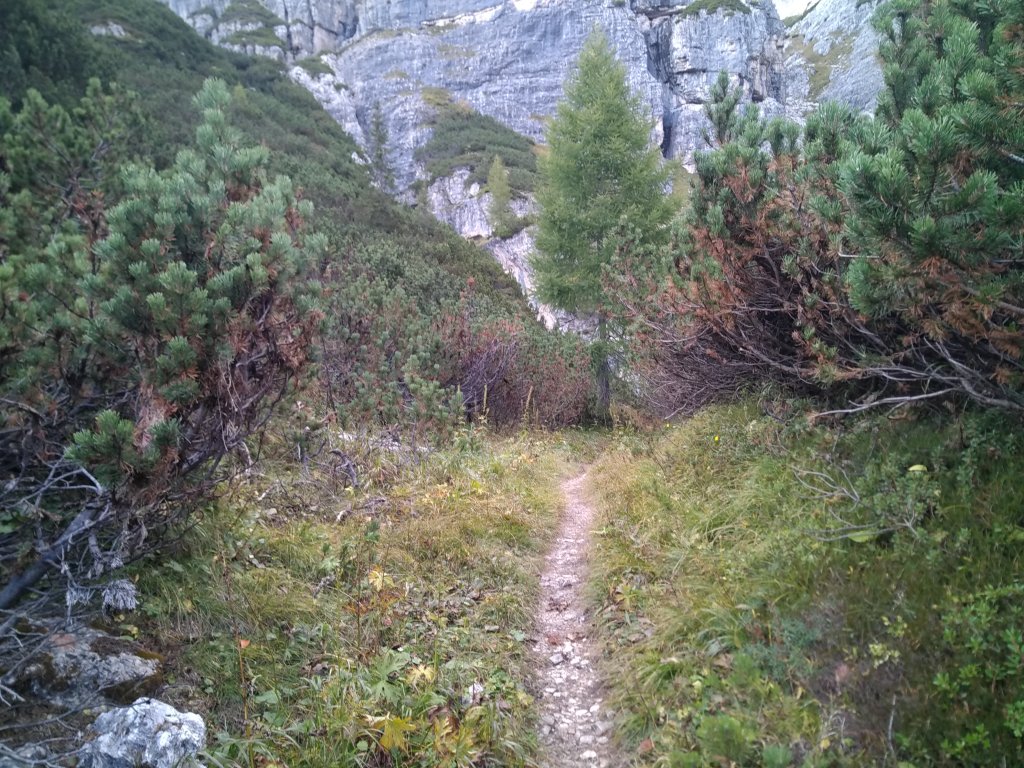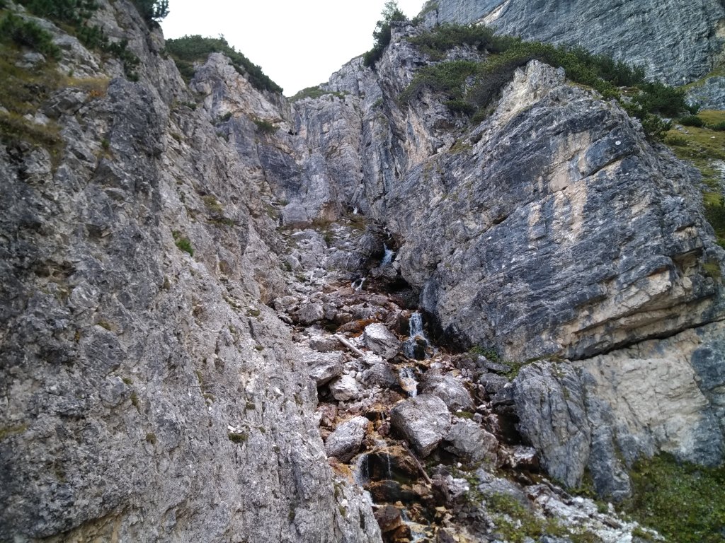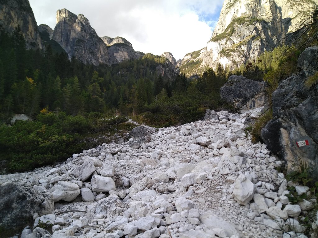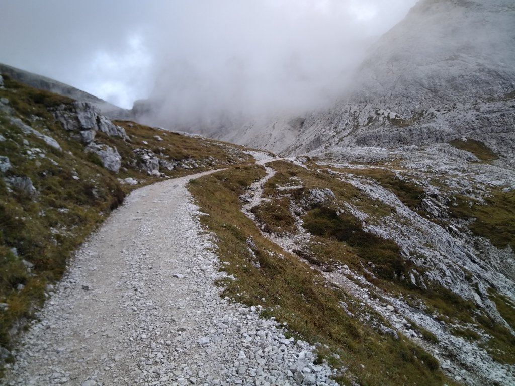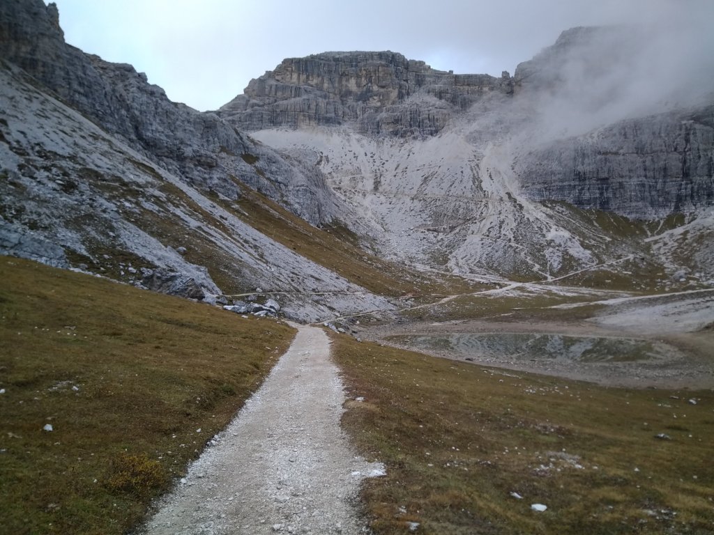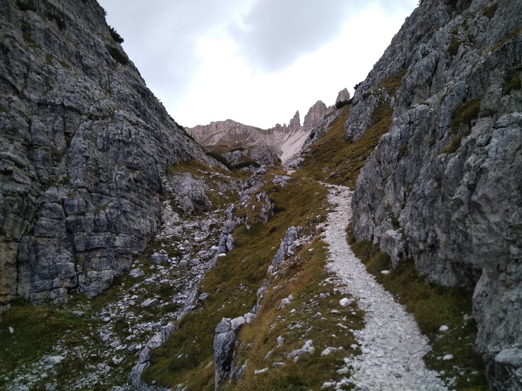 Senz’altro uno dei più belli ed impegnativi sentieri, come del resto quasi tutti quelli che salgono dal versante Veneto verso le Tre Cime , che ricordo sono nel confine tra il Veneto ed il Trentino Alto Adige . Imboccato il cartello che segna la val Marzon , si sale ancora fino a trovare un area picnic , io ho lasciato l’auto li anche se il sentiero era ancora lontano , ma si può proseguire in auto ancora qualche km fino a raggiungere un piccolo posteggio a Cason della Crosera e il divieto di transito, da li parte il sentiero sulla destra , mentre a sinistra si può scorgere il 1104 quello che sale sul rifugio Auronzo 2333 m e le Tre Cima di Lavaredo, si imbocca il sentiero 1107 a quota 1250 m circa , si inizia a salire anche se con poca pendenza a fianco al torrente e su qualche ghiaione detritico causato dagli eventi atmosferici, raggiunto il Cason della cengia Bassa a quota 1602 m, il sentiero aumente notevolmente la pendenza, e percorre un canale molto stretto che sale tra le rocce e sassi detritici , si prosegue ancora con buona pendenza questo tratto e molto bello ed appagante fino a raggiungere il bivio con il 104 che parte dal Rifugio Lavaredo 2344 m ,passa sotto la Forcella Lavaredo e transita sotto la Croda Passaporto fino a raggiungere il Rifugio Pian di Cengia 2528 m. Il sentiero riprende con poca pendenza zigzagando su un terreno molto piacevole superando i laghi di cengia a quota 2324 m, per poi con un ultimo strappo attraverso la forcella Pian di Cengia , oppure la direttissima raggiungere il fantastico rifugio Pian di Cengia 2528 m , presentando un nuovo incredibile scenario che non e senz’altro descrivibile a parole. Il rifugio è sul confine tra il Veneto e il Trentino Alto Adige, è a gestione famigliare , dietroal rifugio si scorge la cima dell’Uno e la Cima Fiscalina , con il suo strapiombo verso il rifugio Fondovalle, e sui sentieri della Val Fiscalina e Valle Sassovecchio che salgono rispettivamente una dal Rifugio Comici 2224 m e l’altra direttamente al Rifugio Locatelli 2405 m.