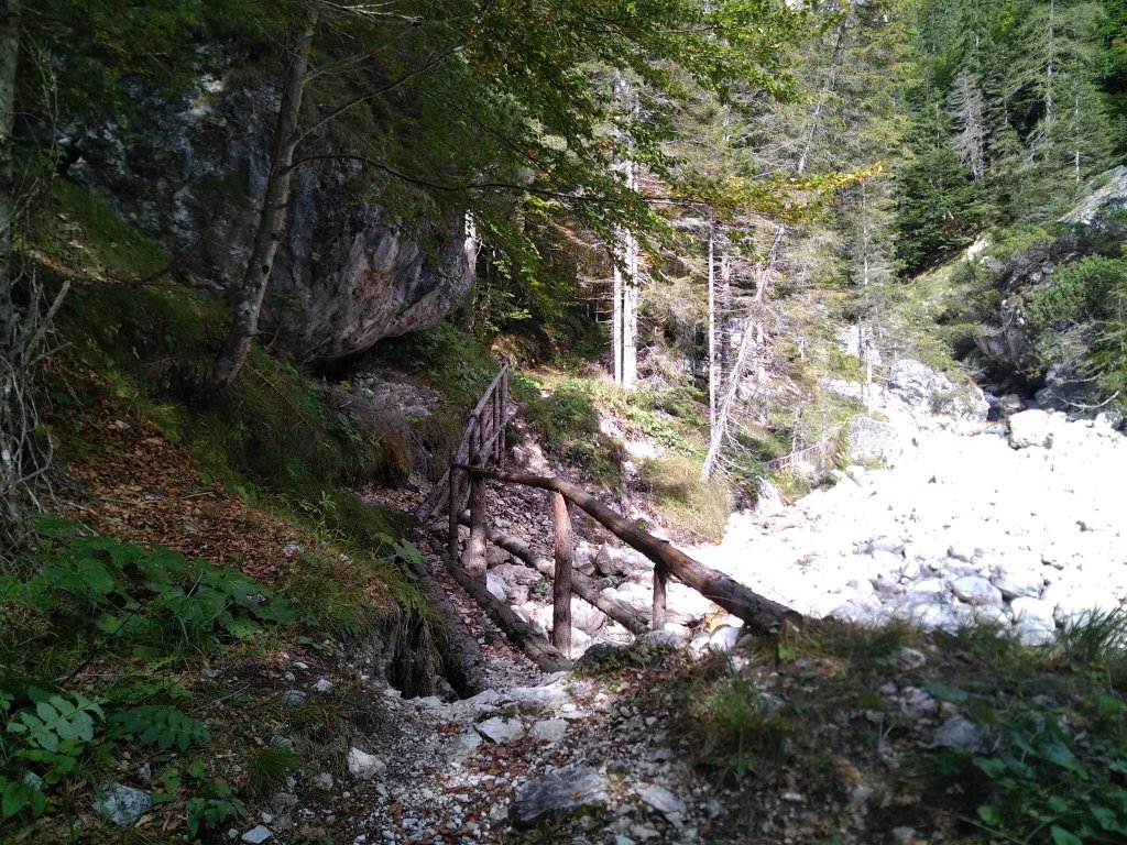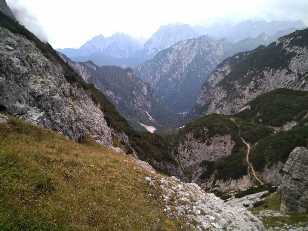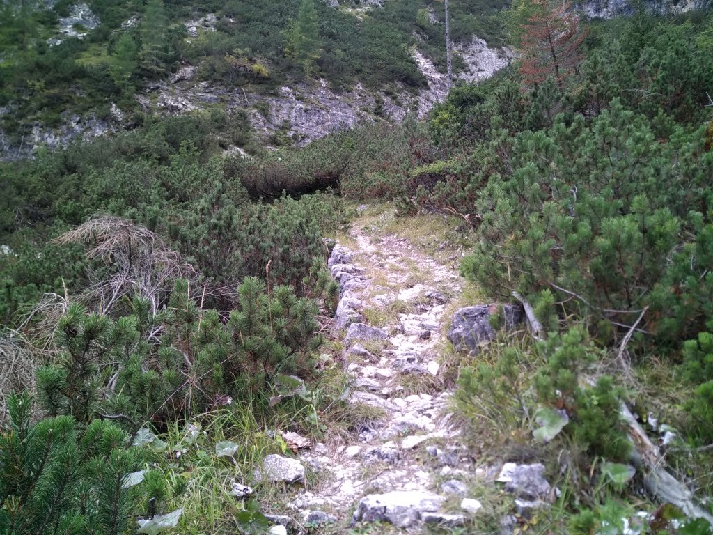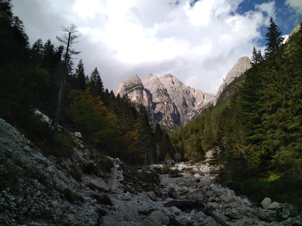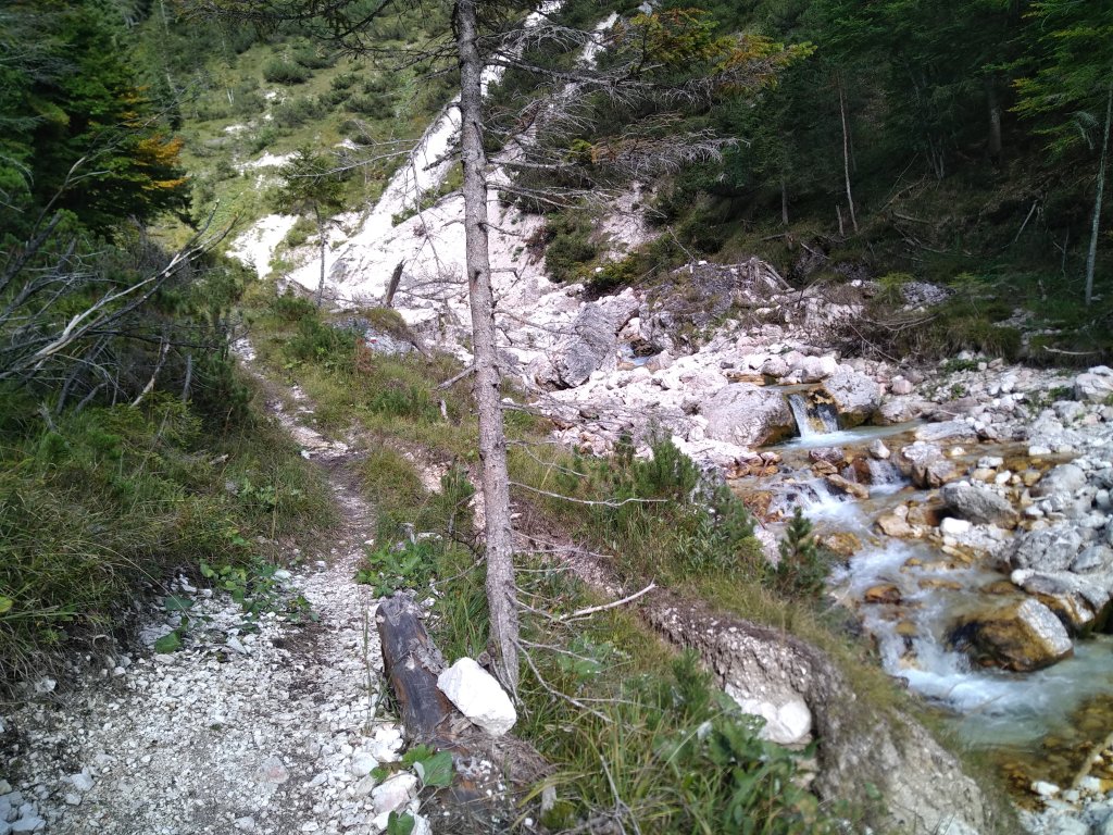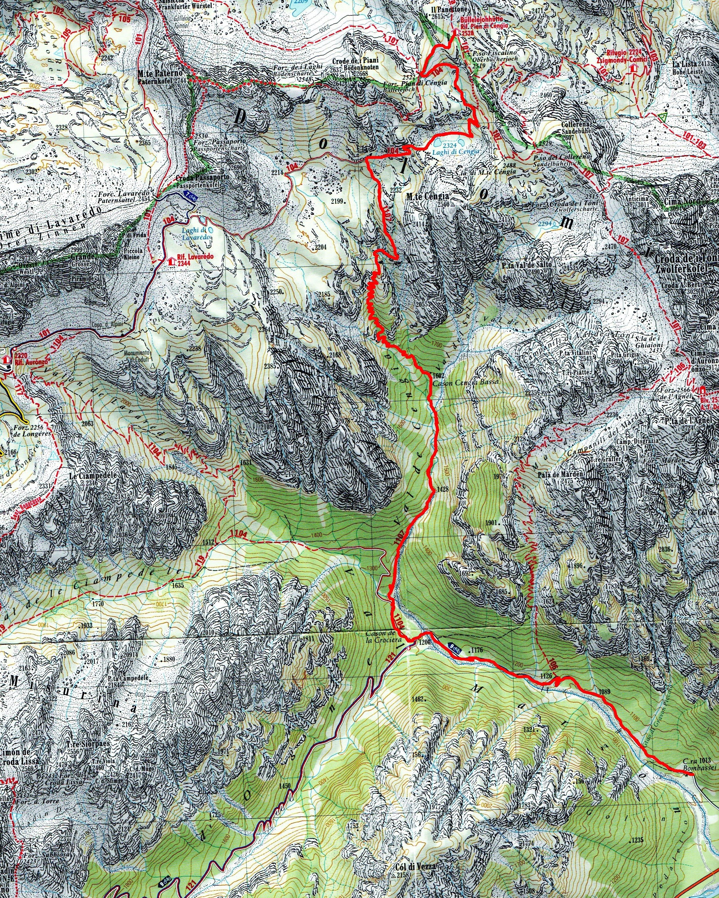 Senz’altro uno dei più belli ed impegnativi sentieri, come del resto quasi tutti quelli che salgono dal versante Veneto verso le Tre Cime , che ricordo sono nel confine tra il Veneto ed il Trentino Alto Adige . Imboccato il cartello che segna la val Marzon , si sale ancora fino a trovare un area picnic , io ho lasciato l’auto li anche se il sentiero era ancora lontano , ma si può proseguire in auto ancora qualche km fino a raggiungere un piccolo posteggio a Cason della Crosera e il divieto di transito, da li parte il sentiero sulla destra , mentre a sinistra si può scorgere il 1104 quello che sale sul rifugio Auronzo 2333 m e le Tre Cima di Lavaredo, si imbocca il sentiero 1107 a quota 1250 m circa , si inizia a salire anche se con poca pendenza a fianco al torrente e su qualche ghiaione detritico causato dagli eventi atmosferici, raggiunto il Cason della cengia Bassa a quota 1602 m, il sentiero aumente notevolmente la pendenza, e percorre un canale molto stretto che sale tra le rocce e sassi detritici , si prosegue ancora con buona pendenza questo tratto e molto bello ed appagante fino a raggiungere il bivio con il 104 che parte dal Rifugio Lavaredo 2344 m ,passa sotto la Forcella Lavaredo e transita sotto la Croda Passaporto fino a raggiungere il Rifugio Pian di Cengia 2528 m. Il sentiero riprende con poca pendenza zigzagando su un terreno molto piacevole superando i laghi di cengia a quota 2324 m, per poi con un ultimo strappo attraverso la forcella Pian di Cengia , oppure la direttissima raggiungere il fantastico rifugio Pian di Cengia 2528 m , presentando un nuovo incredibile scenario che non e senz’altro descrivibile a parole. Il rifugio è sul confine tra il Veneto e il Trentino Alto Adige, è a gestione famigliare , dietroal rifugio si scorge la cima dell’Uno e la Cima Fiscalina , con il suo strapiombo verso il rifugio Fondovalle, e sui sentieri della Val Fiscalina e Valle Sassovecchio che salgono rispettivamente una dal Rifugio Comici 2224 m e l’altra direttamente al Rifugio Locatelli 2405 m.