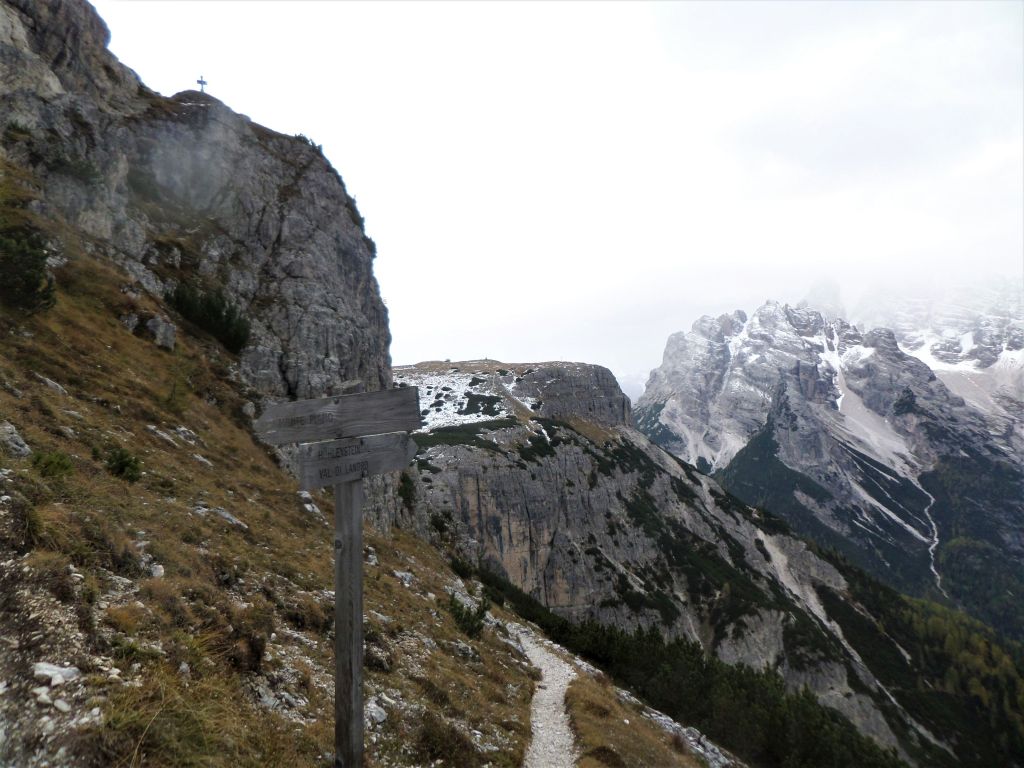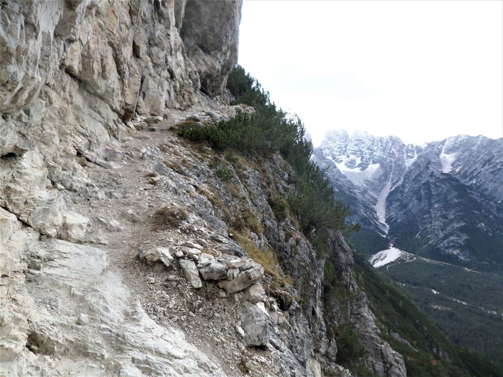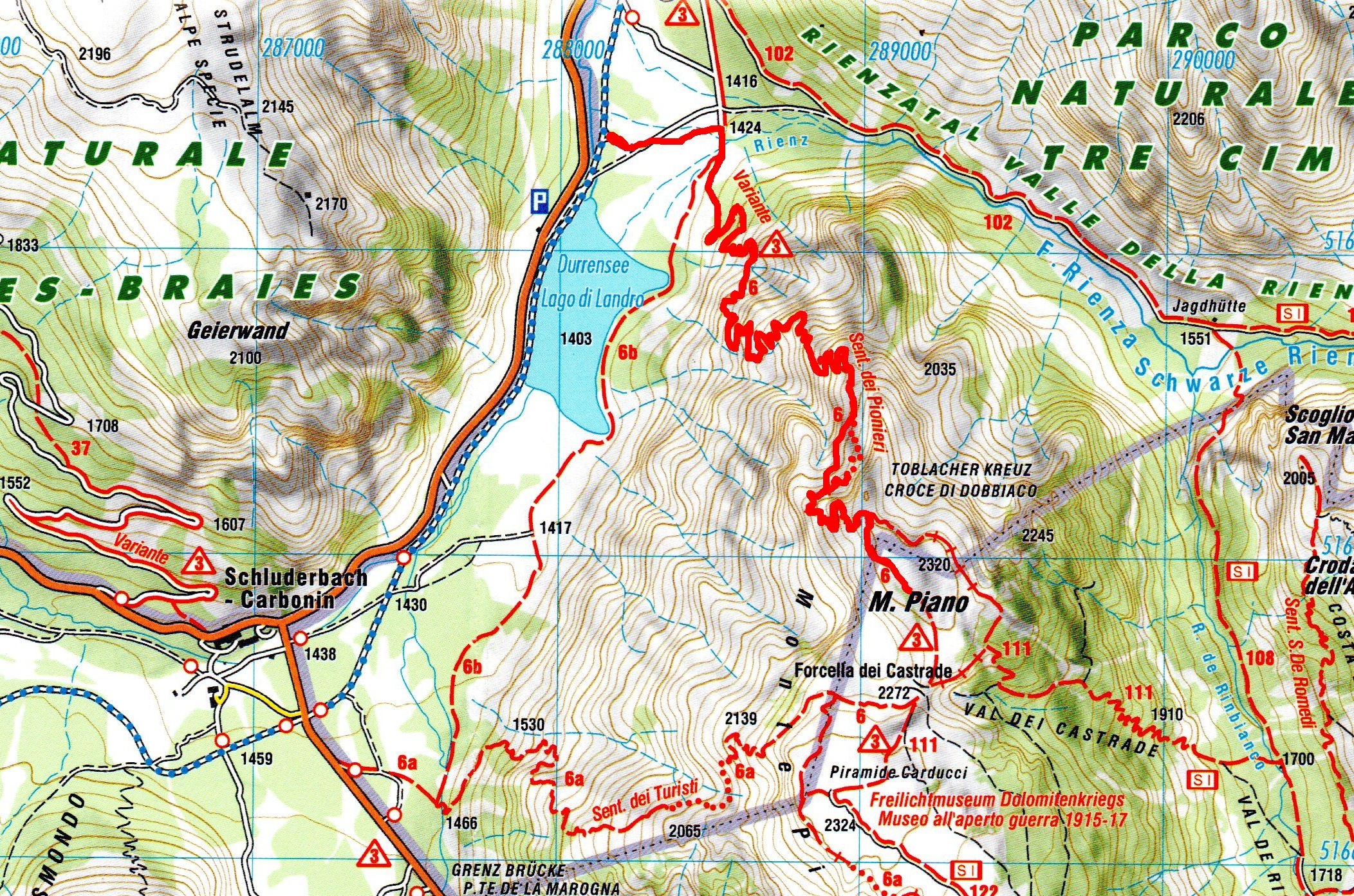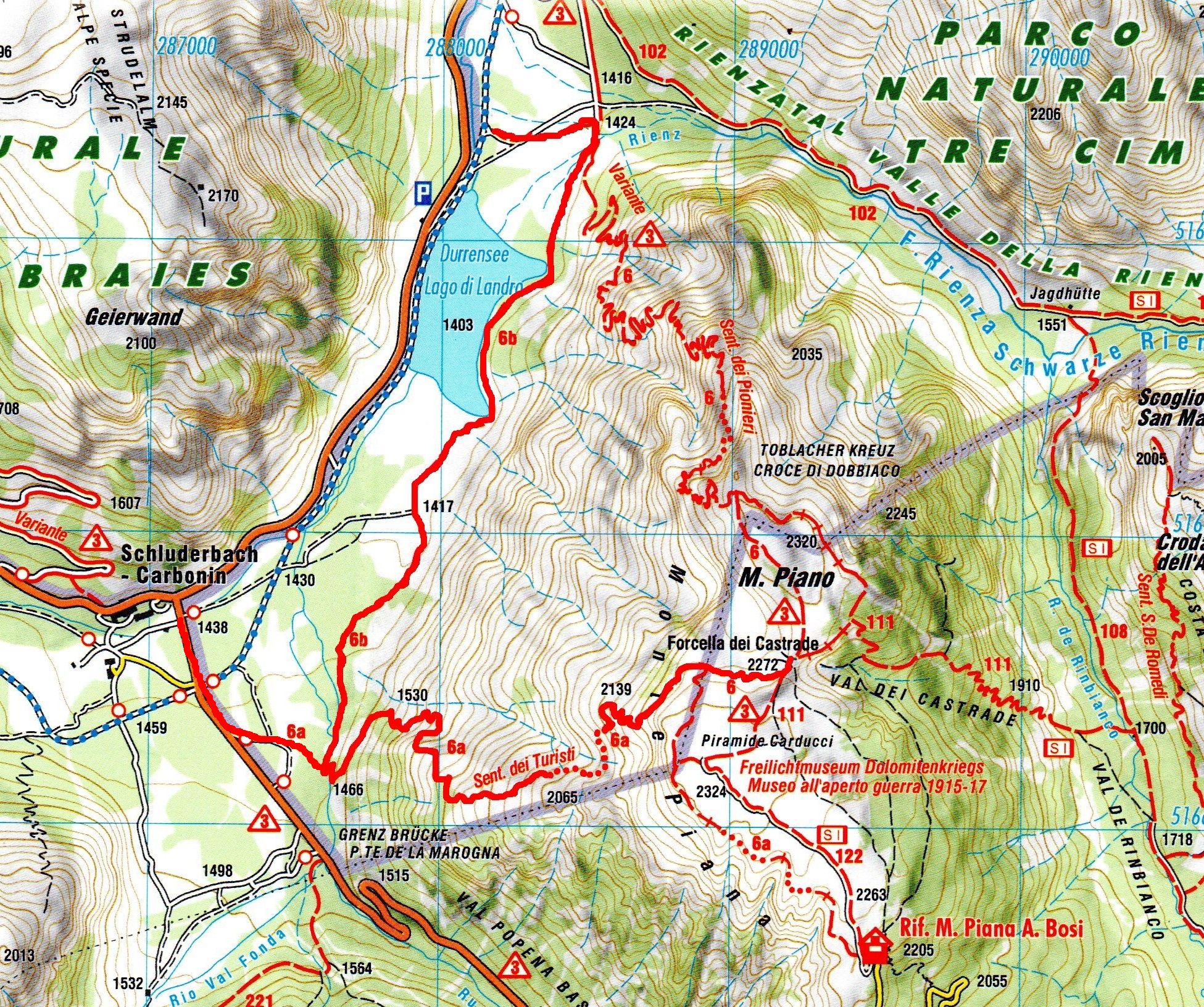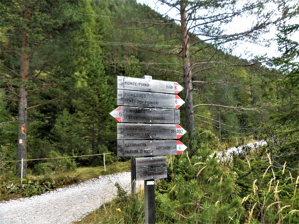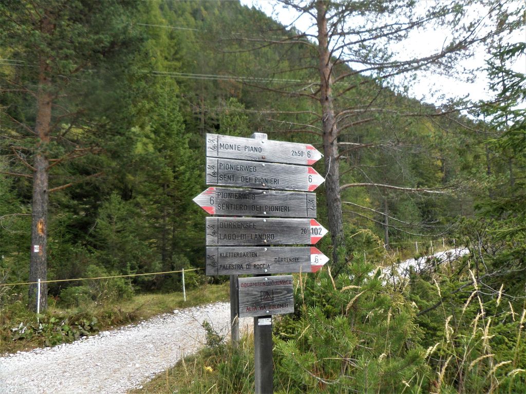Una doverosa considerazione dev’essere fatta , si chiama sentiero dei Turisti ma non per questo si può prendere sottogamba, è un sentiero di tutto rispetto. Si parte dal lago di Landro 1406 m, in piena vista della Val della Rienza e Tre Cime, si sale dapprima sul fondovalle ghiaioso, letto fluviale, verso il ponte della Marogna dove inizierà la salita, molto panoraamica come del resto la via dei pionieri si sale su un crinale quasi a strapiombo nella valle di landro, la salita iniziale in mezzo a un boschetto con mughi , dove il sentiero si snoda e poi zizzagando sale fino a raggiungere un tratto esposto a slavine , su ghiaino fino anche abbastanza stabile ed alcuni passaggi con corde ma poco difficili per poi entrare nella parte più bella priva di vegetazione e con scalini in legno fisaati nella roccia e passaggi stretti sotto la cima del monte Piana 2324 m, si prosegue nel traverso fino a raggiungere la forcella dei Castrati 2272 m, situata tra le quote di Monte Piano e Monte Piana .