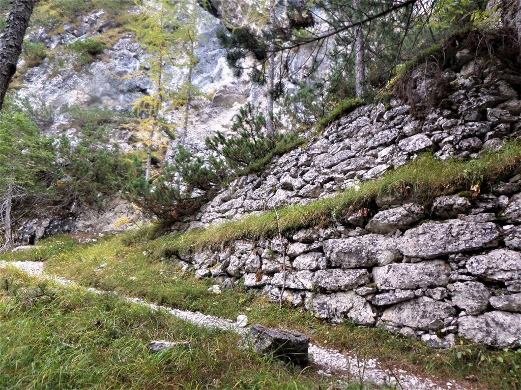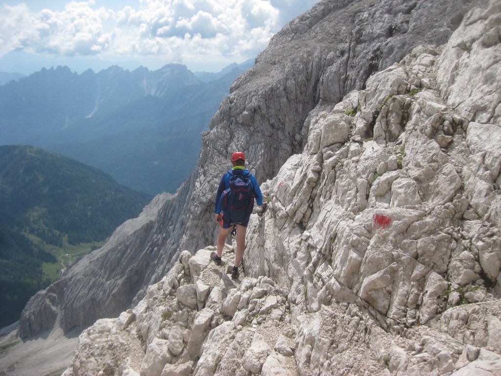 Questo sentiero è forse il più bello e panoramico che porta sul monte Piana 2324 m passando per il monte Piano 2306 m forse è uno dei piu antichi basti pensare che la ferrata sulla parte alta è stata ideata e costruita nel 1916 per poi essere risistemata nel 1980 , inizialmente piano salendo sul letto del torrente per poi attraverso le prime tracce di mulattiera sale zigzagando aumentandone poi la ripidità e presentando alcuni tratti con corda in acciaio fattibile anche senza imbrago, il panorama verso la valle e molto bello ed ampio su buona parte della sua estensione , man mano che si sale si restringe leggermente fino ad incontrare un punto poco lontano dalle creste in cui si trova un piccolo cimitero austriaco , e dove si possono scorgere sulla sinistra verso la val della Rienza , continuando poi a salire si raggiunge un tratto di via ferrata in cui è indispensabile l’imbrago ma è raggirabile sulla destra, per poi ricongiungersi quasi sulla vetta dove nel versante della Valle si scorge la centrale elettrica e l’arrivo della teleferica che parte dalla Val di Landro, numerose le postazioni ancora intatte prima di raggiungere la vetta del monte Piano , dove si trova anche la Croce di Dobbiaco.
