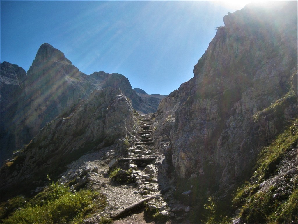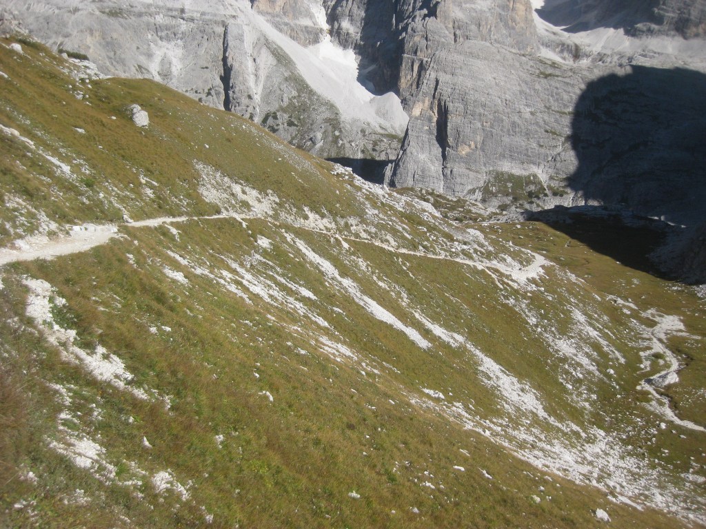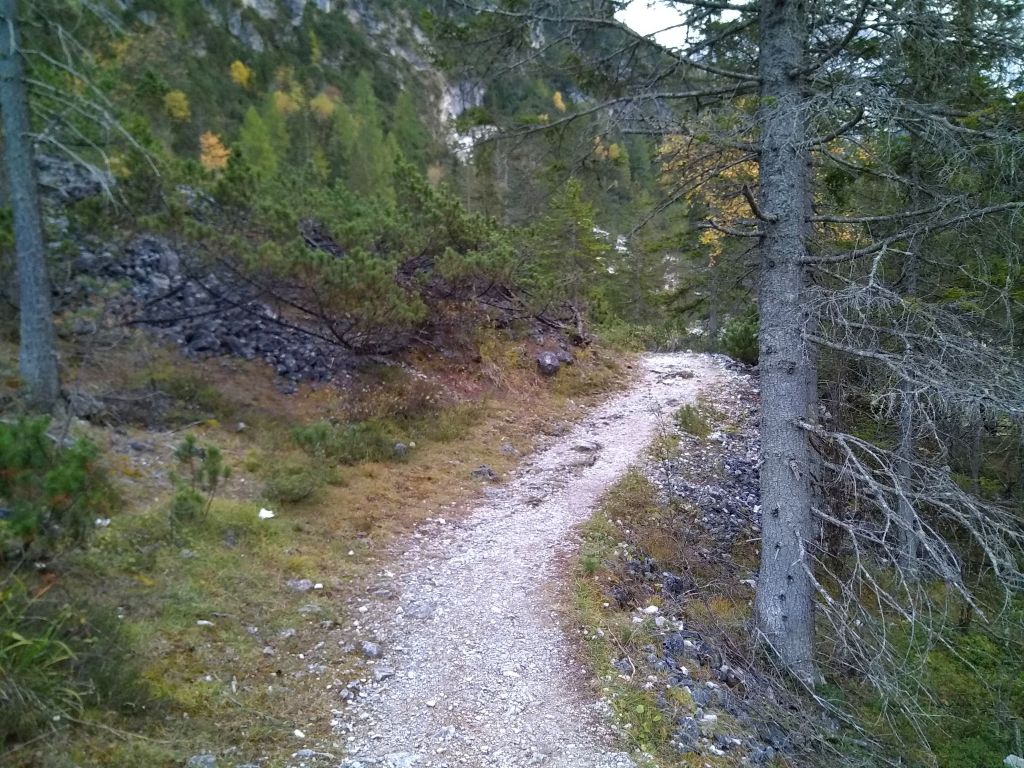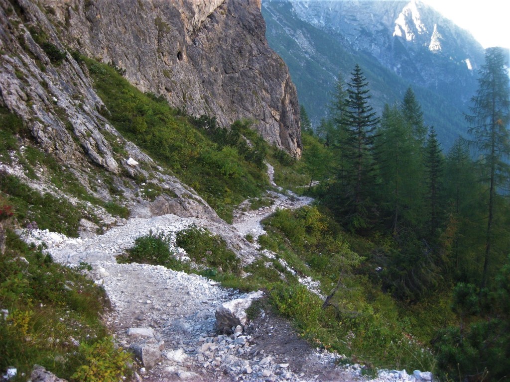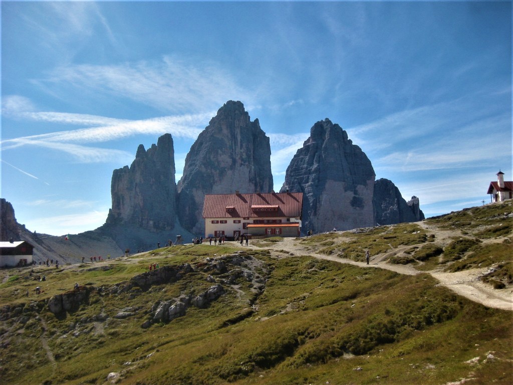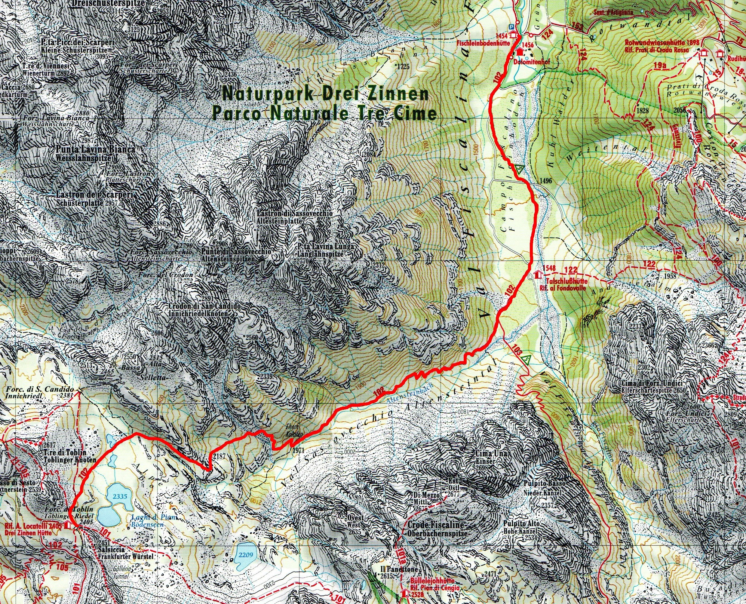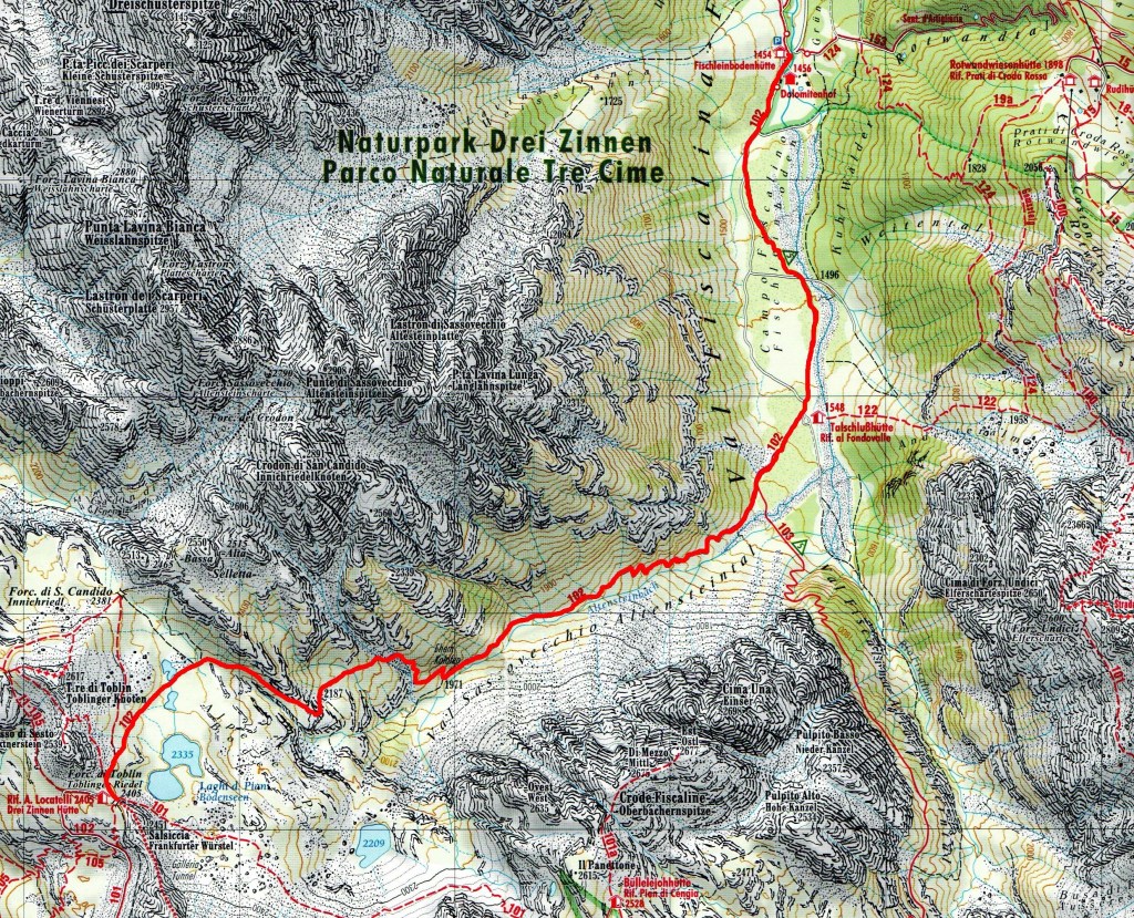 Uno dei percorsi più belli per salire al Rifugio Locatelli Innerkofler 2405 m , si parte dal Rifugio Fondovalle 1548 m, il sentiero poco difficile e molto variegato , presenta passaggi molto belli nel suo primo tratto boschivo per poi salendo sempre privo di difficoltà su tratti rocciosi per poi culminare sull’Alpe dei Piani . Il tracciato sale su un terreno sassoso, ma piacevole in mezzo ad una vegetazione molto variabile , dai mughi alle pinete di abeti ,transitando sul lato destro di un piccolo torrente, mentre man mano che si sale si allontana dallo stesso nel punto in cui la pendenza inizia un pò ad aumentare senza mai divenire ostica e difficile, raggiungendo questo tratto si potrà notare la cascata proprio a ridosso del boschetto, dove anche la pendenza si farà un po più severa e sulle cengie circostanti si ammirerà la Cima Fiscalina e la Cima dell’Uno mentre giusto davanti si vedrà la croce de Paterno 2746 m. All’uscita del canalone a circa 2025 m lo scenario cambia ancora divenendo fatto di rocce e mughi, dove apparirà davanti la Torre di Toblin e il Sasso di Sesto teatro di cruente battaglie alla baionetta, per poi infine raggiungere il tratto prativo a ridosso dell’Alpe dei Piani e degli omonimi laghi, dove uscirà anche la sagoma delle Tre Cime di Lavaredo e il Rifugio Locatelli Innerkofler 2405 m.