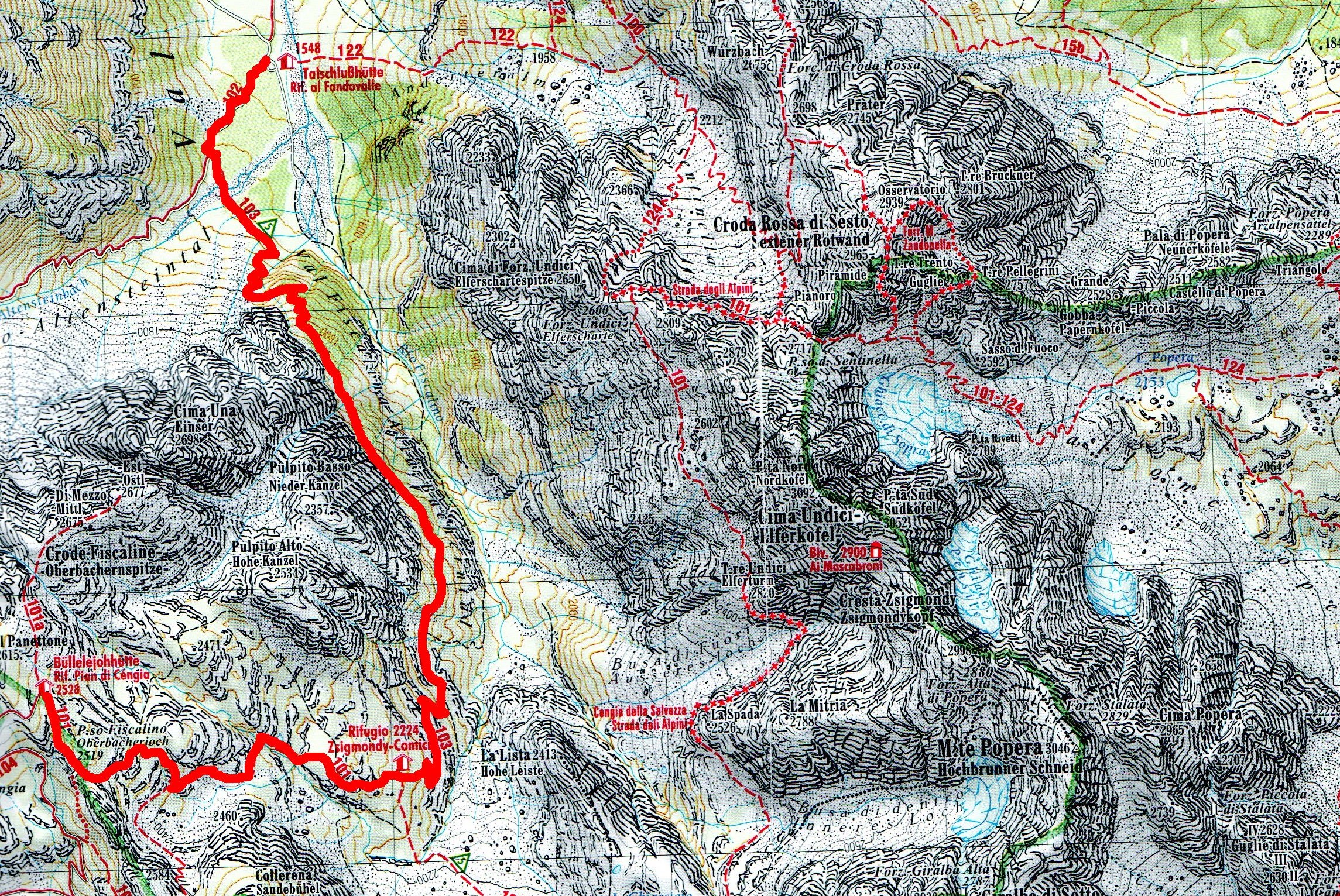 Si parte dal Rifugio Fondovalle 1548 m, il sentiero poco difficile e molto variegato , presenta una prima parte sul canale del torrente fino a una curva a sinistra dove un brusco aumento di pendenza lo porterà dentro una valle molto più stretta di quella del Sassovecchio a quota circa 1600 m, dove proseguirà ai piedi della cima Una e del Pulpito alto su tratti rocciosi , con una visione dal lato opposto delle famosa ferrata Strada degli alpini che passa sulla forcella Undici e la magnifica Croda Rossa di Sesto , man mano che si sale superata la parte ai piedi delle pareti si passa in un ghiaione , da dove si scorgerà la maestosa sagoma della Croda di Toni e sulla sinistra Forcella Giralba , un tornante secco ci porterà al Rifugio Zsigmondy-Comici 2224 m. Il sentiero diverrà meno ripido e proseguire su tratto prativo fino a raggiungere il Passo Fiscalino 2519 m e poi attraverso la mulattiera di guerra il Rifugio Pian di Cengia 2528 m dove lo scenario è mozza fiato , salendo a cima Fiscalina dietro il rifugio si potra ammirare un panorama incredibile sia verso il fondovalle che a 360°. Proseguendo ed allungando il percorso in circa 30 minuti sipotrà raggiungere il Rifugio Locatelli Innerkofler 2405 m.