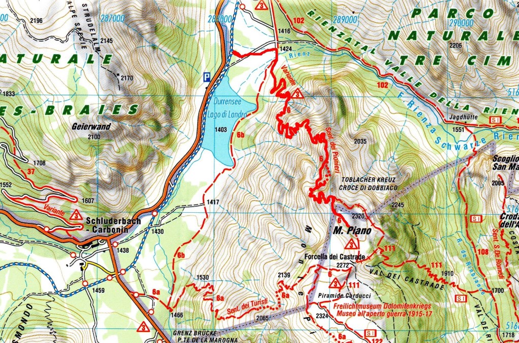 Il ritorno si può fare sia dallo stesso che dal sentiero dei Pionieri , anche se io vi invito eventualmente fare il contrario , cioè salire dal sentiero dei pionieri e scendere dal sentiero dei turisti. Il 6B collega il punto di partenza dove si mette l’auto, a mio avviso se si trova posto nei pressi di Carbonin c’è un piccolo posteggio appena dopo il ponte in cui non c’è il Parchimetro, da li si imbocca il 6A.