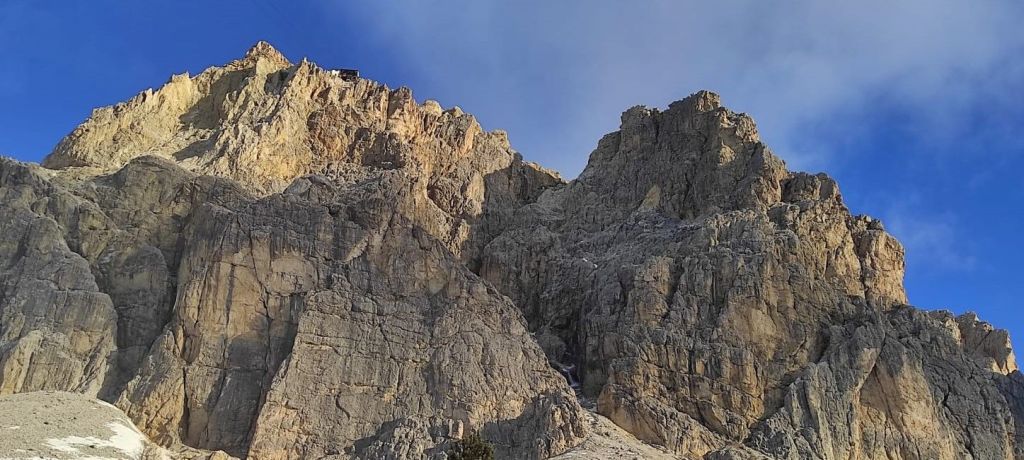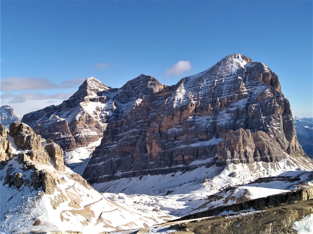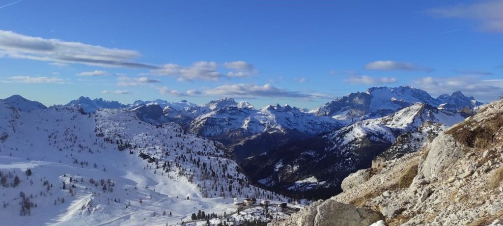 Questo percorso molto difficile in salita , ma uno dei più belli in questo gruppo montuoso ,permette panorami incredibili , circondato da alcune delle montagne più belle in assoluto , Tofane Averau e Nuvolau , Sasso di Stria , 5 Torri , teatri di grandi contese belliche del 1915-1918 . Si sale dal piazzale della funivia a Passo Falzarego 2105 m per il sentiero 402 , per poi sotto le rocce strapiombanti del Lagazuoi proseguendo poi dritti , mentre sulla sinistra si entrerebbe nella galleria dapprima transitando anche per la cengia Martini ed altre postazioni con un occhio di controllo verso il Sass de stria . Ma nel periodo invernale è sconsigliato salire perchè il rischio di trovare chiusa l’uscita dalla neve . Si salirà cosi dal sentiero che parte dal Passo Falzarego 2105 m, proseguendo nel primo tratto sul bordo pista e poi imboccato il sentiero salire sullo stesso sempre tenendo la pista a destra , RICORDO CHE LE PISTE DA SCI NON VANNO MAI ATTRAVERSATE , si sale su un pezzo di notevole pendenza dopo aver superato la quota di circa 2400 m, fino a raggiungere le praticabili rocette esposte a sinistra raggiungendo così in breve tempo la quota del Rifugio Lagazuoi , Per la discesa si scende dallo stesso 401 che parte da sotto il rifugio e scende verso forcella Val Travenànzes ,facendo il percorso a ritroso , per poi rientrare sul 402 e raggiungere l’auto, si può volendo scendere anche con la funivia anche se il prezzo è un pò caro.