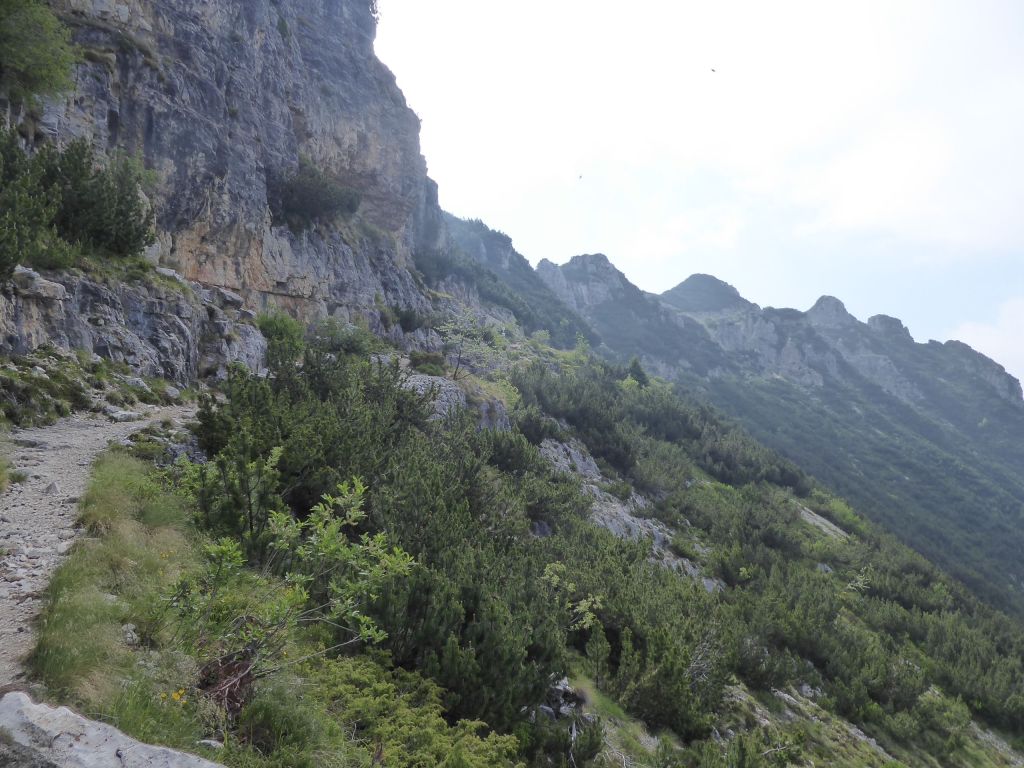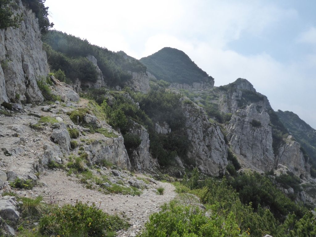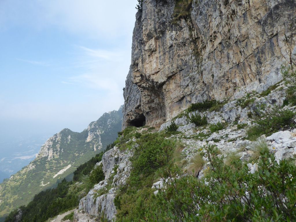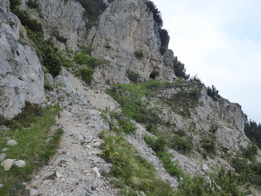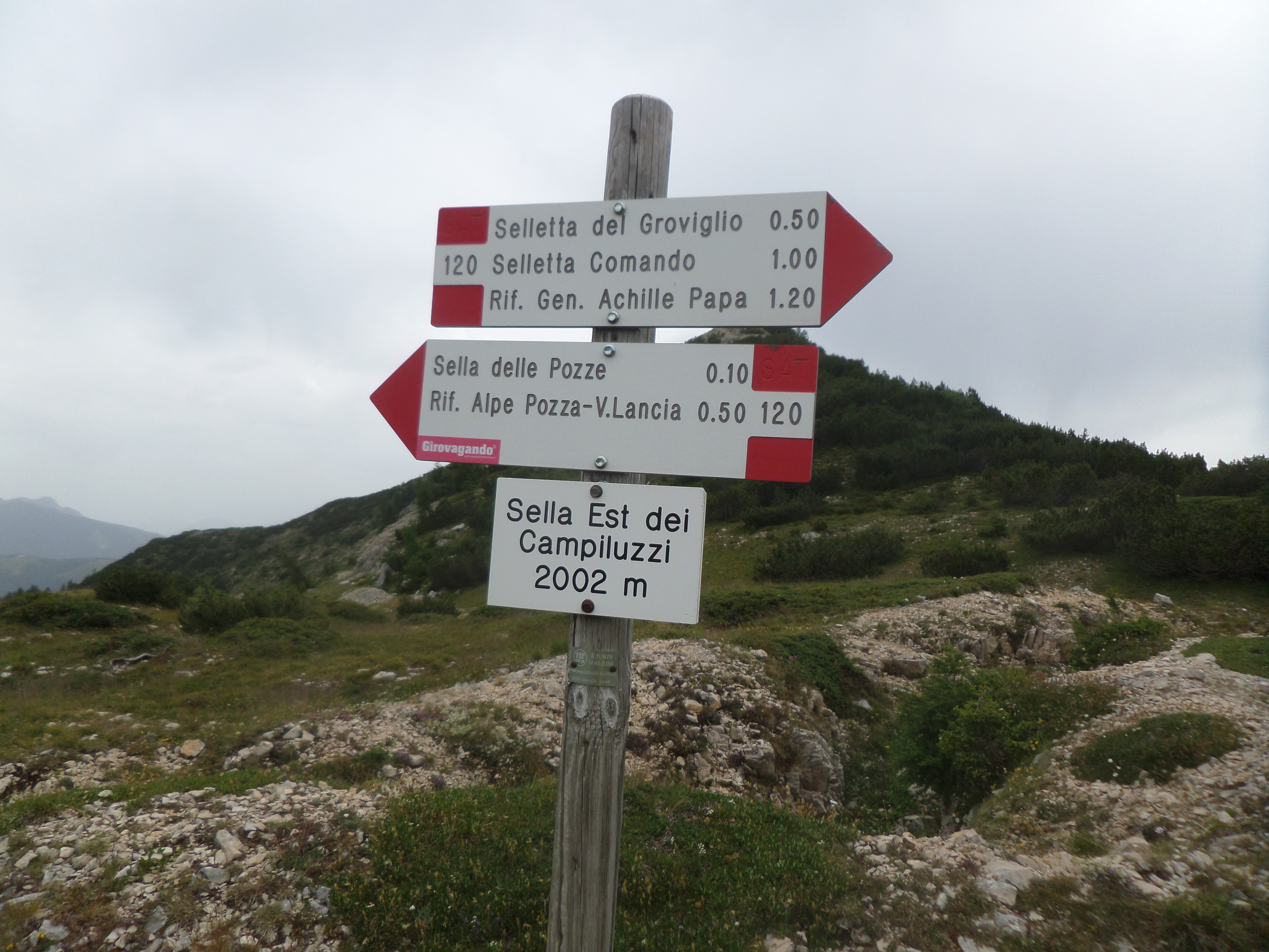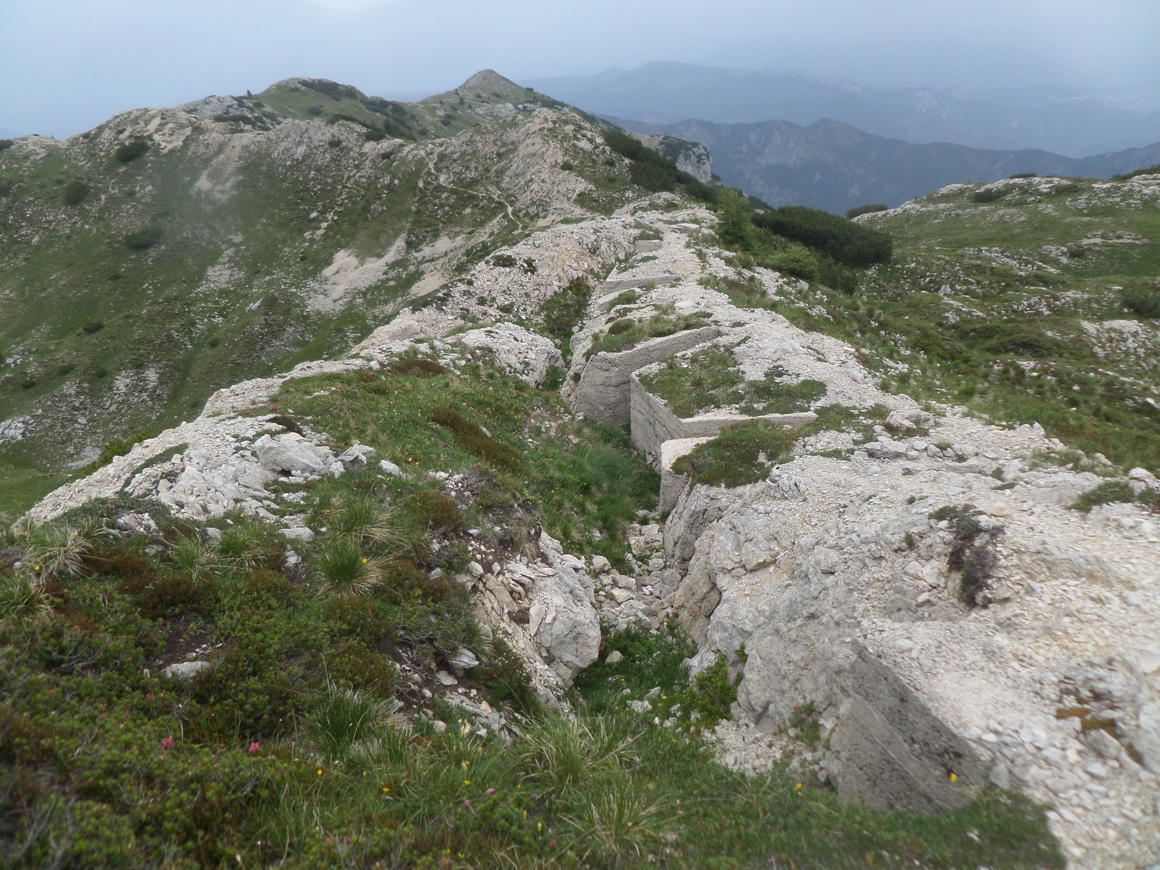 Questo itinerario che propongo insieme ad altri sul Pasubio completa molti punti di questo maestoso Massiccio, sia ben chiaro che un’itinerario di queste dimensioni non è certo alla portata di tutti , ma andiamo per passi , giunti in auto sul Passo della Borcola si scende verso la malga e ditro al piccolo laghetto si nota il segnavia 148 che porta al Passo di Lucco passando per la Malga Gulva , si scende nella valle fino alla malga e si sale in un canalone detritico , la selvaggia Val Gulva , conosciuta e praticata da pochi , che si snoda in maniera incredibile tra massi giganti e terreni prativi e boschivi tali da non comprenderne la direzione , fino a raggiungere località Sorgente a 1850 m , ovvero nel bivio del sentiero 147 che proviene da malga Costa e porta nella Sella delle pozze 1903 m , ma non è questo il sentiero che noi prenderemo , proseguiremo dal 121A fino a raggiungere il 120 e sulla destra verso Selletta Est dei Campiluzzi 2002 m , dove andremo alla ricerca della Galleria di circa 300 m che al suo interno oltre che essere stata usata per il periodo bellico del 1915-18 , si possono ritrovare orme dei dinosauri sul suo soffito , e situata dietro al cartello segnavia proseguendo fino ad un a discesa su materiale detritico si arriva ad un piccolo dosso e sulla destra si noterà il suo imbocco , dopo averla visitata si prosegue verso il rifugio Lancia dove una bella pasta ci aspetta , si riparte con il 102 che ci porterà fino a bocchetta delle Corde e poi attraverso il 105 tricolore prima sul Roite e poi sui Dente austriaco , su quello italiano e poi a cima Palon 2232 m per poi attraverso il Cogolo Alto scendere fino al Rifugio Papa , dove un a sosta e d’obbligo , per poi ripartire per il 120 passando per l’arco romano e la chiesetta di Santa Maria dove a pochi metri si trova la selletta comando della linea italiana , si continua in un’alternarsi di sali scendi , fino alle 7 croci ed all’altare costruito dal comune di Trambileno per i suoi caduti , si sale fino alla selletta del graviglio , e imboccando un sentiero poco segnalato proseguire sulla linea difensiva austroungarica visibile dalle pareti di cemento , si prosegue su postazioni e ricoveri fino a superare i sogli bianchi e raggiungere l’immenso prato circostante a malga Costa , per poi atrraverso tratti boschivi e prativi raggiungere il Passo della Borcola .