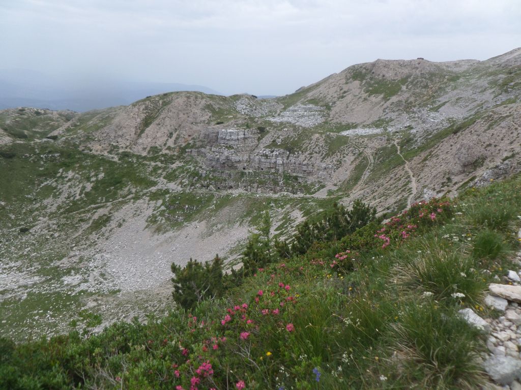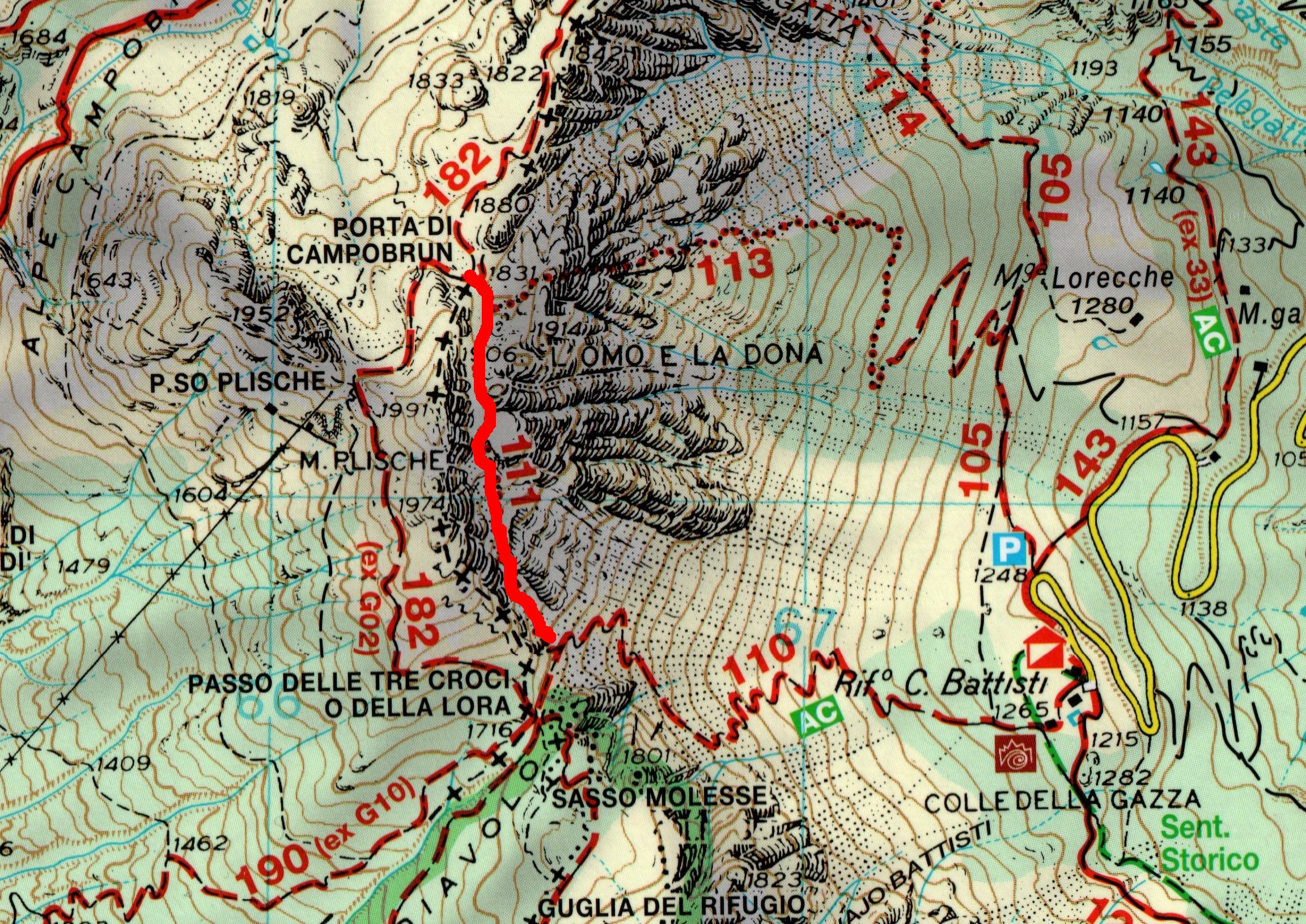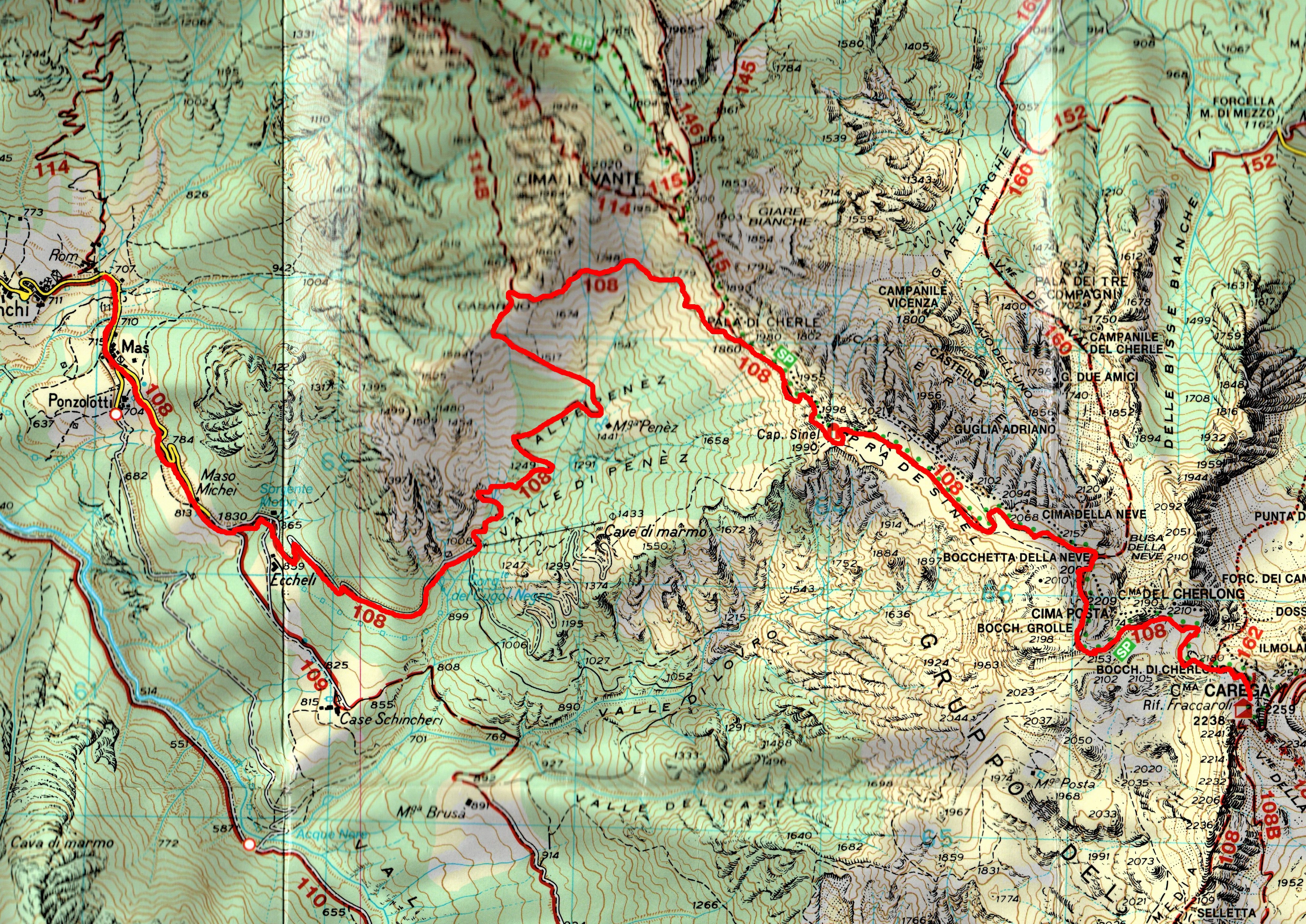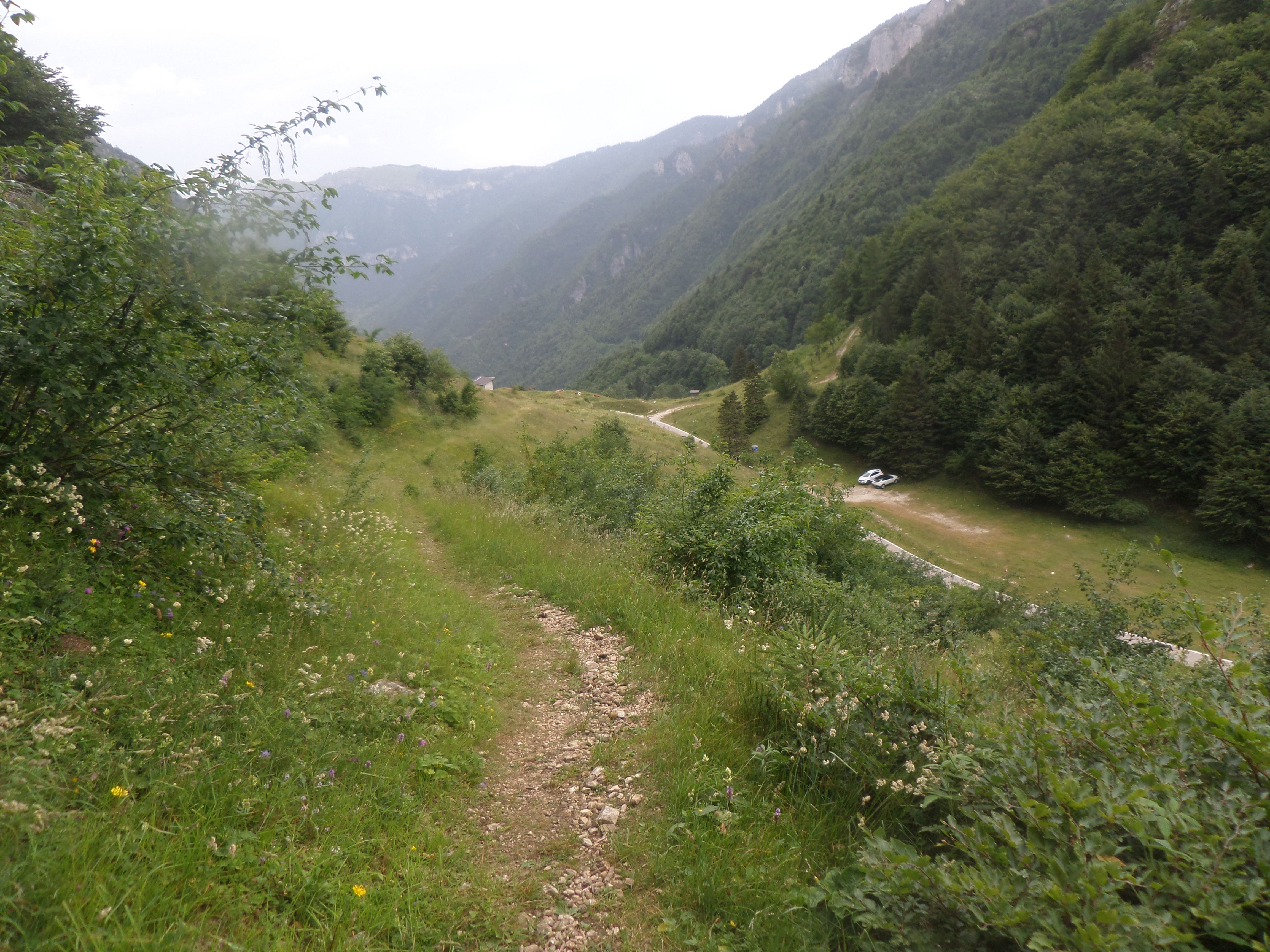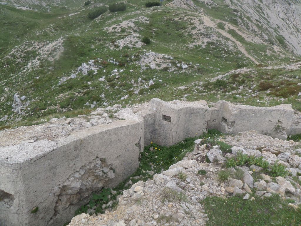 Questo itinerario che propongo insieme ad altri sul Pasubio completa molti punti di questo maestoso Massiccio, sia ben chiaro che un’itinerario di queste dimensioni non è certo alla portata di tutti , ma andiamo per passi , giunti in auto sul Passo della Borcola si scende verso la malga e ditro al piccolo laghetto si nota il segnavia 148 che porta al Passo di Lucco passando per la Malga Gulva , si scende nella valle fino alla malga e si sale in un canalone detritico , la selvaggia Val Gulva , conosciuta e praticata da pochi , che si snoda in maniera incredibile tra massi giganti e terreni prativi e boschivi tali da non comprenderne la direzione , fino a raggiungere località Sorgente a 1850 m , ovvero nel bivio del sentiero 147 che proviene da malga Costa e porta nella Sella delle pozze 1903 m , ma non è questo il sentiero che noi prenderemo , proseguiremo dal 121A fino a raggiungere il 120 e sulla destra verso Selletta Est dei Campiluzzi 2002 m , dove andremo alla ricerca della Galleria di circa 300 m che al suo interno oltre che essere stata usata per il periodo bellico del 1915-18 , si possono ritrovare orme dei dinosauri sul suo soffito , e situata dietro al cartello segnavia proseguendo fino ad un a discesa su materiale detritico si arriva ad un piccolo dosso e sulla destra si noterà il suo imbocco , dopo averla visitata si prosegue verso il rifugio Lancia dove una bella pasta ci aspetta , si riparte con il 102 che ci porterà fino a bocchetta delle Corde e poi attraverso il 105 tricolore prima sul Roite e poi sui Dente austriaco , su quello italiano e poi a cima Palon 2232 m per poi attraverso il Cogolo Alto scendere fino al Rifugio Papa , dove un a sosta e d’obbligo , per poi ripartire per il 120 passando per l’arco romano e la chiesetta di Santa Maria dove a pochi metri si trova la selletta comando della linea italiana , si continua in un’alternarsi di sali scendi , fino alle 7 croci ed all’altare costruito dal comune di Trambileno per i suoi caduti , si sale fino alla selletta del graviglio , e imboccando un sentiero poco segnalato proseguire sulla linea difensiva austroungarica visibile dalle pareti di cemento , si prosegue su postazioni e ricoveri fino a superare i sogli bianchi e raggiungere l’immenso prato circostante a malga Costa , per poi atrraverso tratti boschivi e prativi raggiungere il Passo della Borcola .