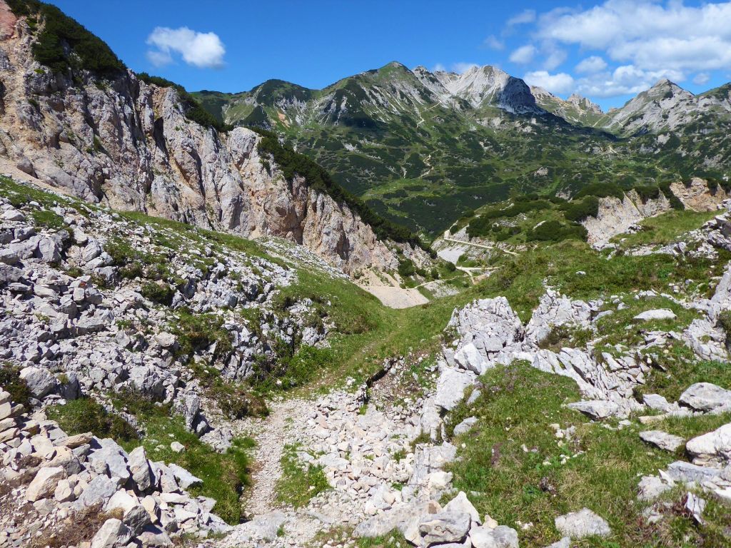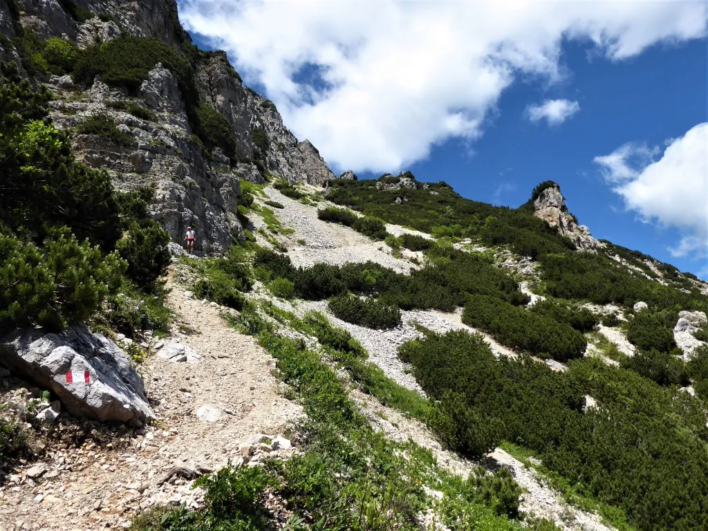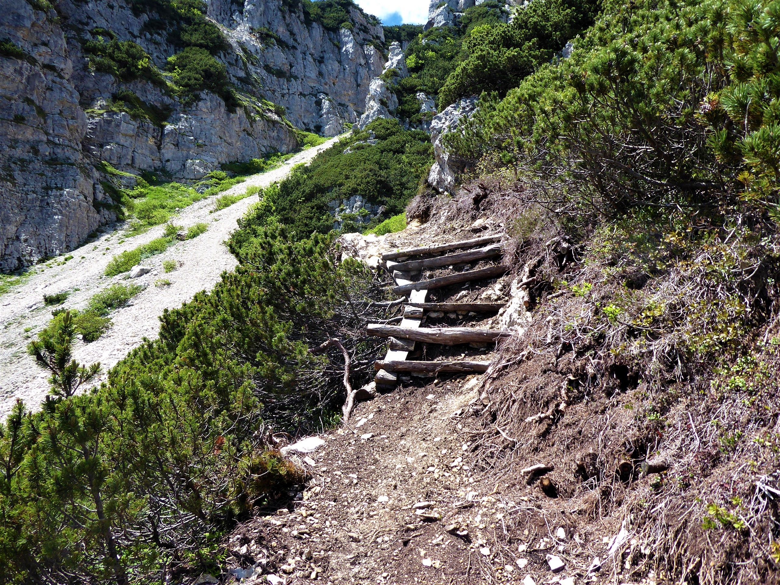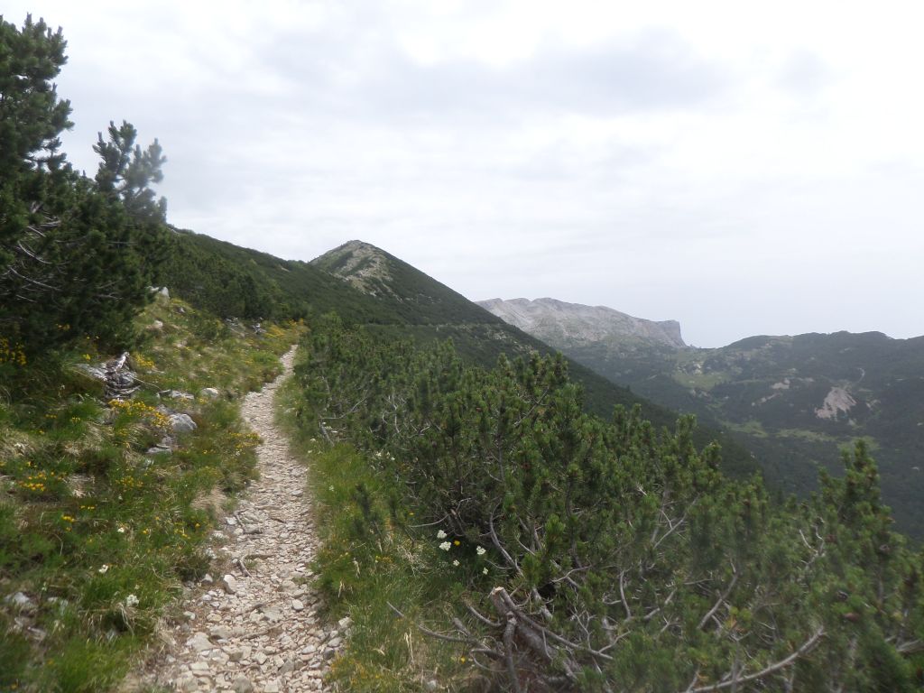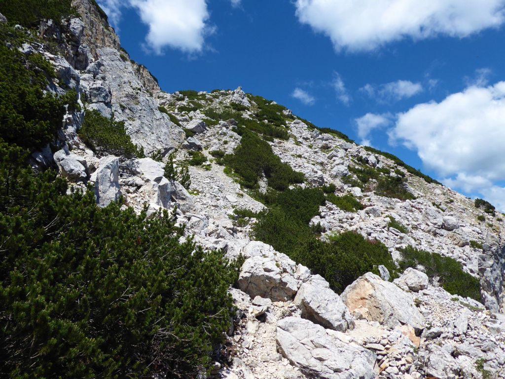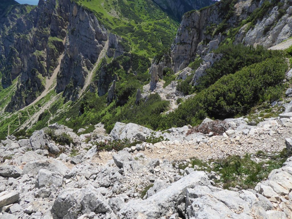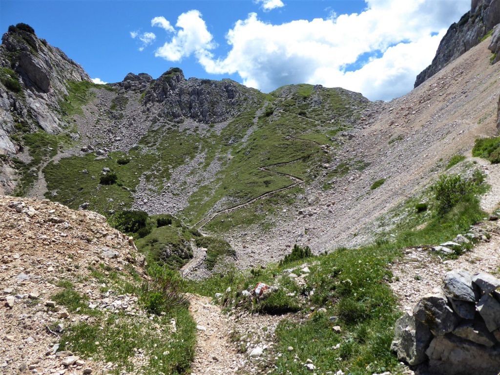 Questo itinerario che propongo insieme ad altri sul Pasubio completa molti punti di questo maestoso Massiccio, sia ben chiaro che un’itinerario di queste dimensioni non è certo alla portata di tutti , ma andiamo per passi , giunti in auto sul Passo della Borcola si scende verso la malga e ditro al piccolo laghetto si nota il segnavia 148 che porta al Passo di Lucco passando per la Malga Gulva , si scende nella valle fino alla malga e si sale in un canalone detritico , la selvaggia Val Gulva , conosciuta e praticata da pochi , che si snoda in maniera incredibile tra massi giganti e terreni prativi e boschivi tali da non comprenderne la direzione , fino a raggiungere località Sorgente a 1850 m , ovvero nel bivio del sentiero 147 che proviene da malga Costa e porta nella Sella delle pozze 1903 m , ma non è questo il sentiero che noi prenderemo , proseguiremo dal 121A fino a raggiungere il 120 e sulla destra verso Selletta Est dei Campiluzzi 2002 m , dove andremo alla ricerca della Galleria di circa 300 m che al suo interno oltre che essere stata usata per il periodo bellico del 1915-18 , si possono ritrovare orme dei dinosauri sul suo soffito , e situata dietro al cartello segnavia proseguendo fino ad un a discesa su materiale detritico si arriva ad un piccolo dosso e sulla destra si noterà il suo imbocco , dopo averla visitata si prosegue verso il rifugio Lancia dove una bella pasta ci aspetta , si riparte con il 102 che ci porterà fino a bocchetta delle Corde e poi attraverso il 105 tricolore prima sul Roite e poi sui Dente austriaco , su quello italiano e poi a cima Palon 2232 m per poi attraverso il Cogolo Alto scendere fino al Rifugio Papa , dove un a sosta e d’obbligo , per poi ripartire per il 120 passando per l’arco romano e la chiesetta di Santa Maria dove a pochi metri si trova la selletta comando della linea italiana , si continua in un’alternarsi di sali scendi , fino alle 7 croci ed all’altare costruito dal comune di Trambileno per i suoi caduti , si sale fino alla selletta del graviglio , e imboccando un sentiero poco segnalato proseguire sulla linea difensiva austroungarica visibile dalle pareti di cemento , si prosegue su postazioni e ricoveri fino a superare i sogli bianchi e raggiungere l’immenso prato circostante a malga Costa , per poi atrraverso tratti boschivi e prativi raggiungere il Passo della Borcola .