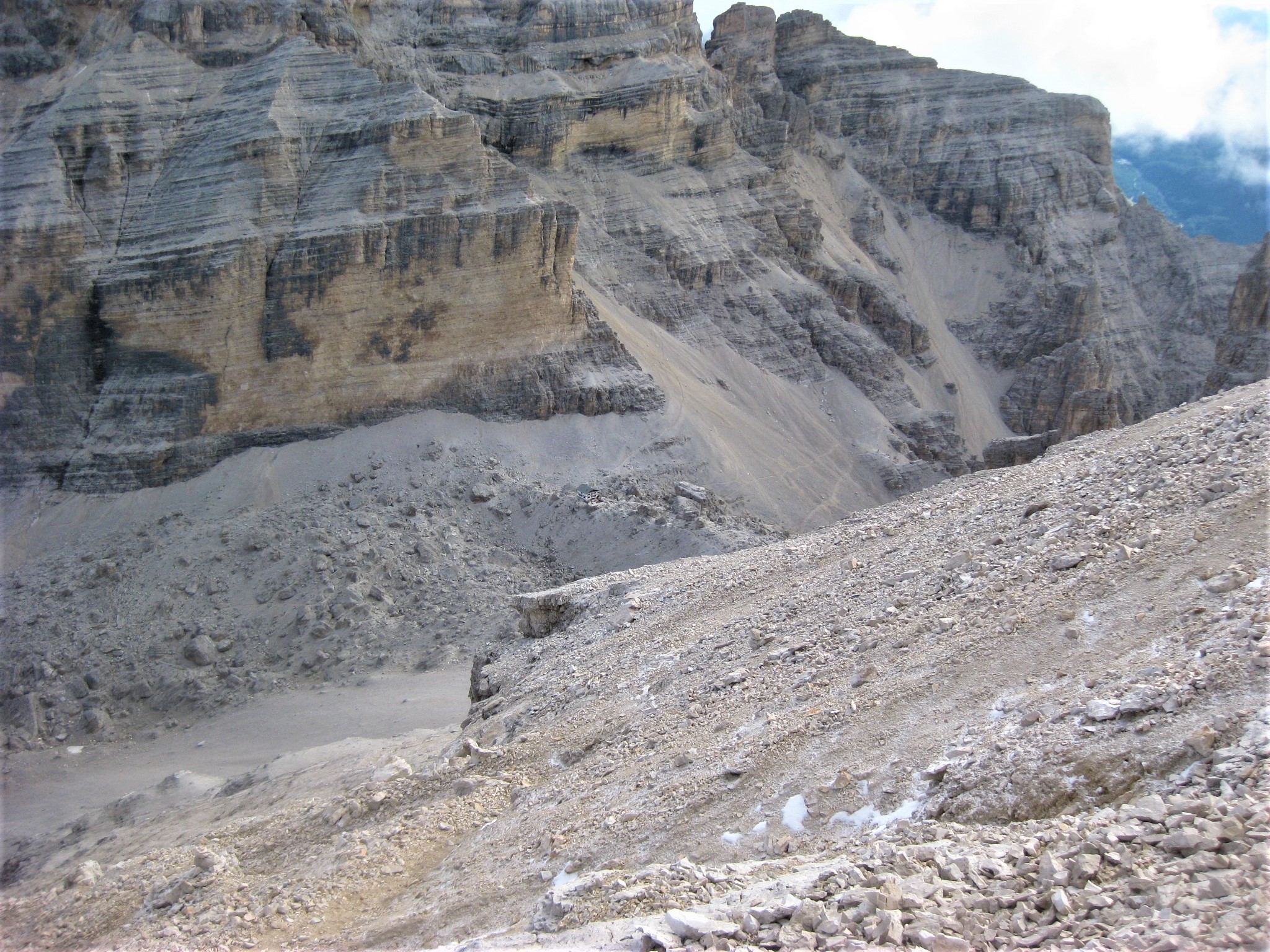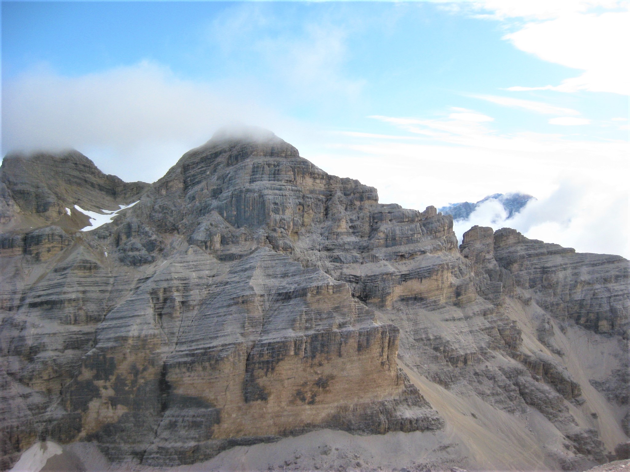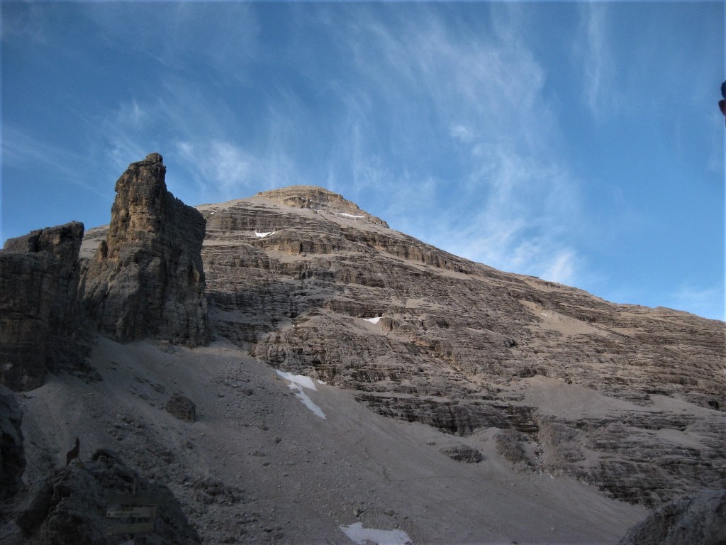 Il percorso di questa via normale non presenta grosse difficoltà anche se molto poco segnalato è molto intuitivo , si prende il sentiero che arriva al Giussani 2600 m dalla Postazione Tre Dita , una posizione che domina su tutta la val Travenanzes , ad un primo bivio si inizia salire in maniera importante su ghiaioni detritici e spunti di roccia stabile in cui la presenza frastagliata della stessa crea gradini quasi naturali su cui inerpicarsi , il dislivello partendo dal Giussani e abbastanza lieve di circa 600 m, la presenza di sole estivo rende la via più complessa visto la totale assenza di piante ed ombra , continuando a salire con tratti di ghiaioni e roccette si raggiunge la cresta è si procede sul versante sinistro con su ghiaioni e sentiero segnato dal continuo andirivieni degli escursionisti , per chi invece volesse cimentarsi nella parte finale della Ferrata Lipella proseguendo perla postazione Tre Dita si entrerà nella Ferrata per completare i circa 300 metri e raggiungere i ghiaioni che porteranno direttamente sulla vetta rientrando così sulla via normale che sale dal Giussani , per quanto riguarda la ferrata Lipella è documentata in altro post visto la sua lunghezza . Comunque soggiornando la notte in rifugio ci sarà tutto il tempo per salire e scendere con tranquillità e sicurezza anche fino all’auto .