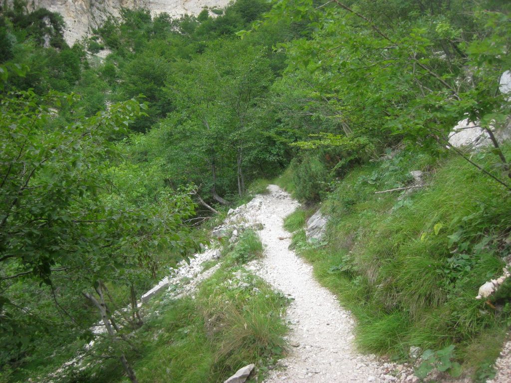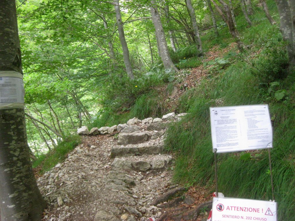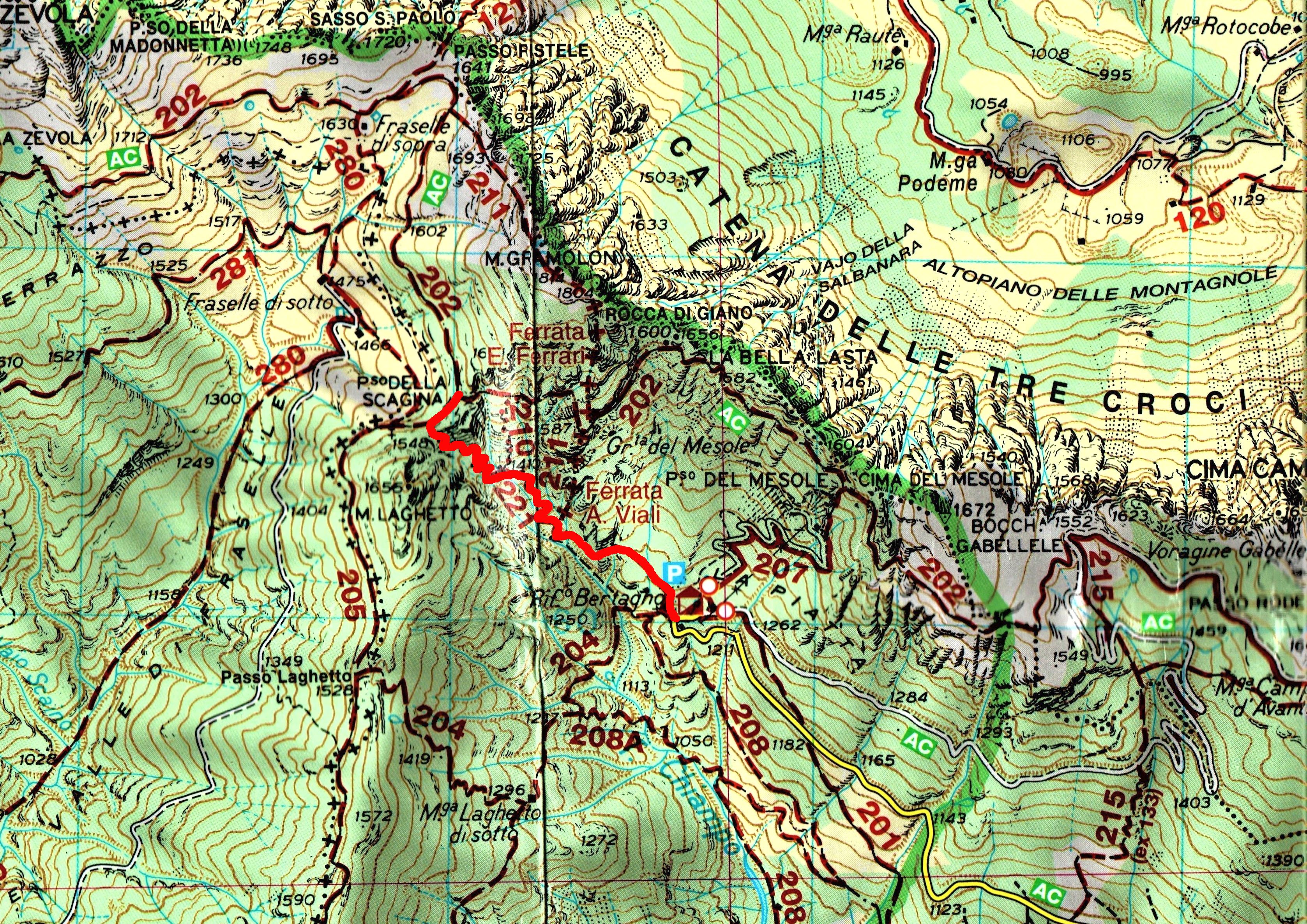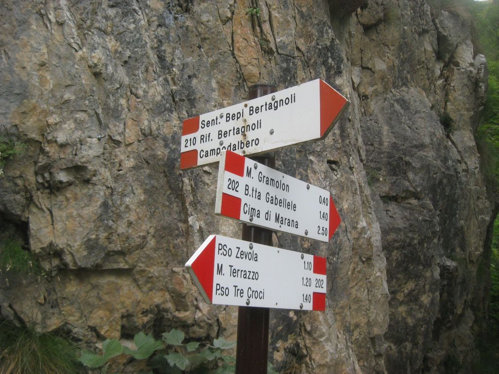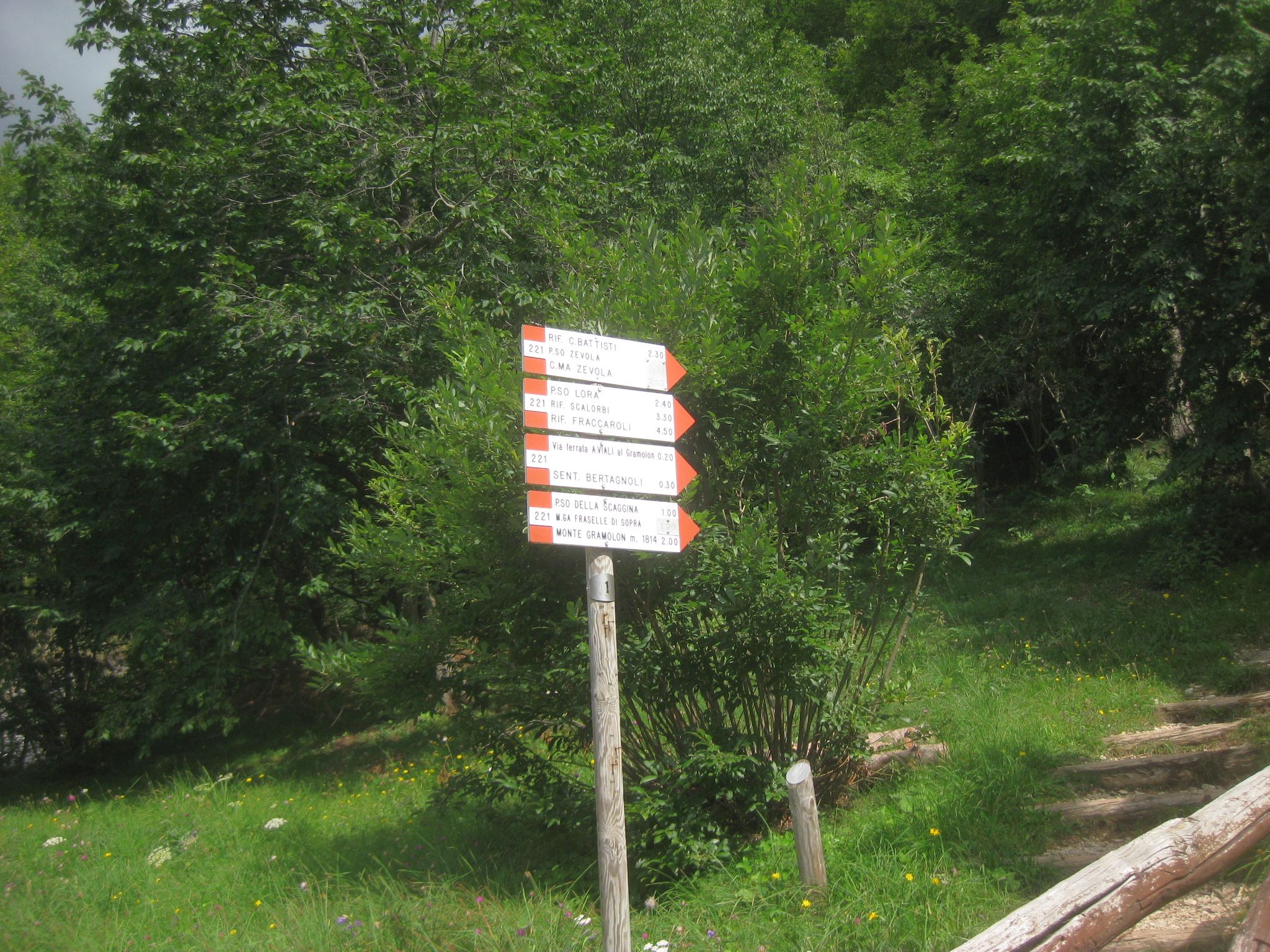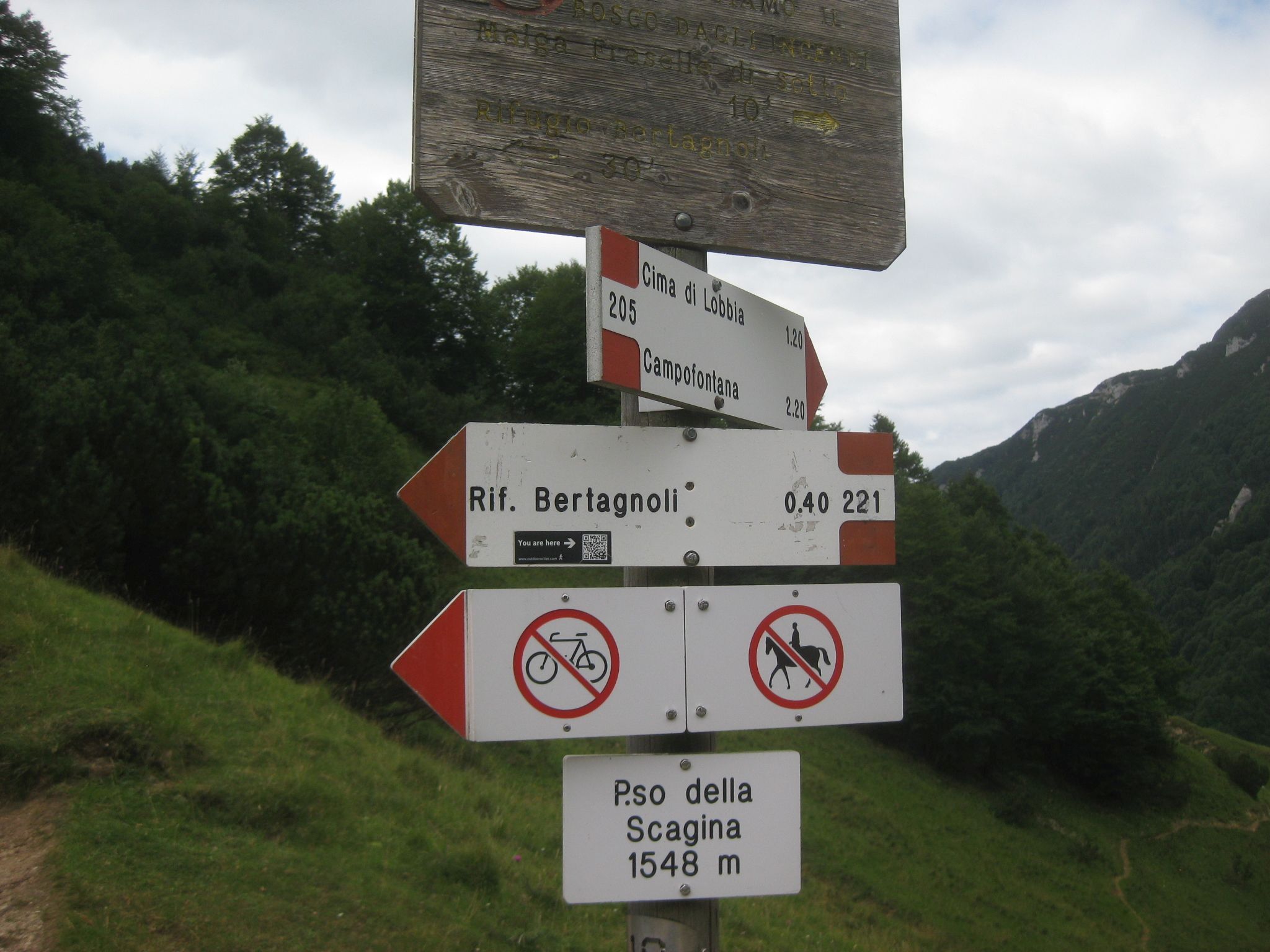 Questo sentiero e molto utile per collegare il rifugio Bertagnoli 1250 m, al 202 che percorre le montagnole Alte , e privo di difficolta tecniche attraversa dapprima il boschetto adiacente al rifugio , per poi entrare nel canale detritico con alcuni piccoli passaggi con corda in acciaio e transitando sotto l’attacco della ferrata Viali sentieri 211, che poi dopo essere transitata sul 202 , imbocca la restante ferrata Ferrari del Gramolon 1814 m, per poi continuare in salita anche se ben compensata dai zig zag, ed incrociando il 210 che porta sul pulpito di pietra dove si trova la lapide di Bepi Bertagnoli , ma il nostro sentiero prosegue dritto salendo fino al bivio con il 205 che porta a Campofontana passando per la cima della Lobbia 1672 m, mentre sulla sinistra si sale prima sul Passo della Scagina 1548 m, e poi sull’imbocco del 202 che a sinistra prosegue verso malga Campodavanti e a destra verso il Passo Ristele 1641 m, e con un panorama molto bello sui pascoli della Val Fraselle che porta sull’abitato di Giazza. Facendolo assieme al 207 che proviene dal passo del Mesole permette di completare un piccolo anello passando per il Rifugio Bertagnoli dove si mangia bene e si viene accolti con simpatia ed ospitalità.
