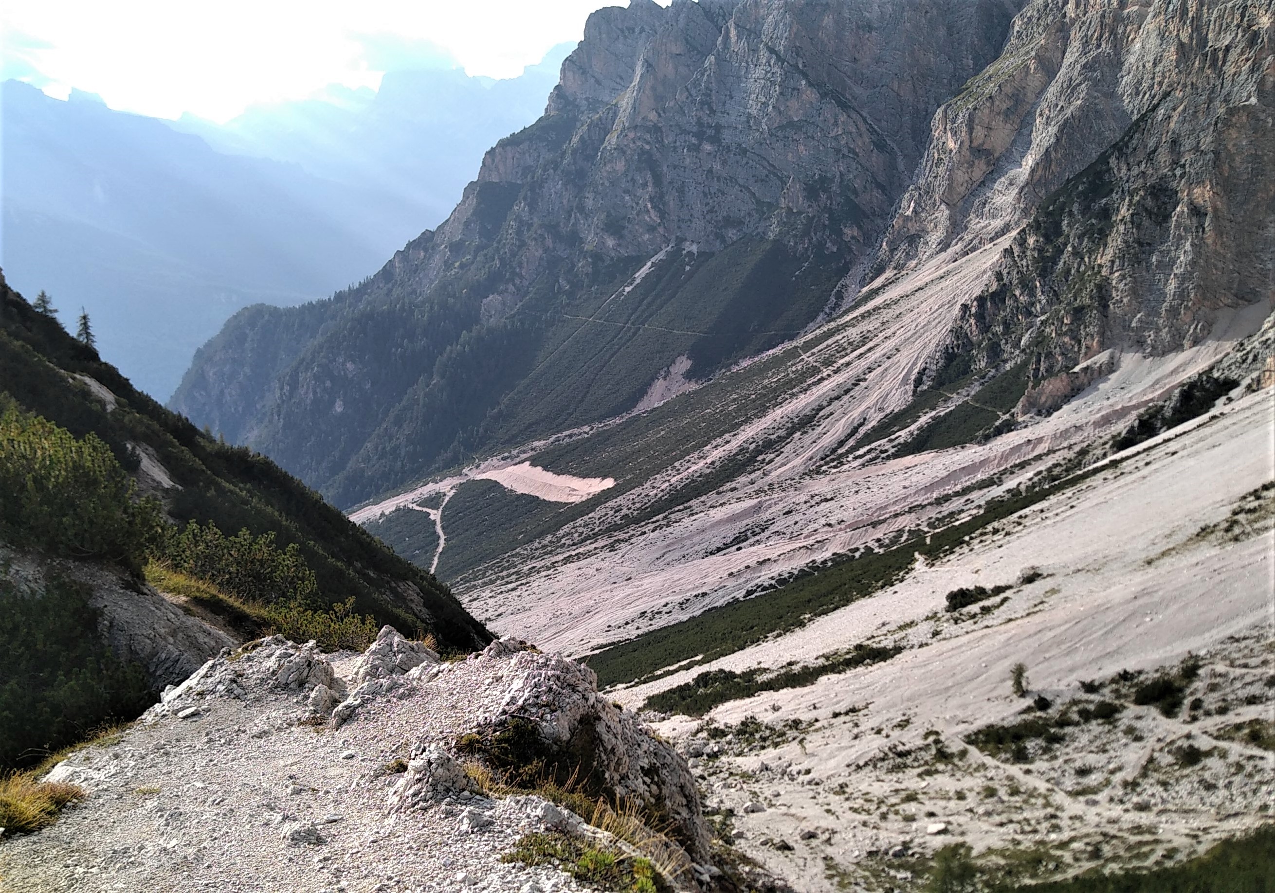 Dopo un sonno ristoratore e una buona colazione, sì riprende con la lunga discesa del percorso n.260 che ci porterà da quota 1911 m a quella del Pont de la Diassa 1140 m , entrando così nella fantastica e detritica Val D’Oten , qui si sale in una stradina chiusa al traffico dove nel periodo estivo esiste una navetta che porta le persona dal Bar La Pineta 1045 m( a circa 15 minuti a piedi dal bivio che scende dal Rifugio Chiggiato ) alla Capanna degli Alpini 1390 m , raggiunta la capanna d’obbligo visitare le Cascate de le Pile a circa 10 minuti dalla Capanna e sul sentiero che sale al Rifugio Galassi , si inizia a salire proseguendo con il n.255 per l’alta Val D’Oten dapprima in mezzo al bosco con una discreta pendenza , per poi uscire dal bosco e proseguire un primo tratto detritico della Valle , per poi salire attraverso in un zigzagare continuo tra rocce detritiche e mughi , mentre rimane discreto l’impegno di risalita attenuata dai numerosi tornanti , fino ad uscire dai mughi e attraverso alcuni passaggi detritici raggiungere il Rifugio Galassi 2013 m , al cospetto di Re Antelao ed i suoi incredibili lastroni , mentre sulla sinistra di potrà osservare in lontananza la via attrezzata della Ferrata del Cadorin nel Ghiacciaio dell’Antelao . Si prosegue salendo ora un altro centinaio di metri attraverso il n.227 che dapprima raggiungerà la Forcella Piccola 2120 m dove la visione panoramica sulla Valle di San Vito di Cadore è incredibile , poi si prosegue attraverso una discesa a cui bisogna prestare attenzione per non perdere la via , e soprattutto per l’instabilità dei detriti raggiungendo il Rifugio San Marco 1823 m, praticamente sulla Col da chi da Os in un paesaggio da favola , un vero rifugio , dove la simpatia ed l’accoglienza delle persone si vive davvero in prima persona , un rifugio una famiglia. Qui si potrà ammirare un scenario incredibile ai piedi del Re Antelao con i suoi lastroni , mentre sulla parte destra il Caregon del Padreterno ovvero il monte Pelmo dal versante del Rifugio Venezia , ed al cospetto dei strapiombi della via Attrezzata Berti del Sorapis . Una Buona cena ed un sonno ristoratore rinvigorirà muscoli e gambe , mentre il cuore porterà dentro ciò che l’occhio ha visto.