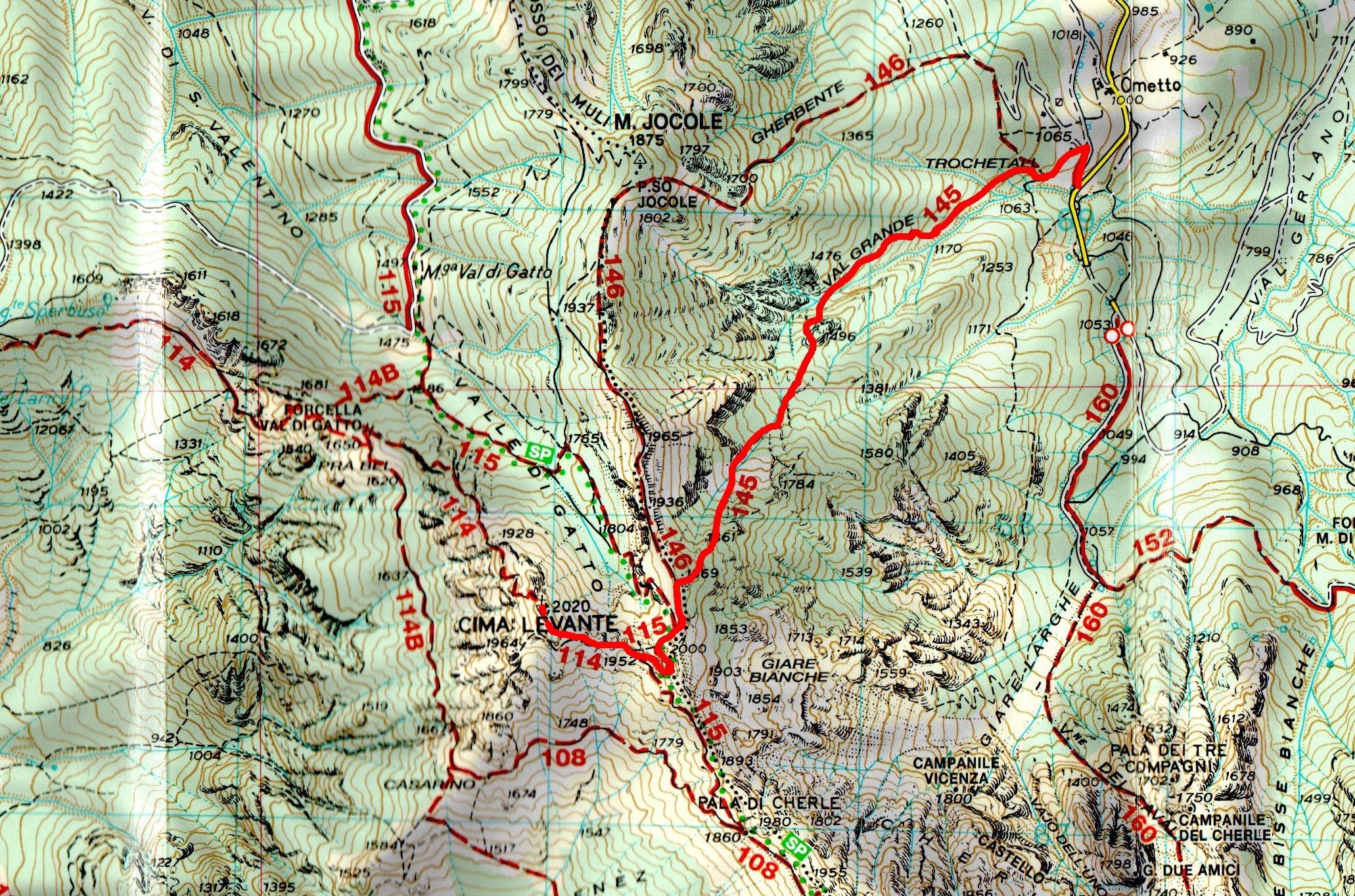 Il sentiero parte dalla Chiesa di Ronchi Ala circa 710 m, sale a fianco della chiesa con una pendenza iniziale importante dapprima su tratto cementato e asfaltato per qualche km , raggiunta l’ultima casa ci si addentra nel bosco, sempre con pendenze di un certo livello, dove il percorso inizia a salire con un zig zag abbastanza costante sulla mulattiera militare rientrando nel tratto di bosco fino a raggiungere la località Rom a circa 1330 m, si continua salire attraversando poi un ampio vallone , si prosegue la risalita , molto bella con un itinerario strapiombante verso la valle dei Ronchi, fino a quando raggiungeremo il bivio con 114B di Prà Bel , dove il sentiero arriva dall’itinerario 108 della località Casarino sulla destra mentre a sinistra si prosegue per la Val Gatto , il percorso prosegue salendo sempre con tornanti ma meno pendenza . I percorsi 114 e 114B per qualche tratto si sovrappongono e poi uno prosegue a sinistra , ma il 114B è un sentiero di raccordo, il 114 prosegue sulla destra non passando per la Forcella val di Gatto 1650 m, si prosegue lungo la mulattiera in cresta a nord della Cima Levante 2020 m, la mulattiera in ottime condizioni porterà l’escursionista fino in quota sommitale di Cima levante dove lo sguardo potrà spaziare in panorami mozzafiato, della Lessinia , Montre Baldo, la Valle dei Ronchi , e sulla destra il Carega , mentre sulla sinistra si potrà vedere il trincerone delle Creste del Jocole, e più in la il Coni Zugna mentre sullo sfondo il Massiccio del Pasubio .