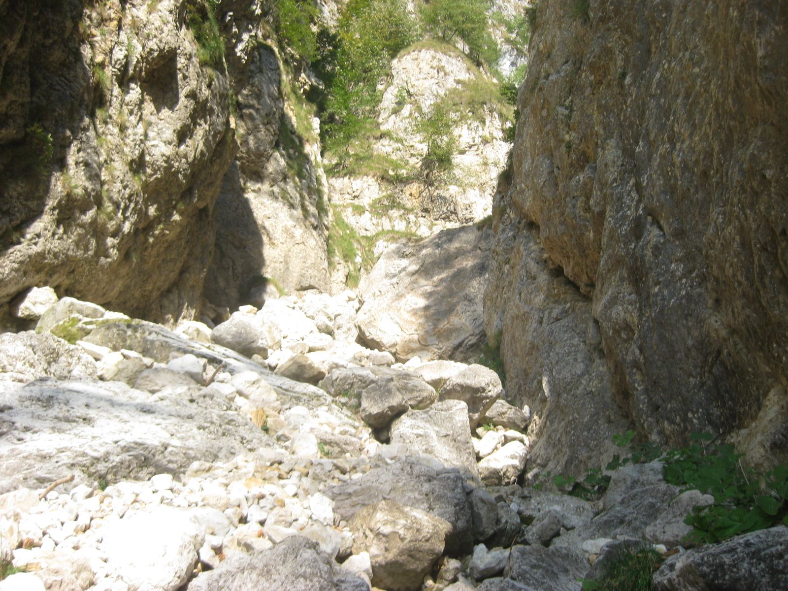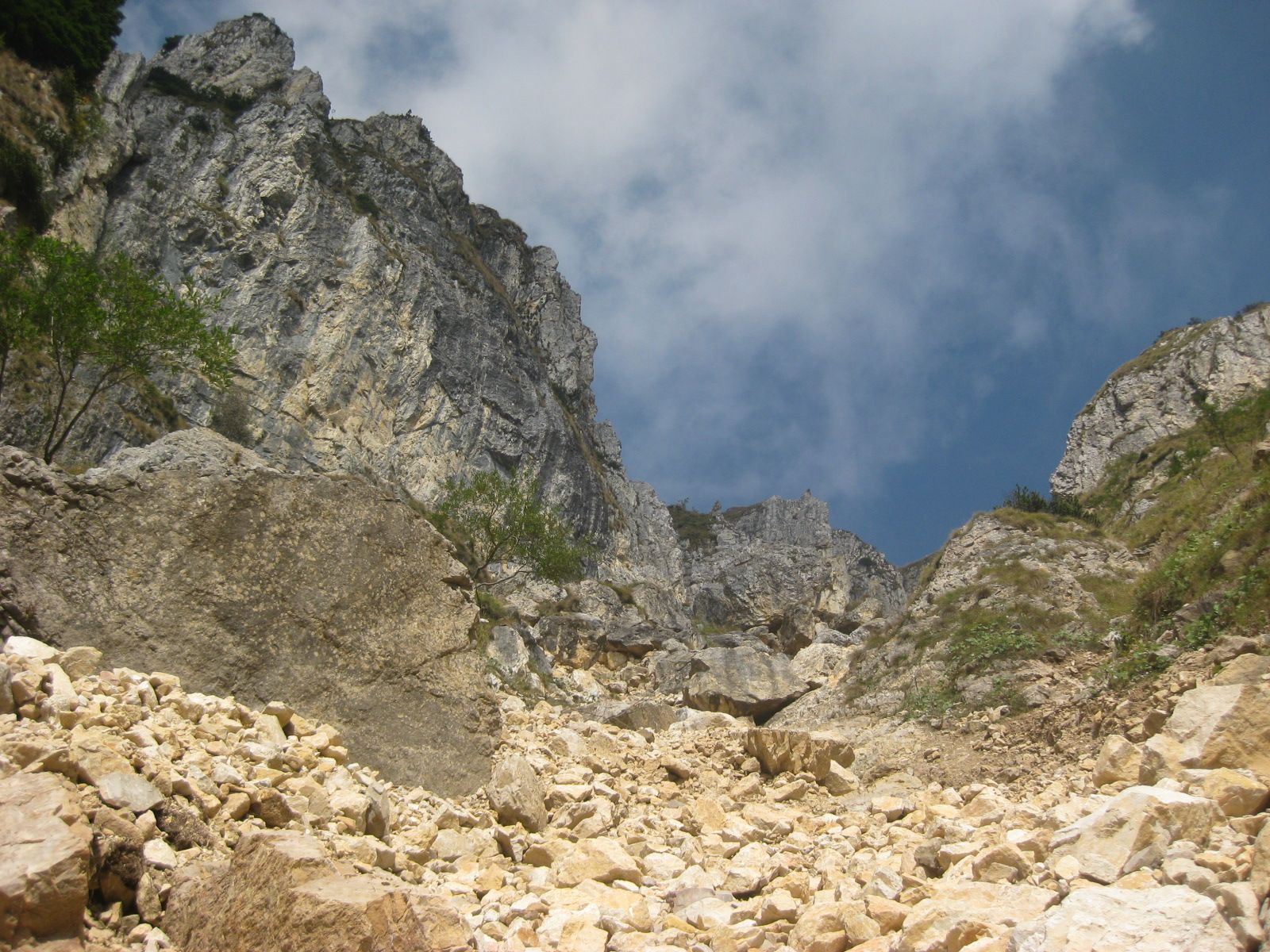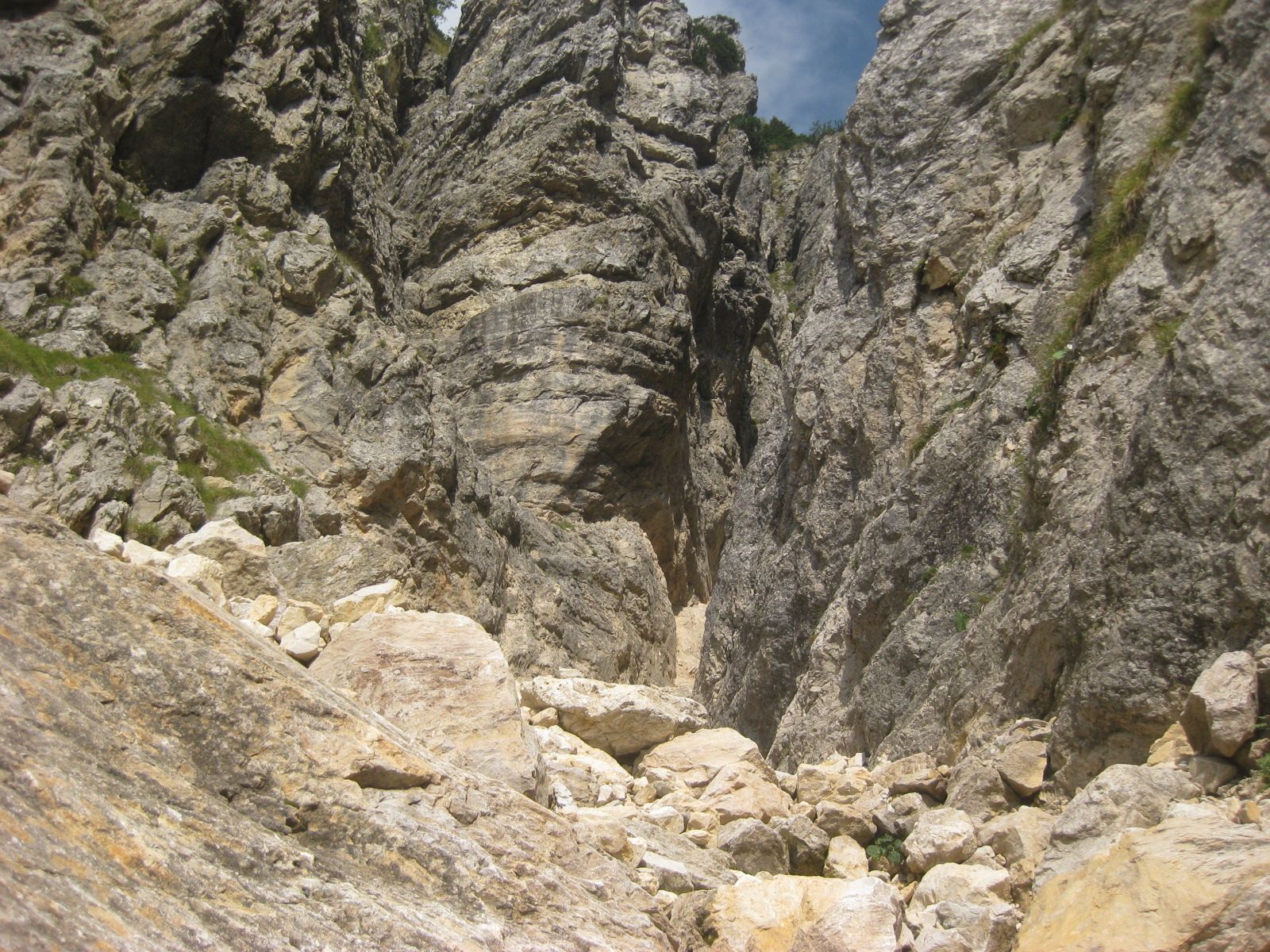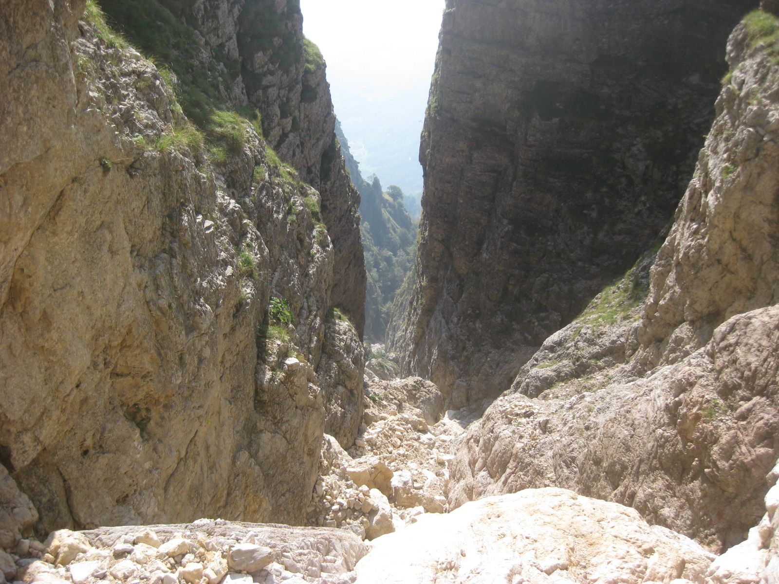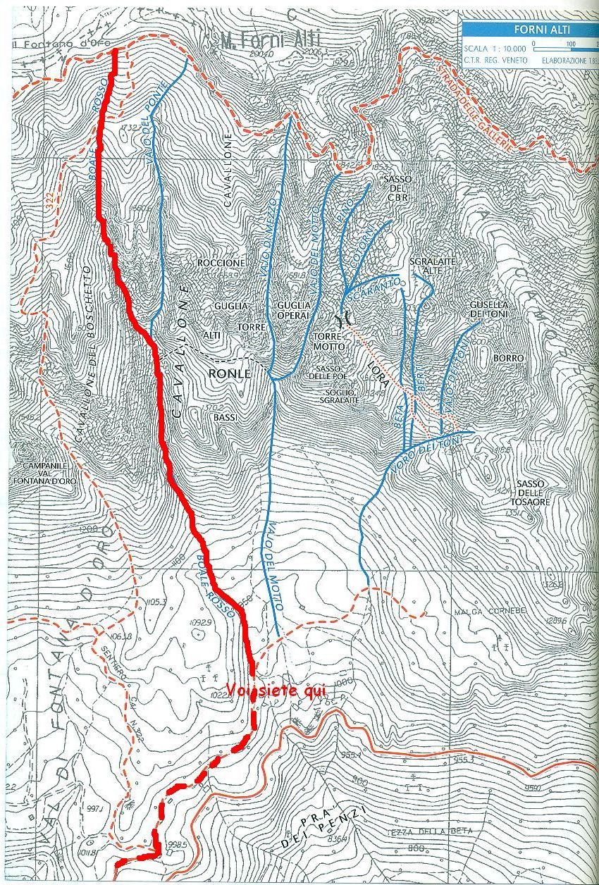 Lasciato il rifugio Campogrosso 1464 m, si prosegue verso la strada delle 7 fontane per circa 150 m fino a raggiungere il segnavia n.157, e la Madonnina a mezzo busto dove è riportata una frase molto significativa «che il Signore fermi le Guerre», ricordo inoltre che qui passava, l’antico confine Austroungarico segnato dai Grandi Cippi, entrati nel sentiero si nota sulla sinistra anche l’Anello Storico della Guerra, il sentiero si snoda nel boschetto attiguo al Passo Buse Scure 1475 m, il bivio porta sulla sinistra ad imboccare il n.144, che porta alla Guardia attraverso il Sentiero delle Mole, il percorso prosegue quasi in maniera circolare transitando sopra la cresta della Frana del Rotolon, si esce parzialmente dal bosco incrociando prima il n.195 Sentiero delle Creste del Fumante, poi proseguendo sui ghiaioni e sotto le pendici di alcune Guglie si transita sul Giaron della Scala e del Prà degli Angeli anche se poco visibile dal basso, raggiunta la Torre Giordani, si incrocia il n.157A, poco usato che sale dalla strada per Camposilvano, poi il bivio a quota 1690 m. con il n.158 del Vajo dei Colori, esiste inoltre un itinerario diretto al Vajo, prendendo la strada che dal Passo Campogrosso 1464 m scende verso località Ometto, giunti sul secondo ponte si nota sulla diretta il vajo dei colori, che sale fino a bocchetta Mosca, questo percorso è poco usato visto che la strada per Ometto è divieto di transito. Dal bivio si scende un po’ per aggirare il gruppo della Cima Mosca 2141 m, sfino a raggiungere la selletta dei Contorni 1650 m, il percorso scende fino a quota 1550 m, per poi risalire nel canale detritico del Vajo che sale tra grossi e piccoli massi, a breve si raggiunge il bivio a circa 1700 m, con un altro itinerario tra i più belli e complessi delle piccole dolomiti, il Vajo dei Camosci, noi proseguiamo a sinistra, su un primo tratto di ghiaioni, poi il percorso si restringe in un stretto canalino, raggiungendo poi un tratto attrezzato che transita su di un traverso roccioso e stretto, si sale ancora intravedendo il cielo tra due enormi pareti rocciose, raggiungendo così Bocchetta Mosca 2029 m. Da qui si può salire sia al Rifugio Mario Fraccaroli 2238 m, oppure ridiscendere a Campogrosso 1464 m.