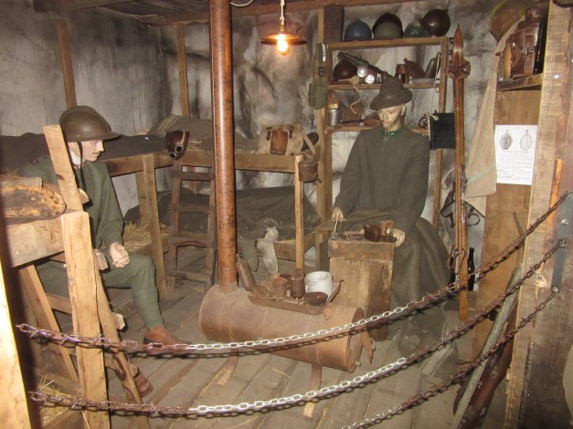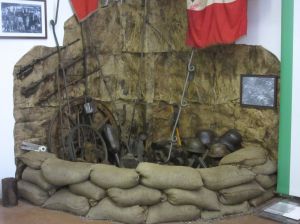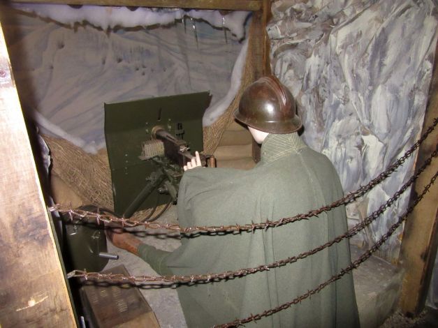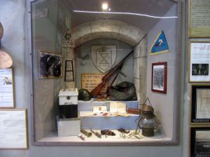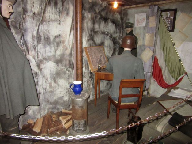 Il percorso didattico permanente può non partire laddove è cominciato tutto: l’attentato di Sarajevo, ricordato con una piccola vetrina in cui è esposta una pistola Browning FN 191O identica a quella utilizzata per l’assassinio dell’arciduca d’Austria. Il 28 giugno 1914. Manifesti e mappe possono aiutare ad inquadrare la situazione italiana ed europea ma in questa sezione introduttiva si vuole evidenziare anche l’alto tasso di arruolamento dell’Italia,uno dei più alti al mondo, la partecipazione femminile e gli obbiettivi strategici italiani ad inizio conflitto. Il tributo del Territorio alla guerra è ricordato da una parete che riporta gli attestati con le motivazioni per le decorazioni al valor militare dei figli di Montecchio Maggiore. Parte fondamentale del percorso è indubbiamente la ricostruzione della trincea sul Dente Italiano del Monte Pasubio. Realizzata con l’aiuto dei Ricostruttori Novalesi, la trincea si estende su oltre 120 metri quadri e intende rappresentare alcune delle caratteristiche tipiche di una vera trincea; dalla larghezza del percorso, circa 75 cm, fino agli ambienti allestiti, complessiva mente nove: la polveriera,la terra di nessuno, la piazzola da mitragliatrice, la baracca truppa,l’area rancio, la latrina, l’ufficio comando, l’infermeria,l’altare da campo. L’intera ricostruzione è cosparsa di cimeli originali e presenta dieci manichini in uniforme. Per rendere il percorso ancora più suggestivo sono stati predisposti effetti ottici,atti a ricreare un’atmosfera notturna e lunare, e acustici, con l’ululare del vento e i fragori della battaglia. Usciti dalla trincea il percorso prosegue con l’esposizione delle uniformi alleate durante la Grande Guerra. E’ un confronto interessante per il visitatore, che anche visivamente può rendersi conto delle differenze di equipaggiamenti tra l’inizio del conflitto ed il suo prosieguo; è infatti evidente ad esempio,come l’uniforme francese del 1914, priva di elmetto e senza nessuna accortezza per il mimetismo, differisca da quella statunitense del 1918. Due vetrine illustrano gli equipaggiamenti alleati ed italiani attraverso decine dì cimeli,armamenti e documenti,mentre alle pareti sono affissi espositori con strumenti da lavoro dei soldati, mappe e manifesti d’epoca oltre che alcune celebri copertine della Domenica del Corriere di· segnate dall’arzignanese Achille Beltrame. A seguire, la sezione dedicata agli Imperi Centralì , con maggiore rilevanza per gli equipaggia· menti austro ungarici. La parte conclusiva del percorso dedicato alla Grande Guerra abbraccia due temi: il primo quello delle perdite, con cimeli e documenti di grande Interesse emotivo. Il secondo verte della figura del tenente prima,e primo seniore poi Ferruccio Bonapace , unica Medaglia d’oro al Valor Militare di Montecchio Maggiore. La sua vicenda permette di avere un ponte ideale nel percorso museale, collegando la Grande Guerra, al Ventennio fascista Seconda Guerra Mondiale. Figura di indubbio interesse storico fu uno dei 2500 legionari fiumani nonché amico del celebre poeta, Gabriele D’Annunzio.