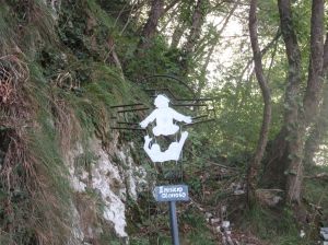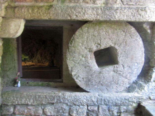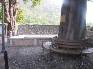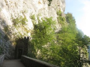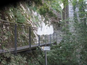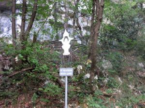 Allora si venne nella decisione di costruire lì una chiesuola. Vi era sempre però la grande difficoltà per i devoti di andarvi. Unico mezzo rimase per circa venti anni, calarsi giù dalle rocce con le funi dell’argano, mezzo impossibile per molti e pericoloso per tutti. Si pensò allora ad una strada. Ma come farla sulla nuda roccia? Questa era affatto impraticabile. Meno difficile era scendere dal dosso, che si protende al lato meridionale del luogo ove era la statua e diviso da esso da un vallone pietroso, che dal sommo del monte lo solca a picco fin giù al piano dell’Adige. In questo dosso le rocce sono interrotte da tratti boscosi curvantisi qua e là al dorso di mulo ed offerenti appigli al viandante….Di lì scesero i più animosi finché poterono scorgere la statua di fronte a loro sulla parete rocciosa a picco. Ma passare di lì non v’era nemmeno di tentarlo, perché impossibile inerpicarsi al di là di esso sulla roccia nuda. Perciò i più animosi si scoraggiarono e solo nella preghiera a Maria, che scoprisse il modo di arrivare a Lei, posero la propria fiducia. E Maria li aiutò. Narrano gli storici sopraccitati che nella notte dal duro macigno sorse un grande albero, che si piegava sopra la voragine fin all’opposta roccia, ed allargava così i rami poderosi da potersi sopra di essi gettare comodamente un ponte. Quell’albero, che sosteneva un ponte, fu notato anche da un naturalista del secolo XVI, Giovanni Pona…..A tale albero le popolazioni ascrivevano virtù miracolose chiamando “l’albero della Madonna”; perciò i numerosi pellegrini andavano a gara per asportarne pezzettini da conservare come reliquie nelle case e usarne per gli ammalati spediti dai medici. Ed a forza di tagliare pezzettini, si capisce cosa avvenne: un secolo dopo l’albero non v’era più. Solo se ne conservò una piccola reliquia, che ancora si può vedere nel tesoro del Santuario; al luogo poi del ponte di legno se ne costruisse uno di pietra”.