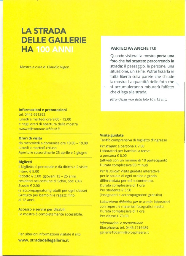 INFORMAZIONI E PRENOTAZIONI : Biosphaera : tel.0445-1716489 E-Mail : gallerie100anni@biosphaera.it