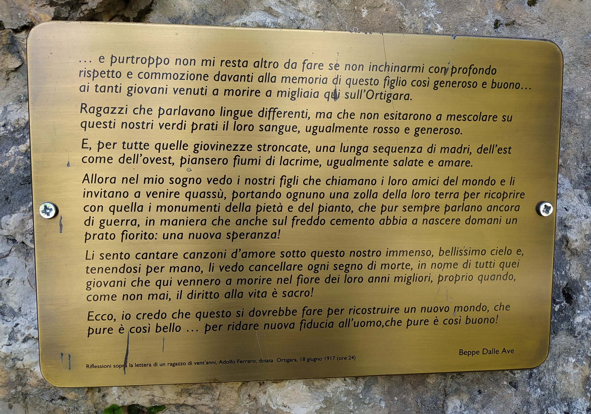 Questa volta sono qui per descrivere un evento che chi , come me , semplice montanaro o semplice escursionista ne va fiero , non sono ne accompagnatore ne guida , sono solo istruttore di trekking abilitato , ma questo conta poco davanti a qualcosa che si fa per passione vera, salire sull’Ortigara lo possono fare tutti , ma prendersi il tempo per alcune riflessioni su questo luogo unico e sacro non è ne da tutti ne per tutti , si ho detto sacro , perchè su ogni metro di terreno si calpesta una macchia di sangue versato nelle sanguinose battaglie che hanno reso celebre questo arduo monte dalle forme strane e deformato dalle granate e bombardamenti.