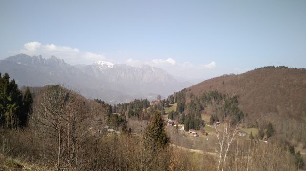Dopo aver lasciato l’auto in piazza della chiesa a San Quirico si prosegue verso la montagna Spaccata , Recoaro Mille , si sale sulla strada vecchia , dopo aver superato la stretta curva nella valletta si prosegue per circa 100 metri fino ad incontrare sulla destra una ripida salita asfaltata , la si prende e si continua a salire uscendo dalle case e imboccando una irta salita cementata , fino a raggiungere un’ampia radura prativa , da li si prosegue seguendo anche le indicazioni per la Cima Bocchese , dove recentemente è stata posizionata una croce che ammira il fondovalle della località Bonomini , si sale sul sentiero privo di difficolta tecniche , molto bello anche sotto il profilo del panorama , fino a raggiungere un bivio che porta in un piccolo cippo monumentale , che ti permette di ammirare uno spettacolare panorama , si continua a salire , con minore pendenza ed un sentiero piacevole fino ad arrivare in un dosso dove è stata costruita una bellissima baita , proseguendo si raggiunge l’omonima contrada Castagna ( Castegna in dialetto ) superato l’abitato si incrocia il bivio per la cima Bocchese e Passo Giochele situato sul versante della Valle del Monte Spitz , il sentiero qui è fantastico soprattutto nella primavera con l’avvento delle fioriture , si prosegue in numerosi salie scendi di modesta difficoltà fino ad arrivare in località Busati .