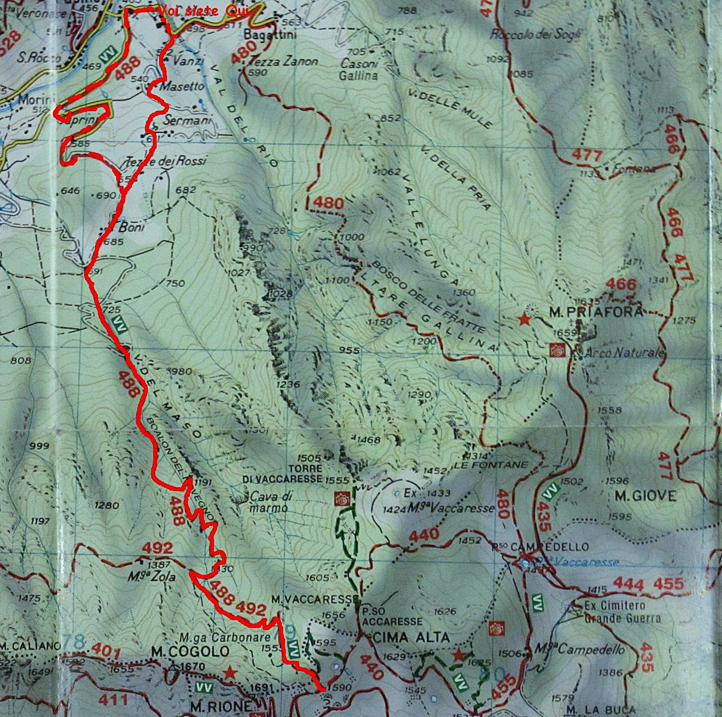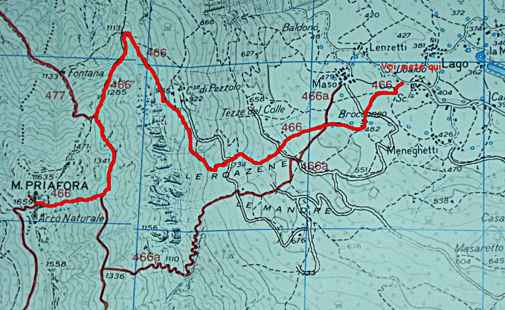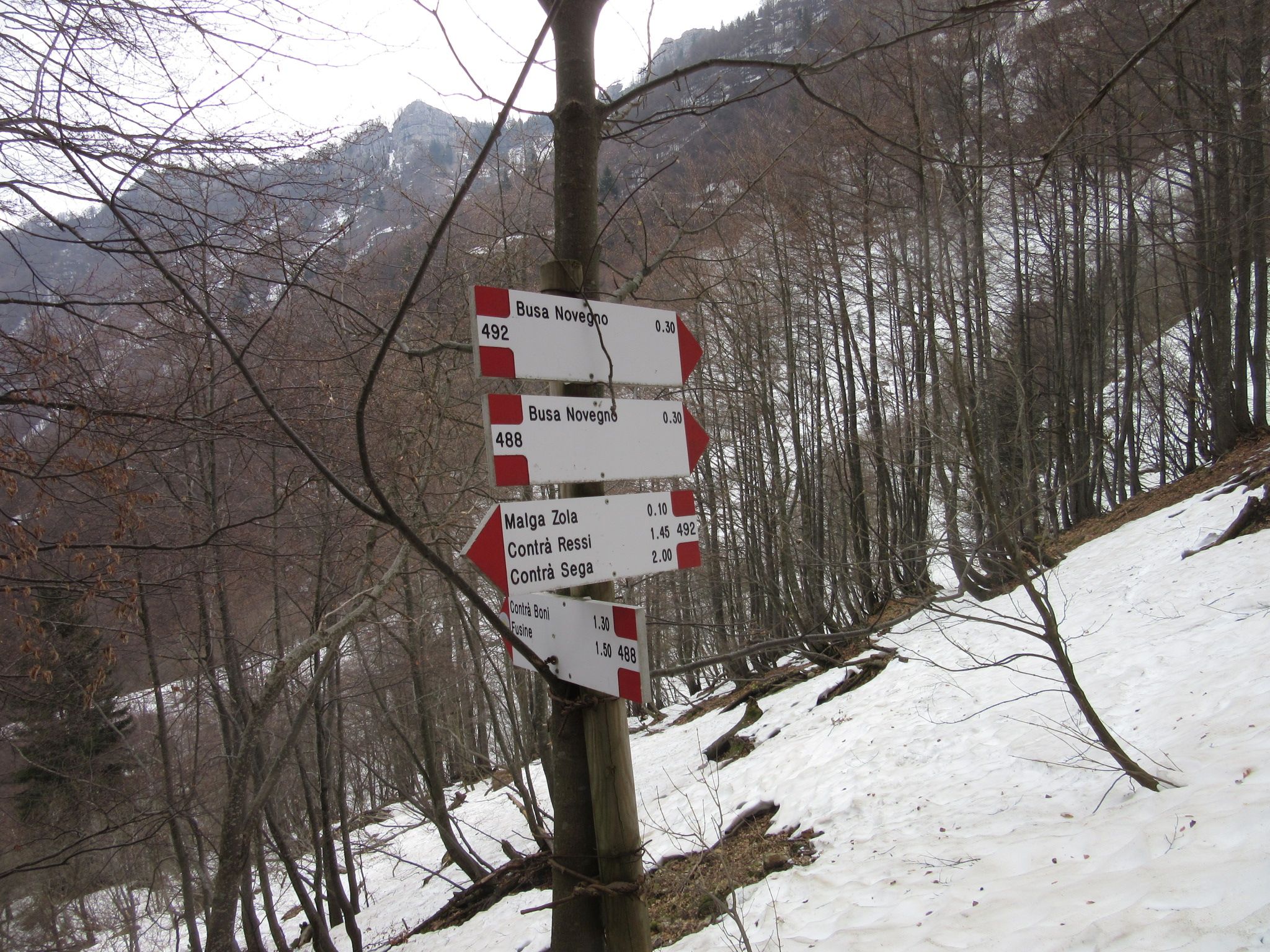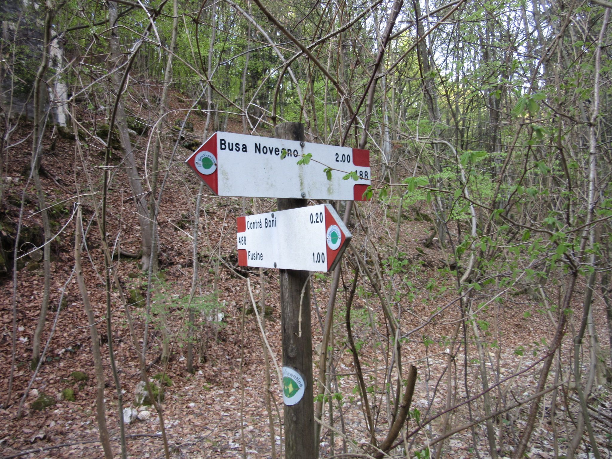 Dopo aver superato l’abitato di Arsiero si prosegue verso la Valle di Posina , arrivati a Castana si mantiene la sinistra per Posina fino a raggiungere località Fusine dove e presente un piccolo Museo della Guerra , superato sulla sinistra un piccolo negozio di alimentari si può mettere l’auto e proseguire a piedi per la chiesa di Fusine dove a destra parte il sentiero 488 .Voglio segnalare che il sentiero tratteggiato sulla mappa e quello ufficiale , ma io invito a percorrere quello segnalato fisicamente sul posto (LA SEGNALAZIONE DELLA PRIMA PARTE NON E COMPATIBILE CON QUELLA REALE ). Questo sentiero e poco praticato e presenta una pendenza interessante sotto il profilo fisico , in realtà a come se fosse un boale ,Boalòn del Novegno un canale detritico che porta fino alla Busa del Novegno proprio di fianco a Forte Rione situato sulla destra . Il sentiero molto bello e vario in un’ambiente quasi selvaggio ma proprio per questo motivo diventa interessante da percorrere , e abbastanza segnalato anche se molto intuitivo e nell’ultima parte e quasi impossibile da sbagliare , anche se in mancanza di segnavia , per discendere si può usare il 480 . A me dire il vero è piaciuto molto anche se devo dire di averlo percorso con un pò di neve ne ha aumentato la difficoltà notevolmente .