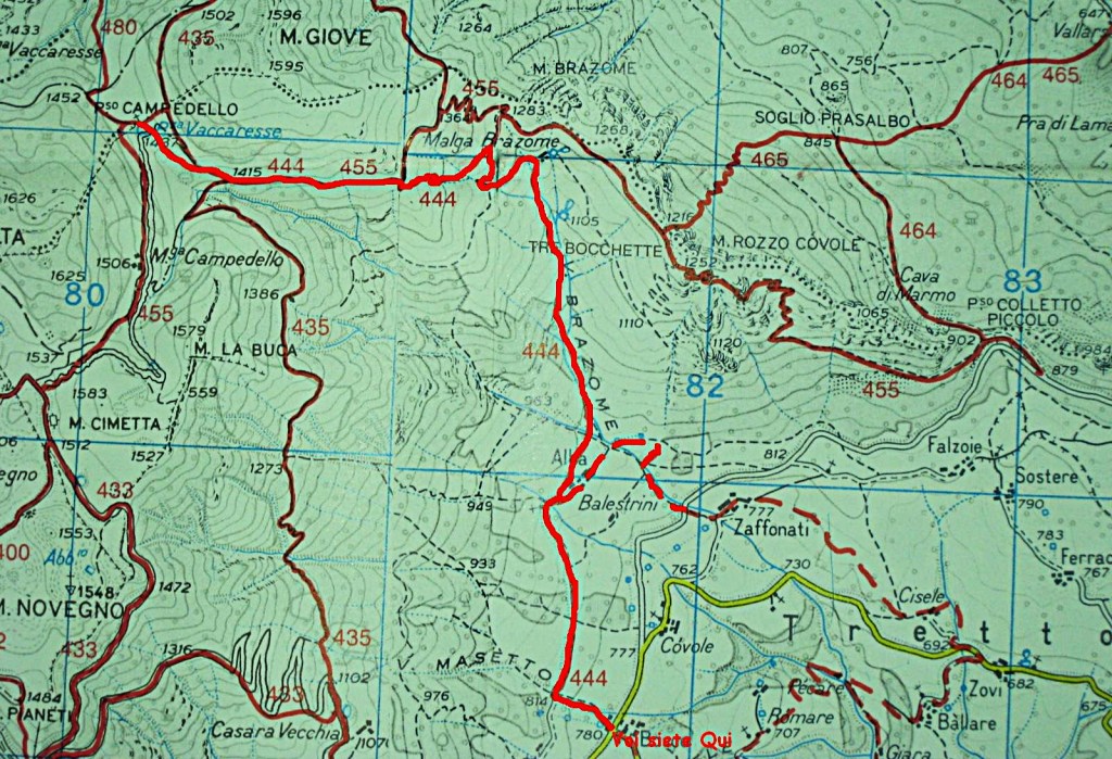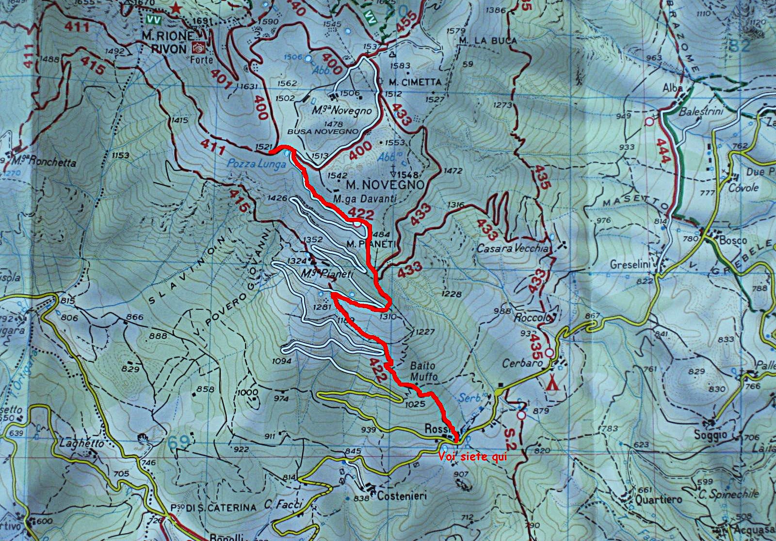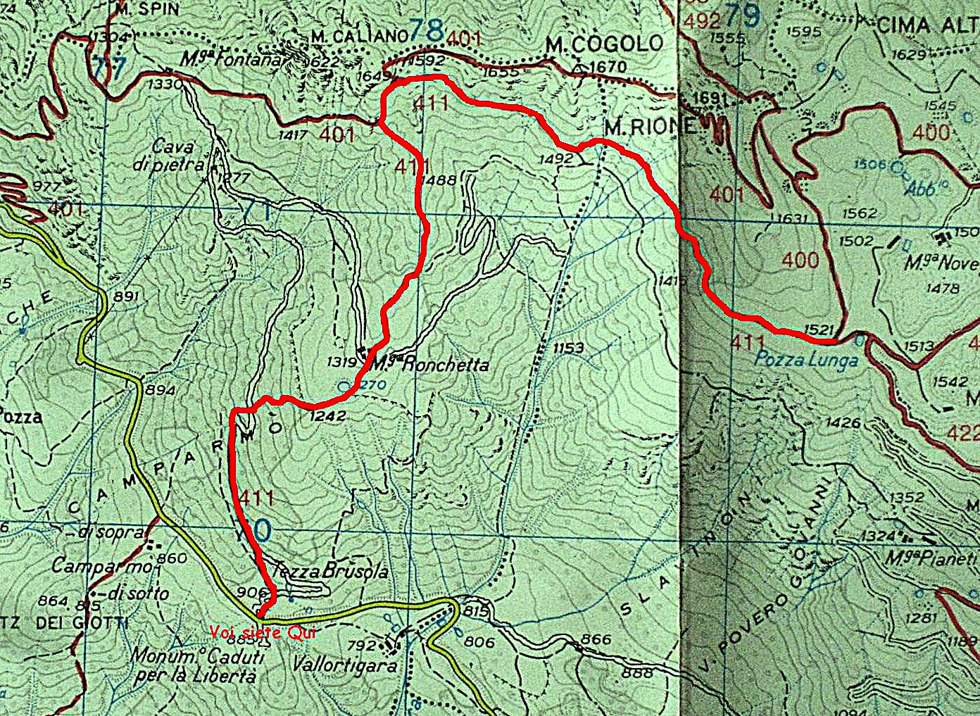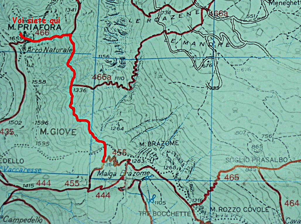 Dopo aver superato l’abitato di Arsiero si prosegue verso la Valle di Posina , arrivati a Castana si mantiene la sinistra per Posina fino a raggiungere località Fusine dove e presente un piccolo Museo della Guerra , superato sulla sinistra un piccolo negozio di alimentari si può mettere l’auto e proseguire a piedi per la chiesa di Fusine dove a destra parte il sentiero 488 .Voglio segnalare che il sentiero tratteggiato sulla mappa e quello ufficiale , ma io invito a percorrere quello segnalato fisicamente sul posto (LA SEGNALAZIONE DELLA PRIMA PARTE NON E COMPATIBILE CON QUELLA REALE ). Questo sentiero e poco praticato e presenta una pendenza interessante sotto il profilo fisico , in realtà a come se fosse un boale ,Boalòn del Novegno un canale detritico che porta fino alla Busa del Novegno proprio di fianco a Forte Rione situato sulla destra . Il sentiero molto bello e vario in un’ambiente quasi selvaggio ma proprio per questo motivo diventa interessante da percorrere , e abbastanza segnalato anche se molto intuitivo e nell’ultima parte e quasi impossibile da sbagliare , anche se in mancanza di segnavia , per discendere si può usare il 480 . A me dire il vero è piaciuto molto anche se devo dire di averlo percorso con un pò di neve ne ha aumentato la difficoltà notevolmente .