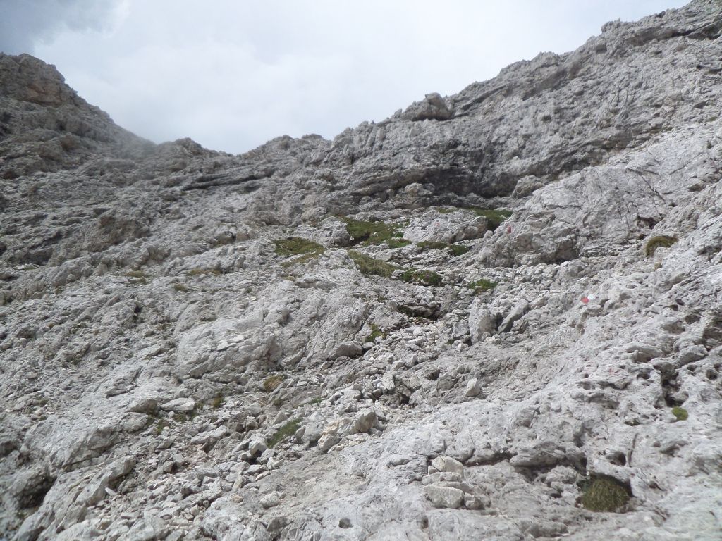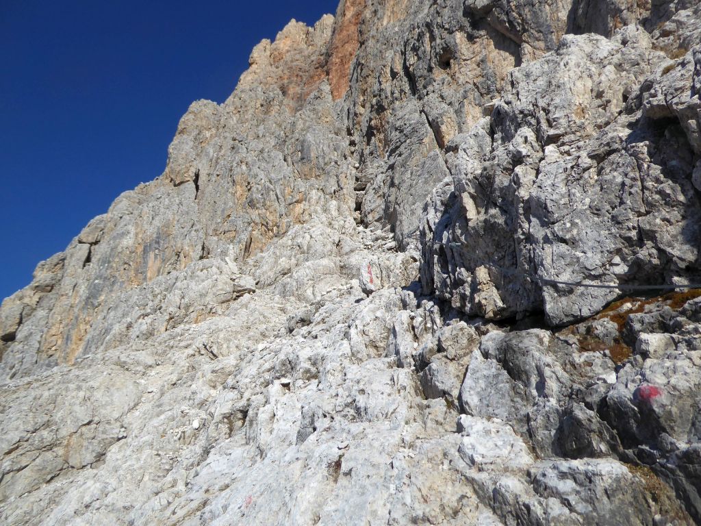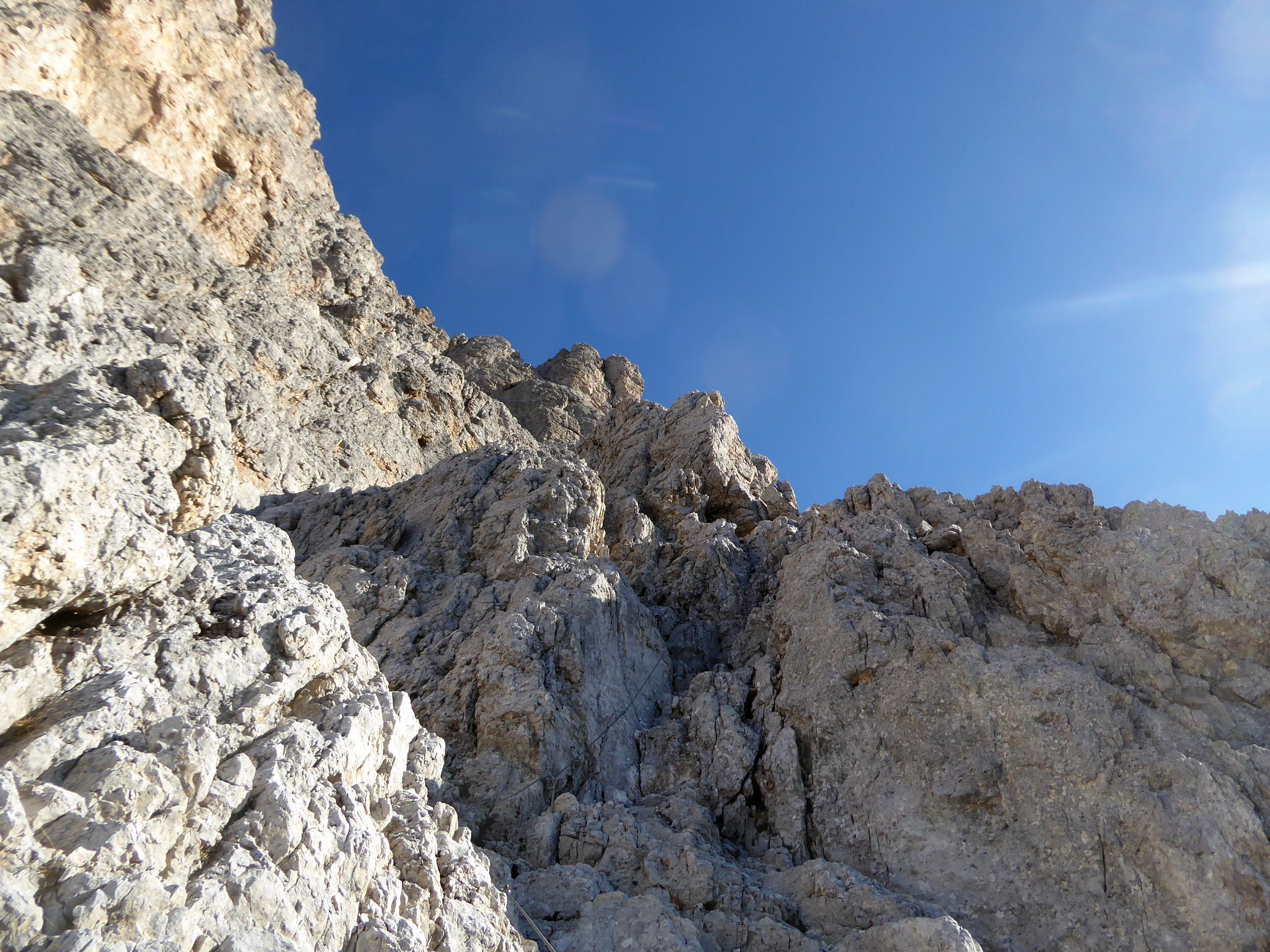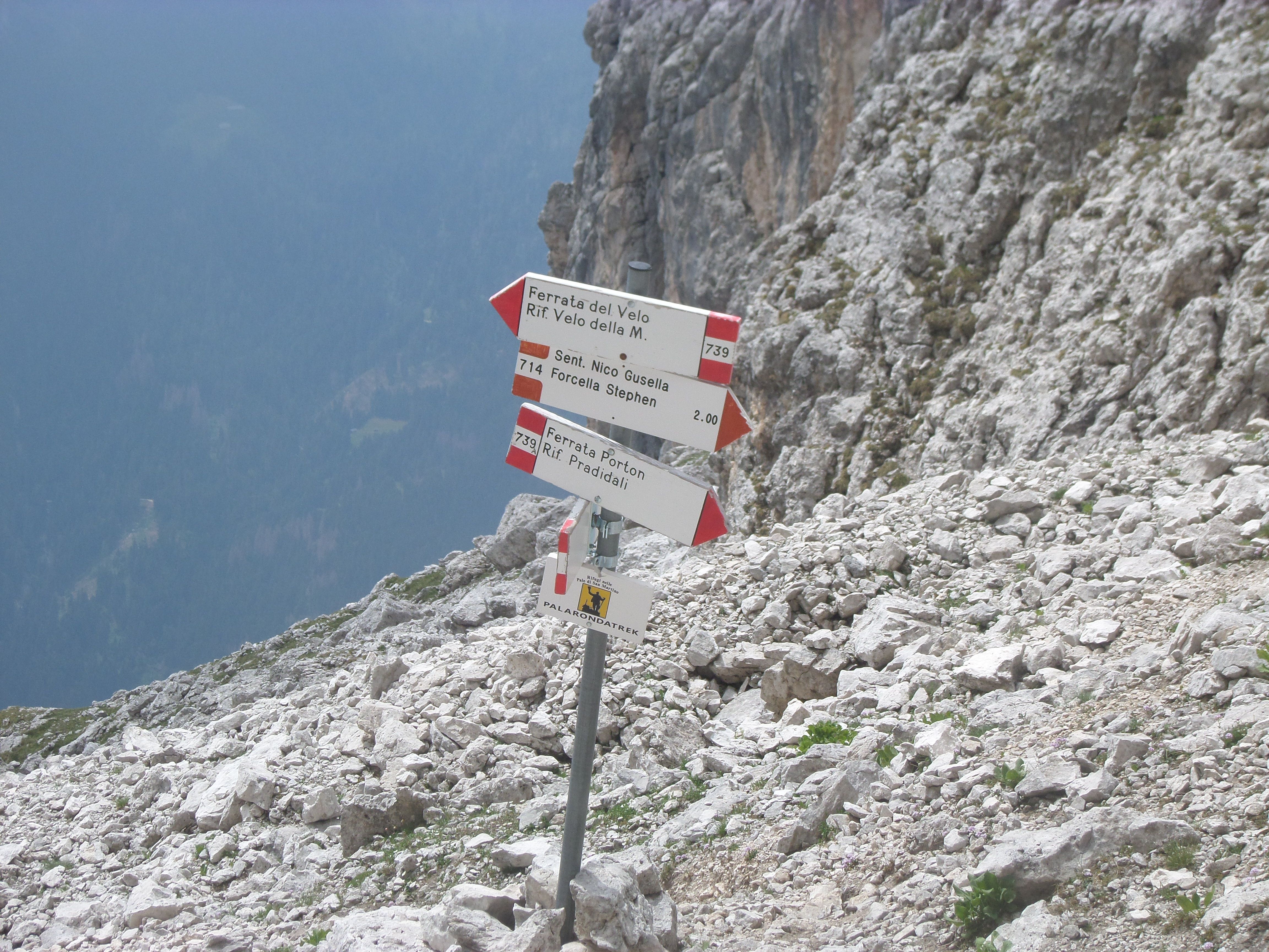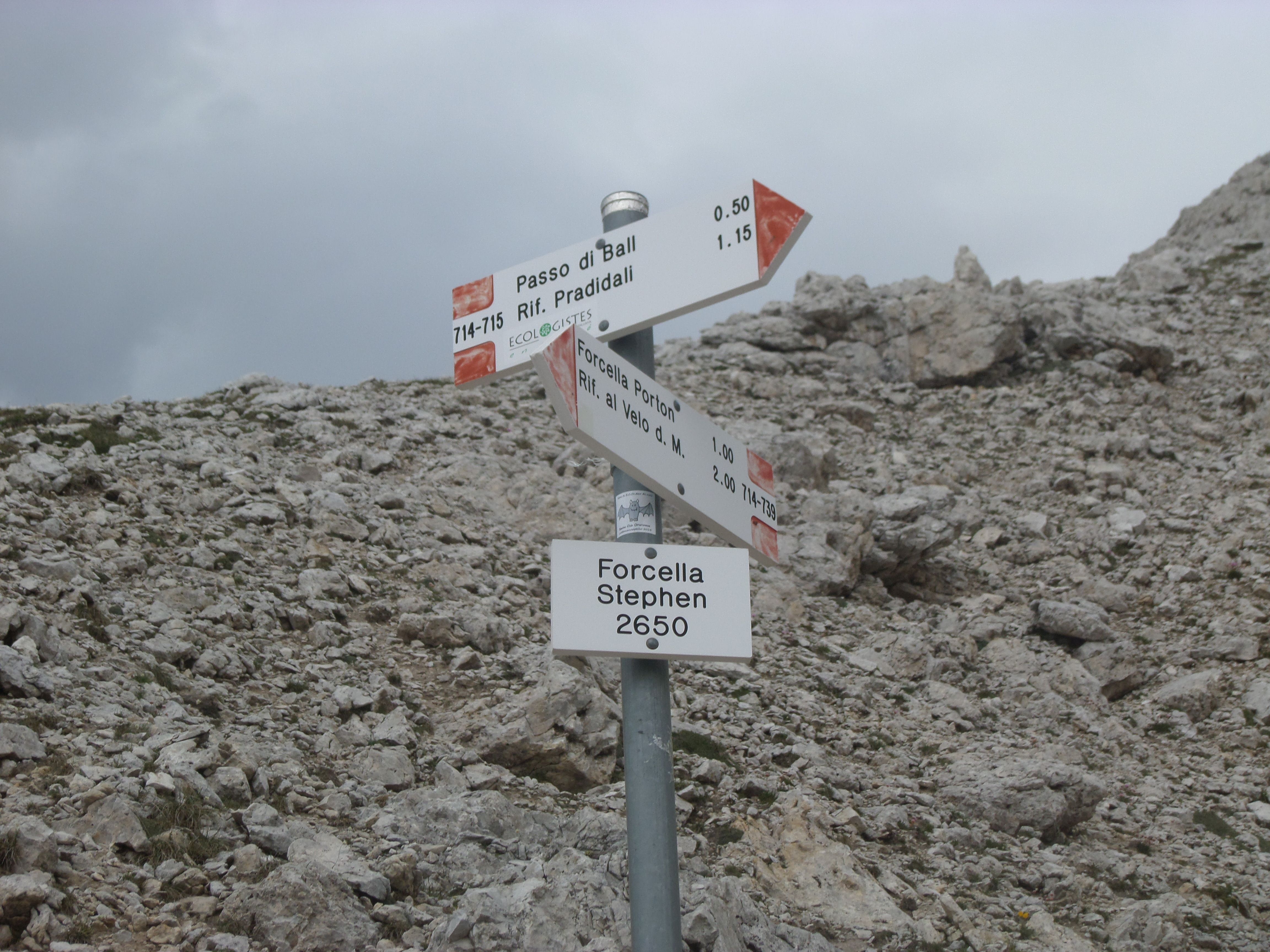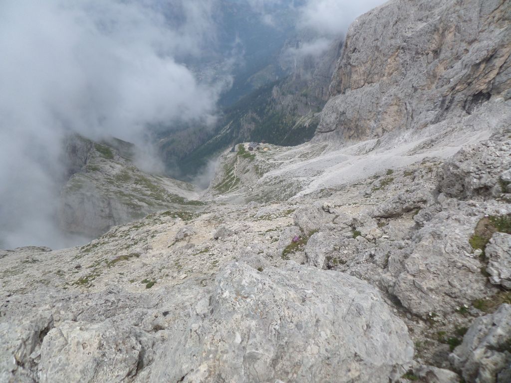 Ho proseguito poi per la via ferrata del Velo che porta verso la forcella del Porton a 2600 m e dove arriva anche la Ferrata del Porton che sale dal Rifugio Pradidali 2278 m dove volendo si può scendere per accorciare il percorso , ma il mio itinerario prevedeva di allungare fino al rifugio Rosetta 2581 m , iniziando così a salire ripidamente attraverso un vasto prato fino alla forcella Campanile Col di Roda 2605 m, per poi attraverso passaggi trasversali sotto la Cima di Ball e sali scendi attrezzati salire fino alla Forcella Stephen 2705 m per poi scendere sempre in percorso attrezzato impervio e quasi lunare fino al Passo di ball 2443 m , proseguendo per il sentiero molto bello e pianeggiante per poi inerpicarsi di nuovo raggiunto il Col della Fede 2278 m in un tratto roccioso con il sentiero 702 che proviene da San Martino di Castrozza , e raggiungendo prima il Passo di Val della Roda 2580 m e il Rifugio Rosetta a 2581 m in un paesaggio che ha veramente qualcosa di incredibile una specie di altipiano roccioso che pare di essere sulla luna .