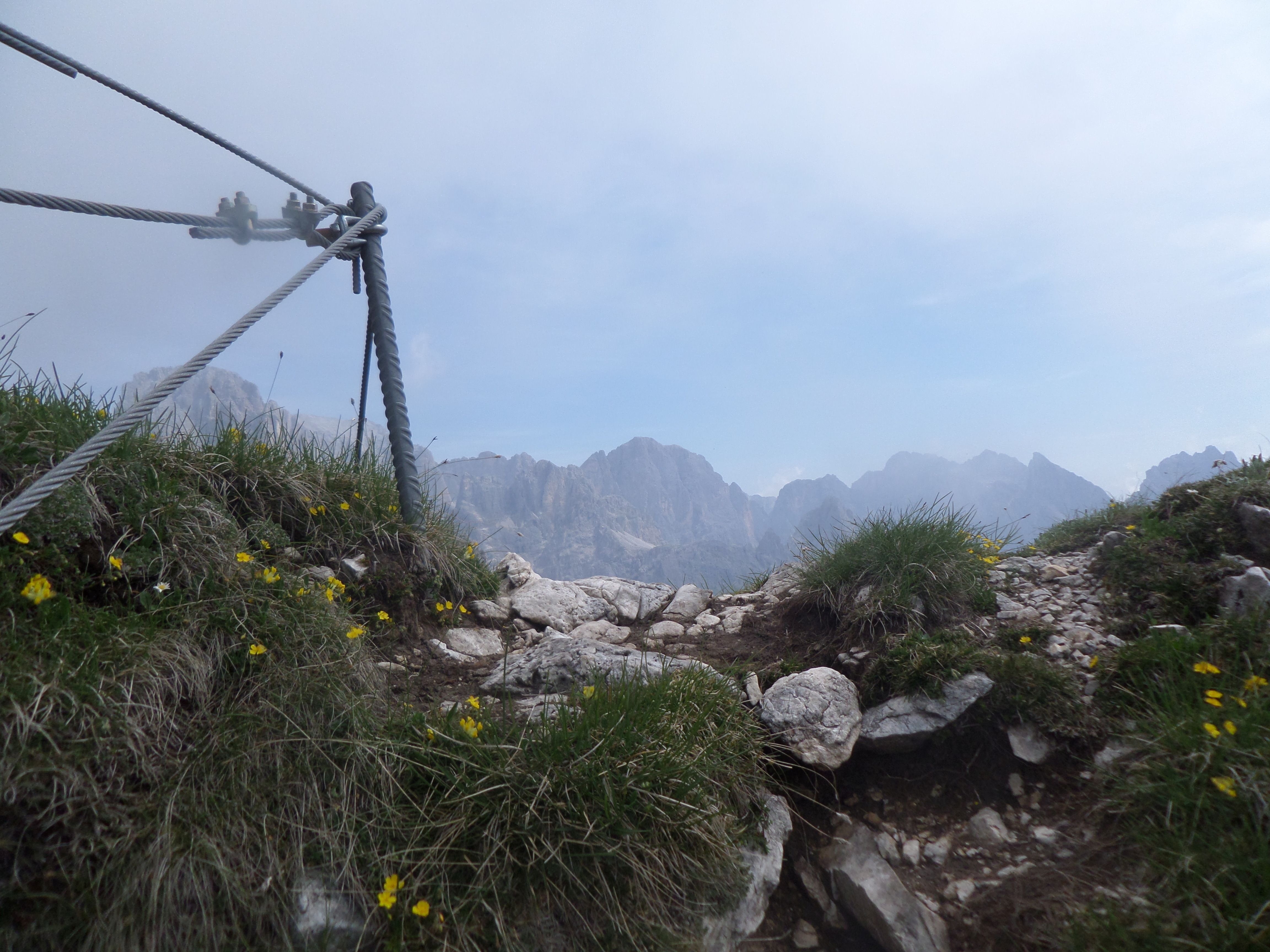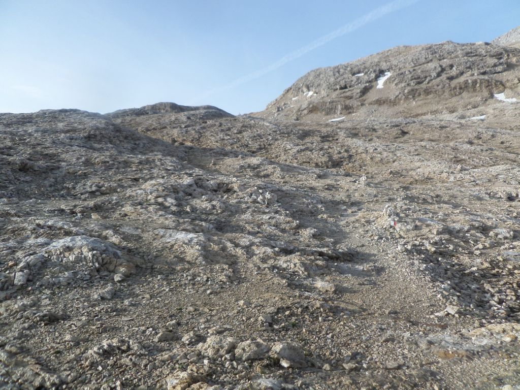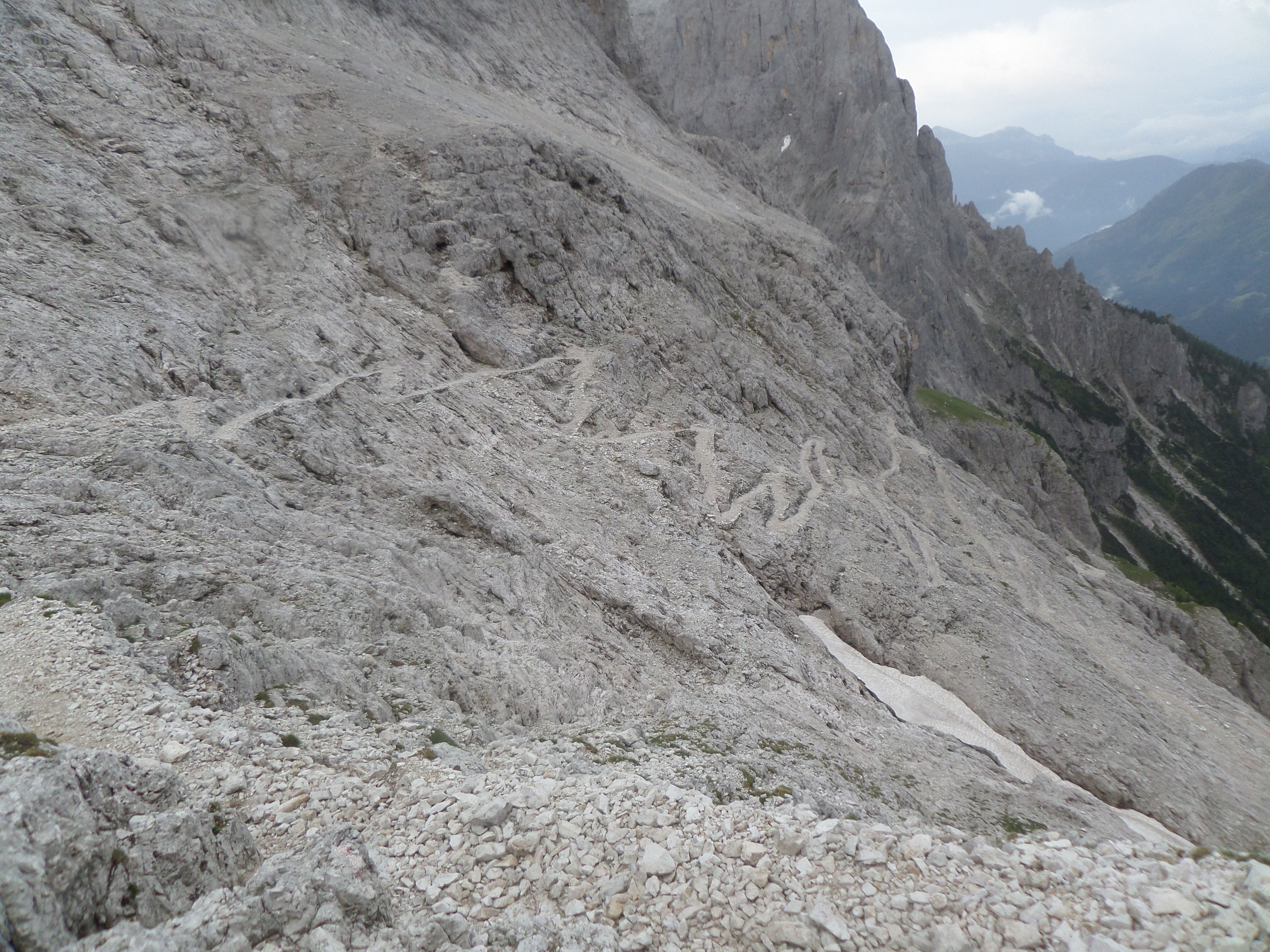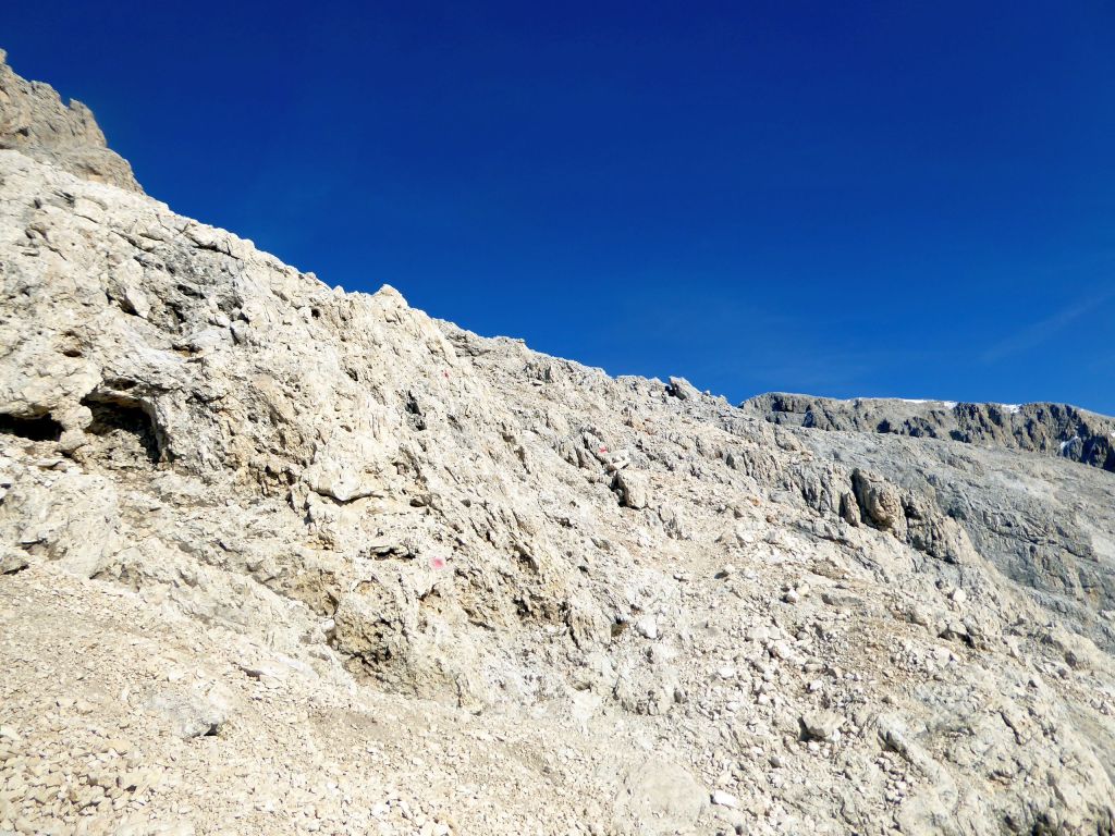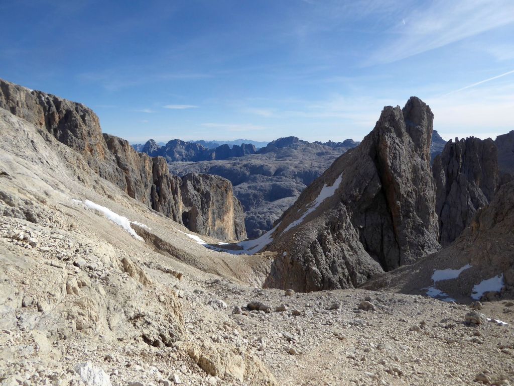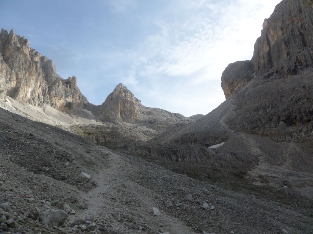 Ho proseguito poi per la via ferrata del Velo che porta verso la forcella del Porton a 2600 m e dove arriva anche la Ferrata del Porton che sale dal Rifugio Pradidali 2278 m dove volendo si può scendere per accorciare il percorso , ma il mio itinerario prevedeva di allungare fino al rifugio Rosetta 2581 m , iniziando così a salire ripidamente attraverso un vasto prato fino alla forcella Campanile Col di Roda 2605 m, per poi attraverso passaggi trasversali sotto la Cima di Ball e sali scendi attrezzati salire fino alla Forcella Stephen 2705 m per poi scendere sempre in percorso attrezzato impervio e quasi lunare fino al Passo di ball 2443 m , proseguendo per il sentiero molto bello e pianeggiante per poi inerpicarsi di nuovo raggiunto il Col della Fede 2278 m in un tratto roccioso con il sentiero 702 che proviene da San Martino di Castrozza , e raggiungendo prima il Passo di Val della Roda 2580 m e il Rifugio Rosetta a 2581 m in un paesaggio che ha veramente qualcosa di incredibile una specie di altipiano roccioso che pare di essere sulla luna .