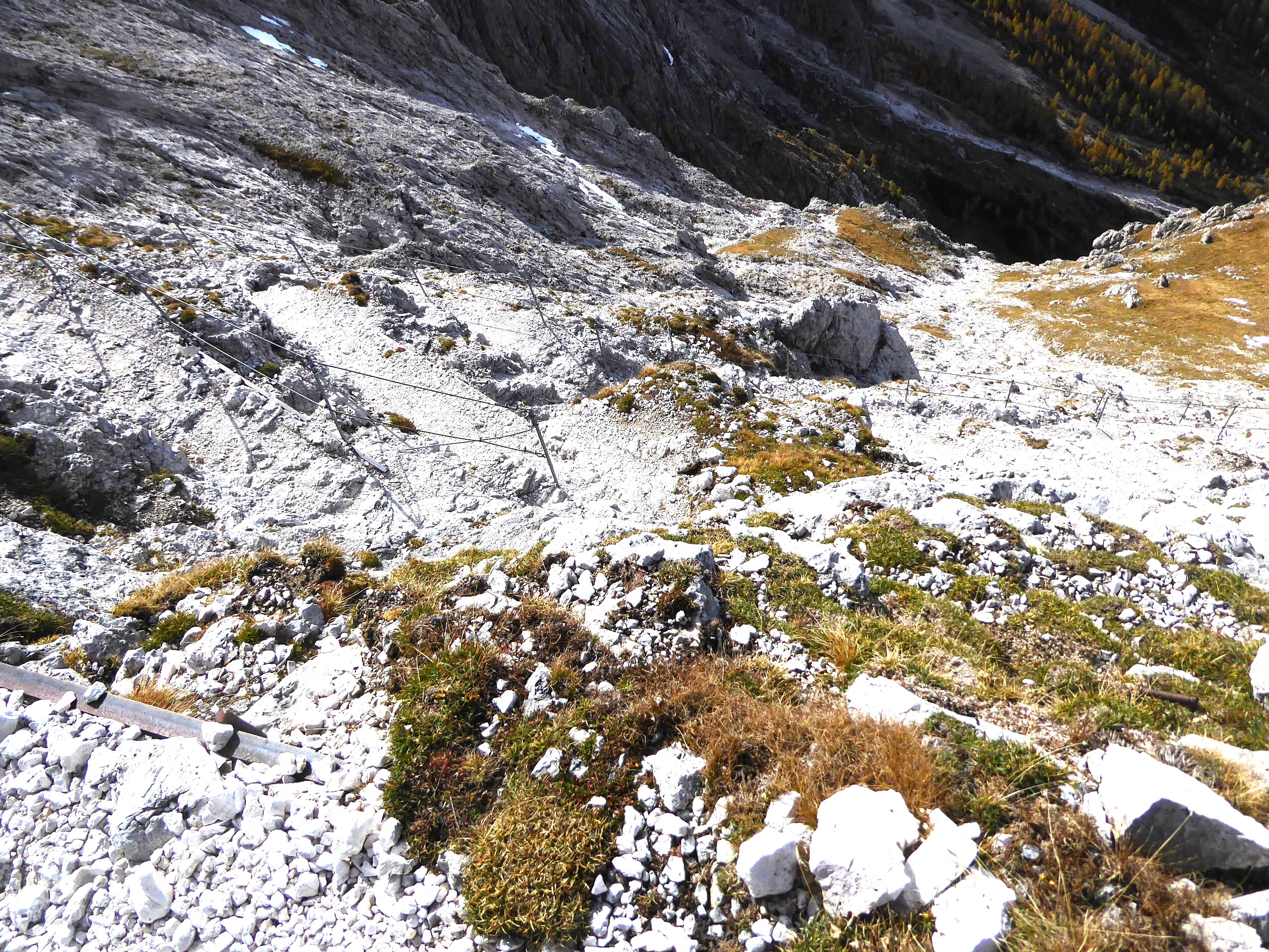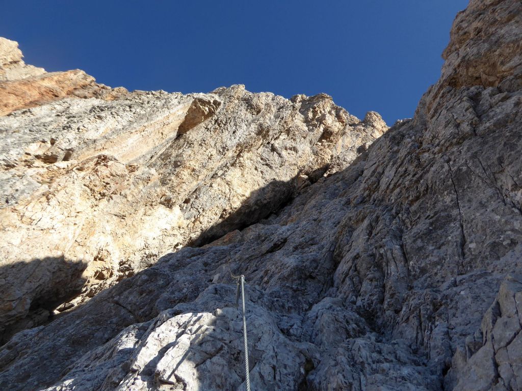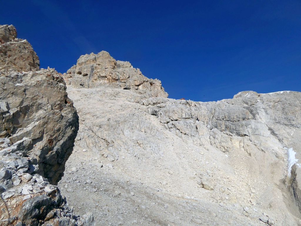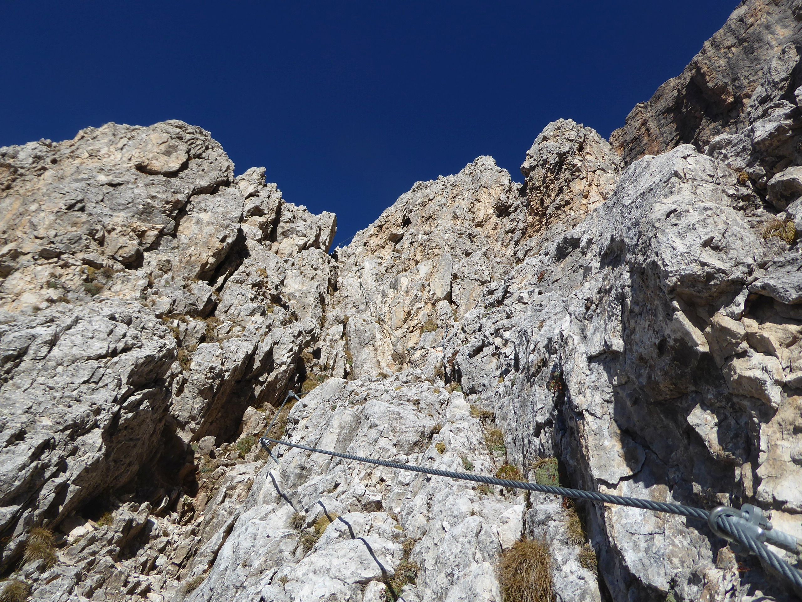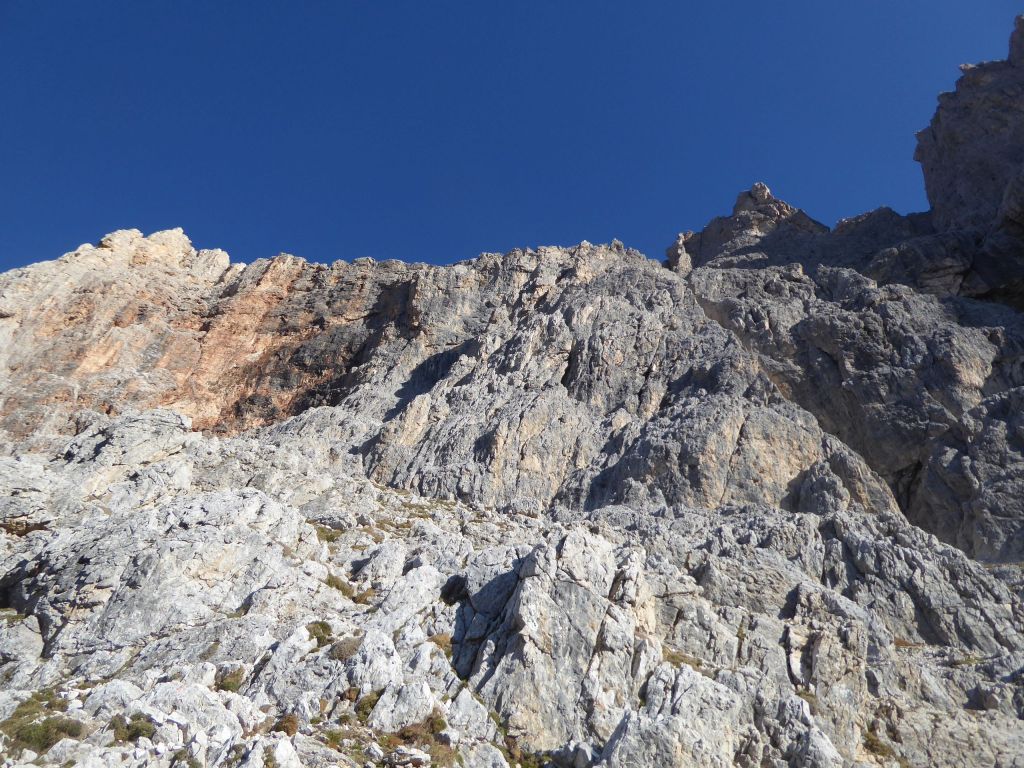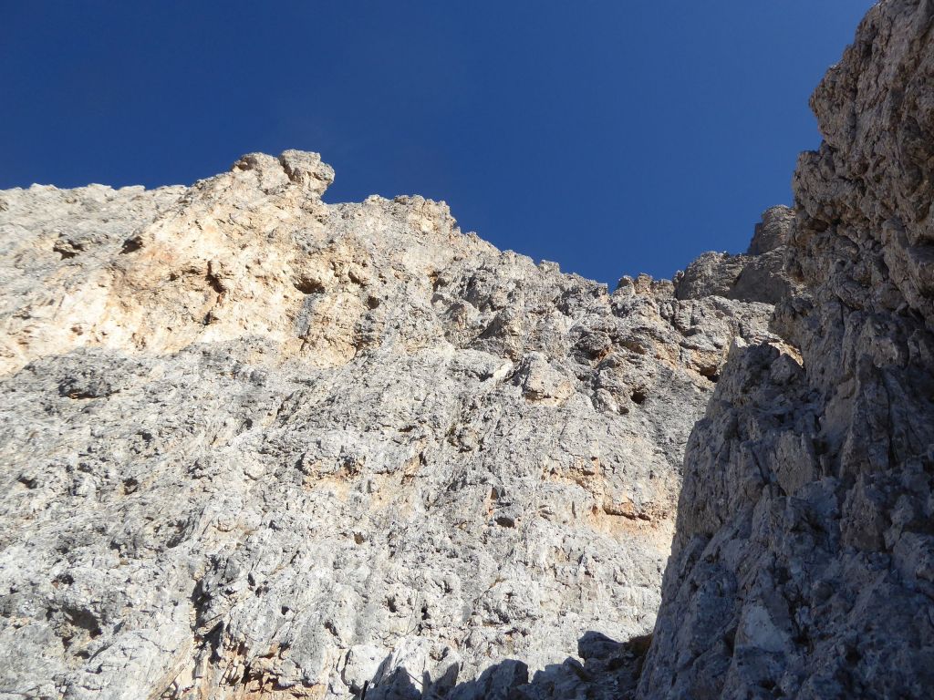 Ho proseguito poi per la via ferrata del Velo che porta verso la forcella del Porton a 2600 m e dove arriva anche la Ferrata del Porton che sale dal Rifugio Pradidali 2278 m dove volendo si può scendere per accorciare il percorso , ma il mio itinerario prevedeva di allungare fino al rifugio Rosetta 2581 m , iniziando così a salire ripidamente attraverso un vasto prato fino alla forcella Campanile Col di Roda 2605 m, per poi attraverso passaggi trasversali sotto la Cima di Ball e sali scendi attrezzati salire fino alla Forcella Stephen 2705 m per poi scendere sempre in percorso attrezzato impervio e quasi lunare fino al Passo di ball 2443 m , proseguendo per il sentiero molto bello e pianeggiante per poi inerpicarsi di nuovo raggiunto il Col della Fede 2278 m in un tratto roccioso con il sentiero 702 che proviene da San Martino di Castrozza , e raggiungendo prima il Passo di Val della Roda 2580 m e il Rifugio Rosetta a 2581 m in un paesaggio che ha veramente qualcosa di incredibile una specie di altipiano roccioso che pare di essere sulla luna .