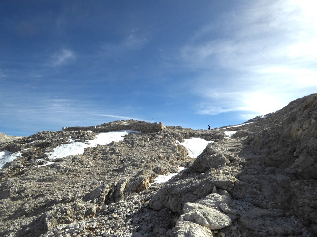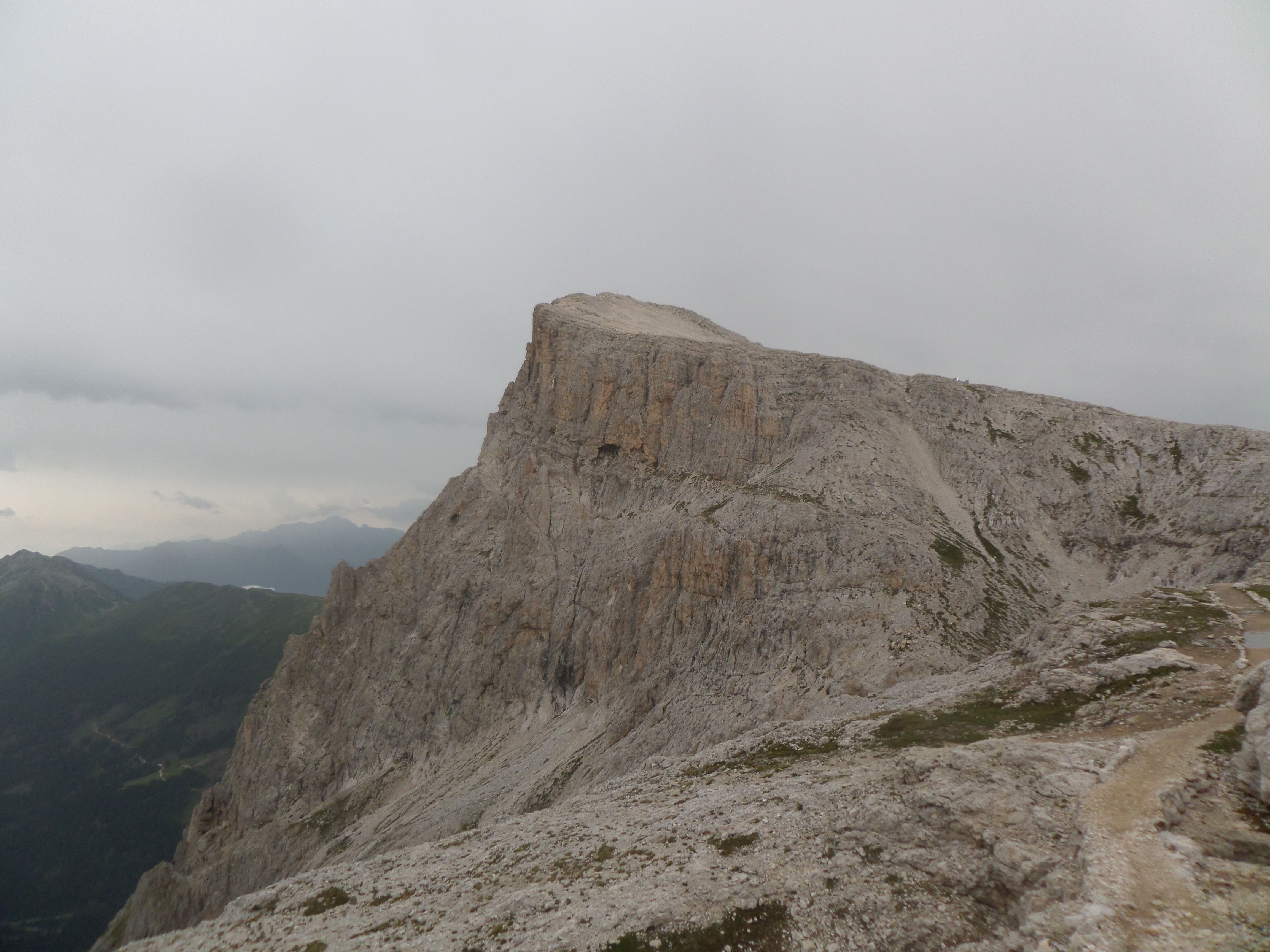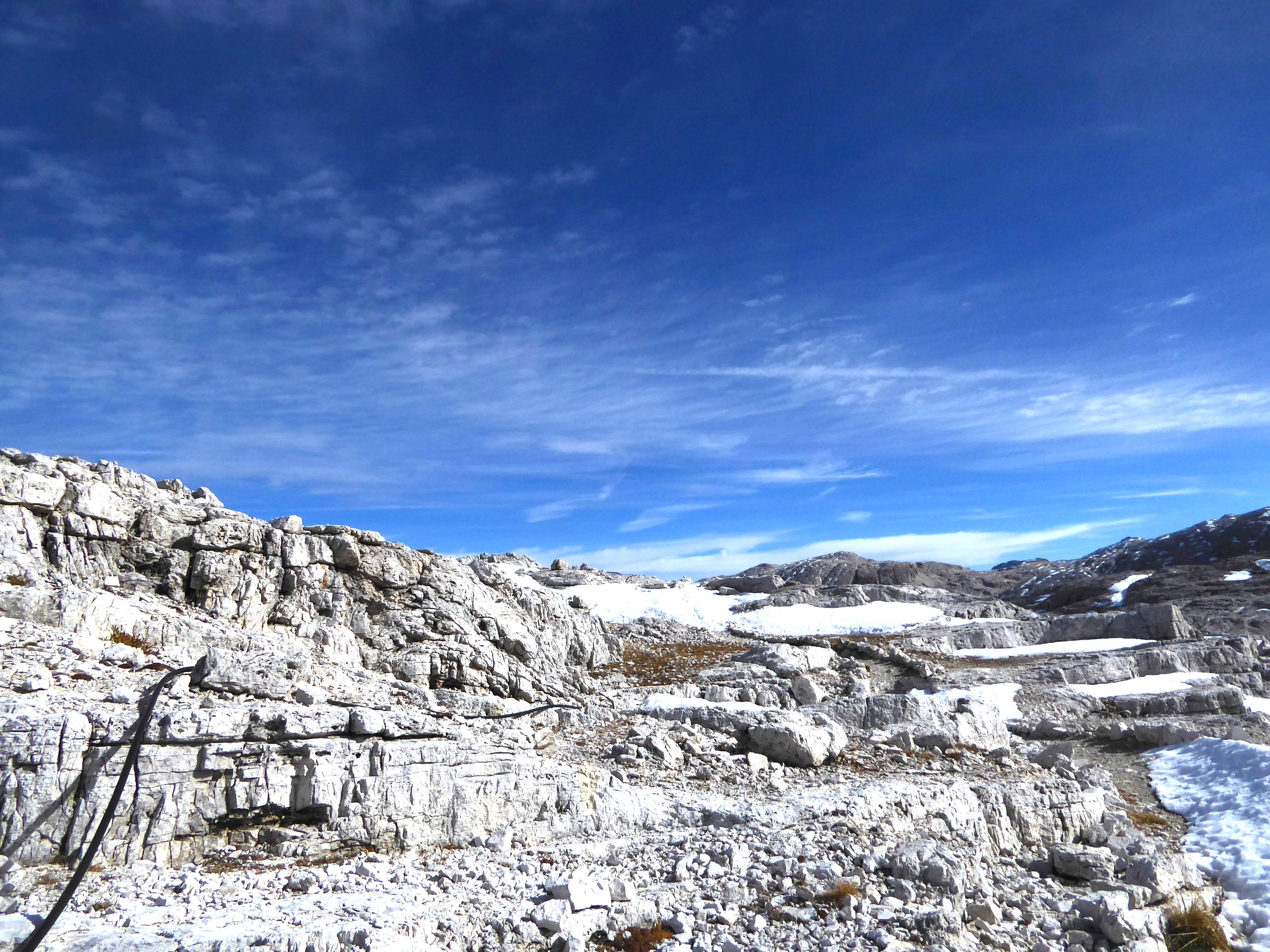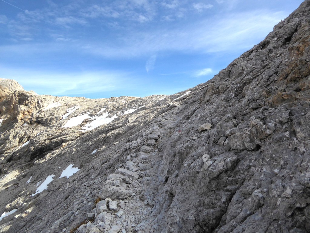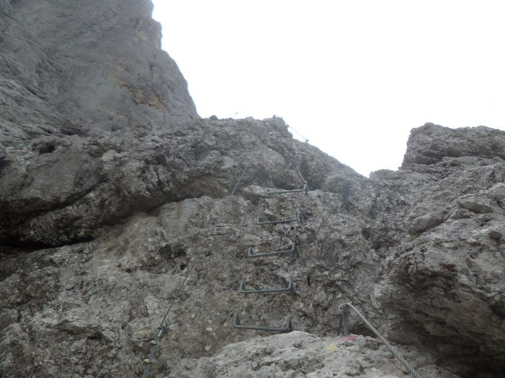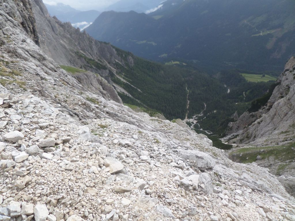 Ho proseguito poi per la via ferrata del Velo che porta verso la forcella del Porton a 2600 m e dove arriva anche la Ferrata del Porton che sale dal Rifugio Pradidali 2278 m dove volendo si può scendere per accorciare il percorso , ma il mio itinerario prevedeva di allungare fino al rifugio Rosetta 2581 m , iniziando così a salire ripidamente attraverso un vasto prato fino alla forcella Campanile Col di Roda 2605 m, per poi attraverso passaggi trasversali sotto la Cima di Ball e sali scendi attrezzati salire fino alla Forcella Stephen 2705 m per poi scendere sempre in percorso attrezzato impervio e quasi lunare fino al Passo di ball 2443 m , proseguendo per il sentiero molto bello e pianeggiante per poi inerpicarsi di nuovo raggiunto il Col della Fede 2278 m in un tratto roccioso con il sentiero 702 che proviene da San Martino di Castrozza , e raggiungendo prima il Passo di Val della Roda 2580 m e il Rifugio Rosetta a 2581 m in un paesaggio che ha veramente qualcosa di incredibile una specie di altipiano roccioso che pare di essere sulla luna .