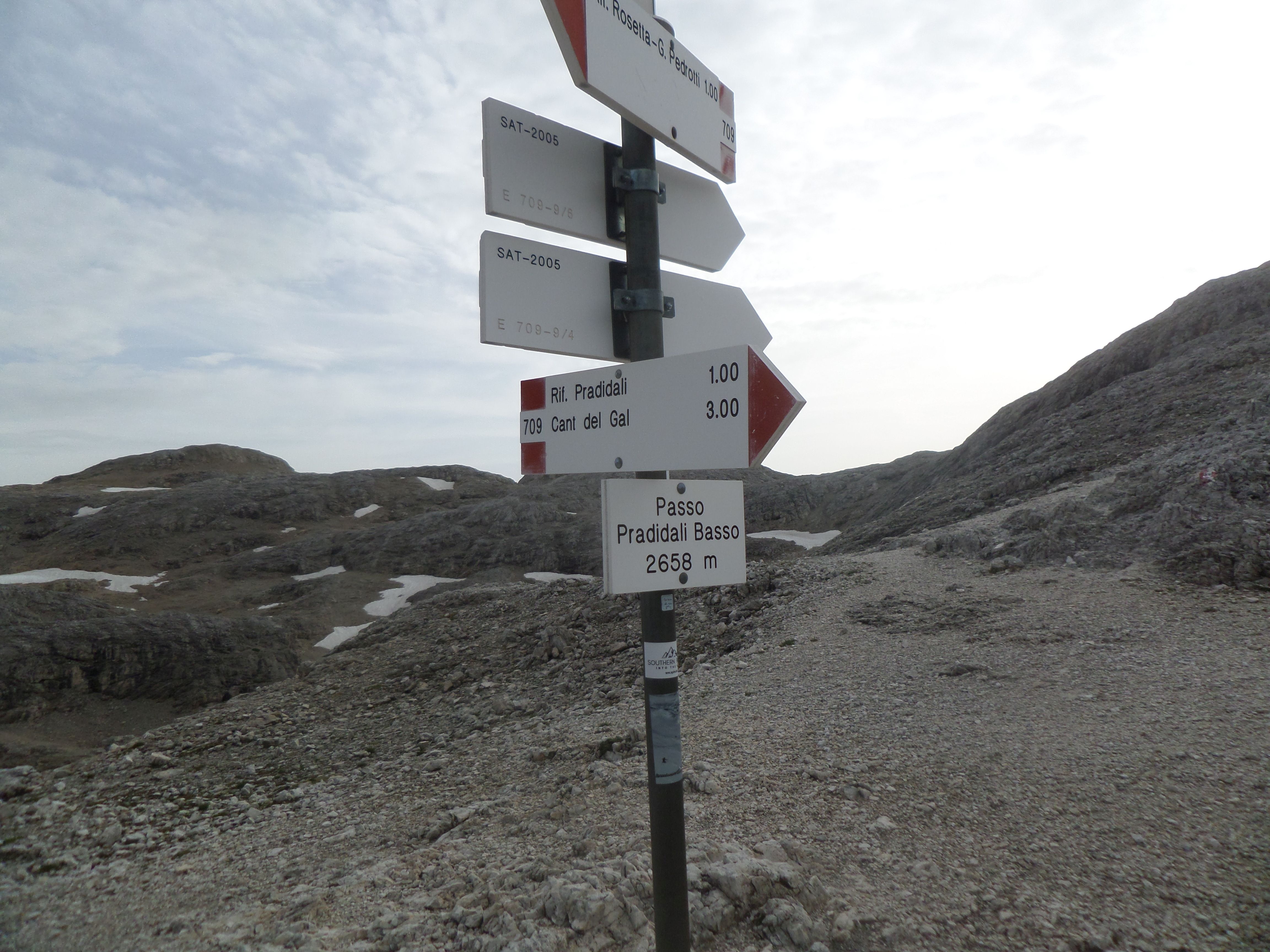 Ore 7.00 si parte per il rientro dalla Luna o semplicemente quello che sembrava l’altipiano dove era posizionato il Rifugio Rosetta-Pedrotti 2581 m si prende il 707 che attraverso numerosi sali e scendi ti porta a percorrere tutto questo immenso luogo fino a raggiungere il Passo Pradidali basso 2658 m , per ammirare in lontananza il resto del ghiacciaio della Fradustra , per poi imboccare il vallone che porterà fino al rifugio Pradidali in posizione dominante sul Vallone che porta a Pedemonte e attraverso il Prato di Cimerlo fino al Chalet Piereni. Dove si può anche gustare un buon pranzo.