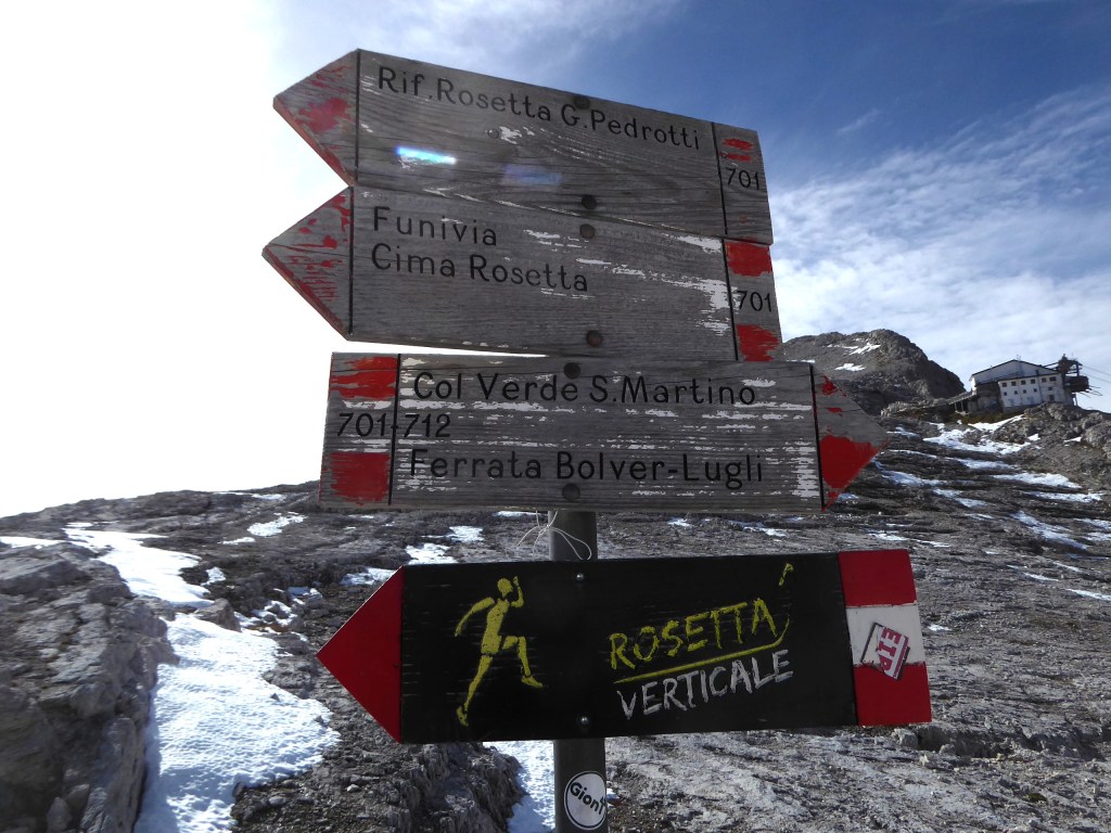 Anche se il sentiero non è segnalato come difficile io, un occhio di riguardo nel percorrerlo lo avrei, il sentiero parte dapprima su una piccola carrabile che porta ad imboccare al bivio il sentiero n.725 del Cacciatore volendo seguire una traccia segnalata nelle cartine ufficiali poi raggiunto il bivio si andrebbe ad imboccare il n.701, risulta più conveniente salire dalle stazione di partenza della funivia Colverde . Il dislivello è importante e presenta alcuni tratti attrezzati con corda anche se non necessitano l’uso di imbrago. Dalla partenza della funivia del Colverde si imbocca il sentiero 701, che presenterà un primo tratto prativo sulle piste da sci che con poca pendenza porterà fino alla stazione di arrivo di Colverde, raggiunta la funivia di scambio che porterebbe a pochi metri da Cima Rosetta, il sentiero comincia a salire più ripido tra mughi e larici, per alcuni tornanti, fino ad arrivare sotto le creste della cima Corona e fino a raggiungere il bivio con la ferrata Bolver-Lugli. I suoi imponenti zig-zag su un terreno molto detritico e ghiaioso ti portano in mezzo alle rocce di un colore unico, il sentiero si inerpica severo su ripidi pendii con numerosi parti attrezzate da cordini , ed alcuni veri e propri corrimano passando poi vicino ad un traliccio della funivia, il sentiero si fa ripido e bisogna prestare molta attenzione, fino a raggiungere l’ultimo tratto in cui la pendenza molla un pò è lascia lo spazio al pianoro dove in mezzo si potrà ammirare il rifugio Rosetta Pedrotti immerso in un scenario unico che ti entra dentro e ti scatena infinite ed incredibili emozioni. Lo scenario delle Pale di San Martino è qualcosa di una bellezza unica ed ineguagliabile. La salita anche se severa e difficile porta in un luogo indefinibile sotto il profilo panoramico e della maestosità delle sue creste e cime che intorno al rifugio Rosetta , al ghiacciaio della Fradusta si spazia in un scenario lunare