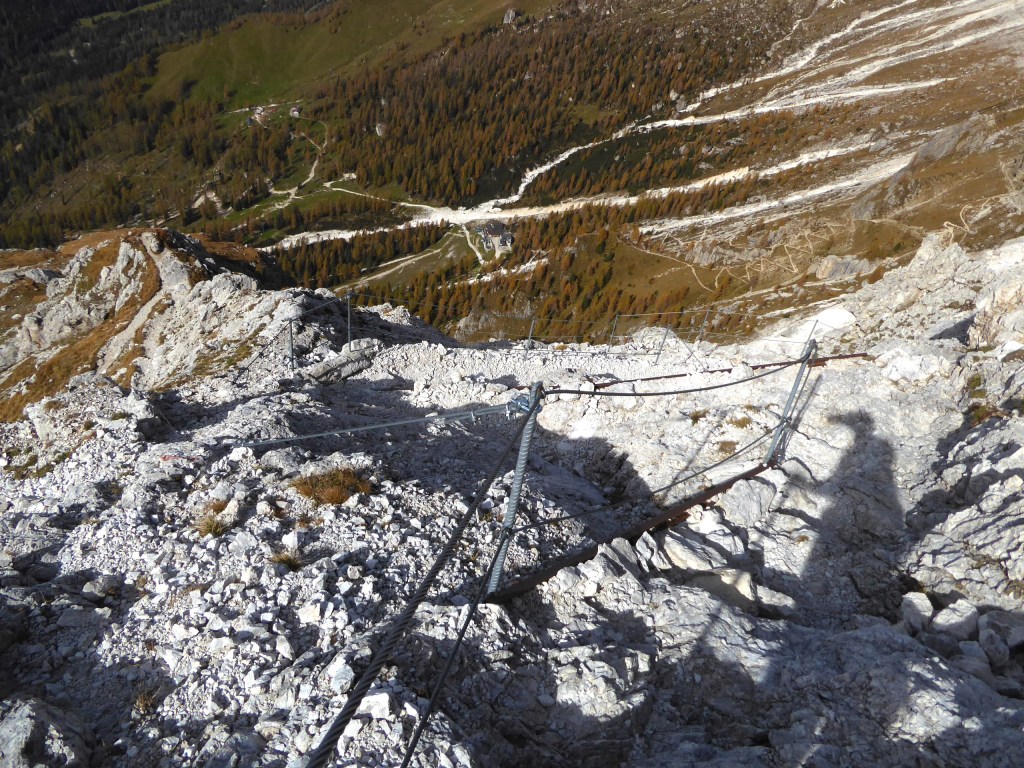 Imboccato il sentiero 701 che sale sul Col Verde dove si potrebbe salire anche in funivia, se aperta, si imbocca poi il segnavia 706, che sale diretto fino all’imbocco della ferrata, in circa 1h30-2h,il dislivello della ferrata è di 455 m , ma se si parte da San Martino si parla di 1485 m, il percorso è molto bello , con tratti attrezzati ed alcuni percorribili senza corda , ma presenta alcuni passaggi verticali e alcuni traversi in cui non bisogna distogliere l’attenzione il percorso sale il versante del Cimon della Pala, su un scenario che solo pochi luoghi vantano di avere , la ferrata è molto esposta con un panorama incredibile sul paradiso per i montanari, San Martino di Castrozza un paese a misura d’uomo. La roccia è dura , pulita e con tanti appigli anche se i tratti più difficili ci vuole tecnica e fisico, la lunghezza di questo itinerario e certamente tosta, soprattutto se poi si vuole fare un passaggio sulla Cima Vezzana 3192 m, il tempo di percorrenza si allungherà fino a 9-10 ore complessive, poi si può proseguire sia rientrando a piedi oppure con la funivia, il percorso richiede preparazione fisica eccellente.