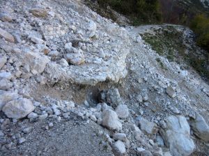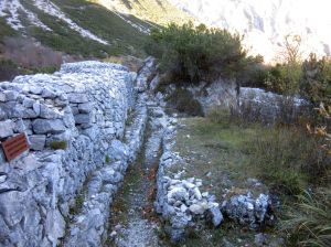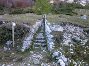 Questo sentiero rimane uno dei più interessanti anche se poco panoramico ma che regala un idea di come era sviluppata la vita montana , l’equilibrio di questo terreno è molto delicato , la zona è interessata dalla notevole ed instabile frana del Rotolon dove tra le rocce rossastre sgorga la sorgente del torrente Agno. Si ricordano in maniera particolare la frana del 1789 dove pare che il boato fosse stato udito anche a Vicenza mentre sono più recenti, ma altrettanto ingenti, quei movimenti del 1985 e dell’autunno del 2010, hanno sempre tenuto con il fiato sospeso questa cittadina , rimanendo così osservato speciale anche tuttora, tali da dover spostare leggermente alcuni tratti del sentiero. Il Rotolon é un strato di calcare e gesso, definito lubrificante tettonico , che a causa di questa composizione rende instabile il sito e riassume tutte le spiegazioni per i movimenti franosi. Si imbocca il sentiero più ripido di destra e si sale con discreta pendenza , il sentiero sale a zig zag fino a raggiungere i primi muretti a secco, per poi entrare nella zona più importante, caratterizzata dalla zona di estrazione delle Mole , queste antiche ruote utilizzate come macine nei mulini e per le ruote di affilatura lame e coltelli. Si continua salire fino a raggiungere un bivio che porta nell’antica cava di Mole ed eventualmente nella strada provinciale , ritornando poi dallo stesso per continuare la risalita verso il Passo delle buse scure 1475 m. ritrovando così ancora qualche Mola non ancora ricavata dal masso originale , è sempre rimasto un mistero di come venissero tolte dalla roccia e trasportate in strada. Si continua a salire superando i resti della Malga Buse Scure e raggiungendo così il passo omonimo , mantenendo la destra e continuando il 144 si entrerà nella parte dell’Anello storico fino a raggiungere un punto di arrivo della Teleferica di guerra e così anche il rifugio Giuriolo di Campogrosso a quota 1456 m.