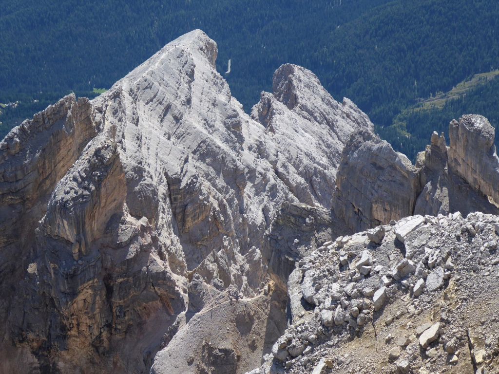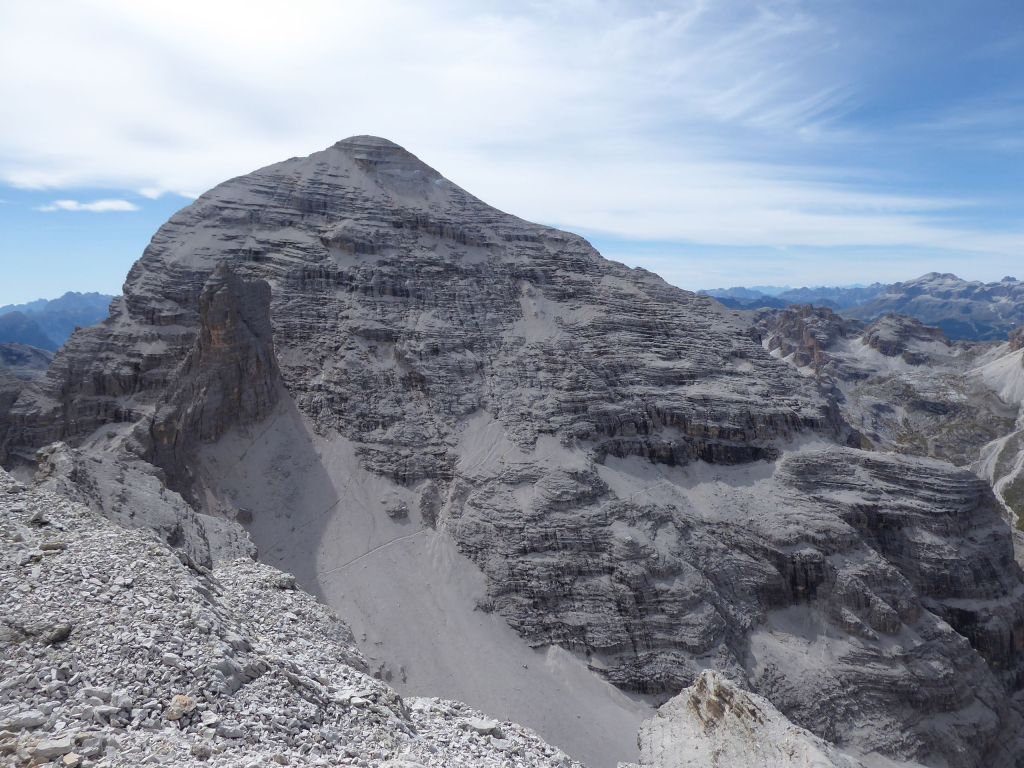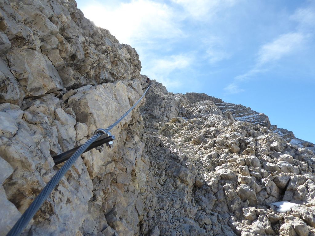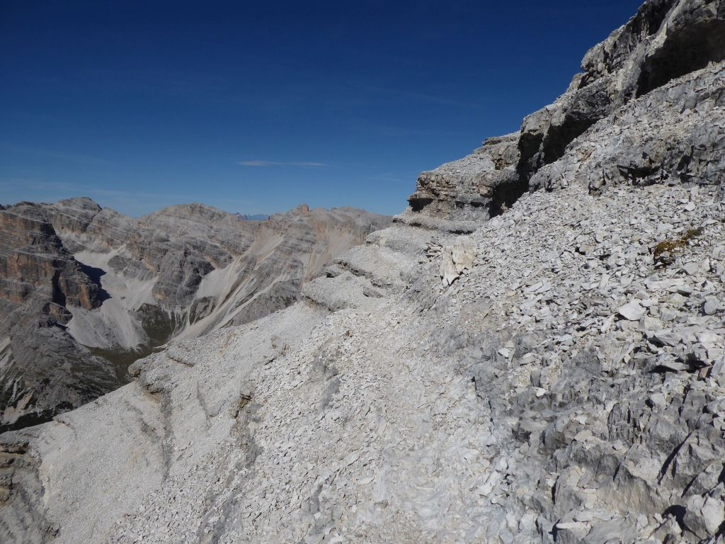 Questa via è l’unica che permette di salire sulla Tofana di Mezzo 3244 m e sulla Tofana di Dentro 3238 m senza vie attrezzate a parte l’ultimi tratti in cui la corda fa quasi da corrimano , ci sarebbe quello che sale da Capannina Ra Vales sul rovescio della Tofana di Dentro ma risulta lunga e si attraversano tutte le Tofane per poterci salire , tornando al percorso , il punto di partenza rimane il rifugio Dibona 2037 m , salita molto semplice e panoramica verso il Rifugio Giussani 2600 m , proprio li ai piedi delle Tofane con una visione verso i Lastoi del Formin , Croda da Lago , Averau , Nuvolau , mentre sullo sfondo sopra Cortina l’imponente Sorapiss e sua maestà l’Antelao , raggiunta Forcella Fontananegra sulla destra del rifugio Giussani si sale su un ghiaione impervio fino a raggiungere la forcella che si raggira a sinistra una cengia in cui si nota una postazione di Guerra su di un passaggio con roccette raggiungendo Punta Giovannina raggirato l’ostacolo si entra nel primo avallamento dove il sentiero si fa stretto ed in cui si deve prestare molta attenzione , si effettua un semicerchio in un scenario incredibile fino a Forcella Vallon dove il percorso rientra di nuovo per compiere un altro semicerchio di incredibile bellezza dove si può ammirare sullo sfondo in basso la val Travenànzes e in alto il Lagazuoi . Si prosegue con un piccolo tratto in salita che ci porterà sul laghetto e su quel che rimane del ghiacciaio , l’ultimo tratto che poi entrerà nella ferrata del Formenton risulta un pò ripido e detritico , ma tenendosi lateralmente si sale su rocce solide ,ancora circa 25 minuti di salita attrezzata anche se con molti gradoni si raggiunge la vetta della Tofana di Mezzo 3244 m , mentre leggermente più in basso si nota l’arrivo della Funivia da Capannina Ra Vales e dove esiste un piccolo Bar.